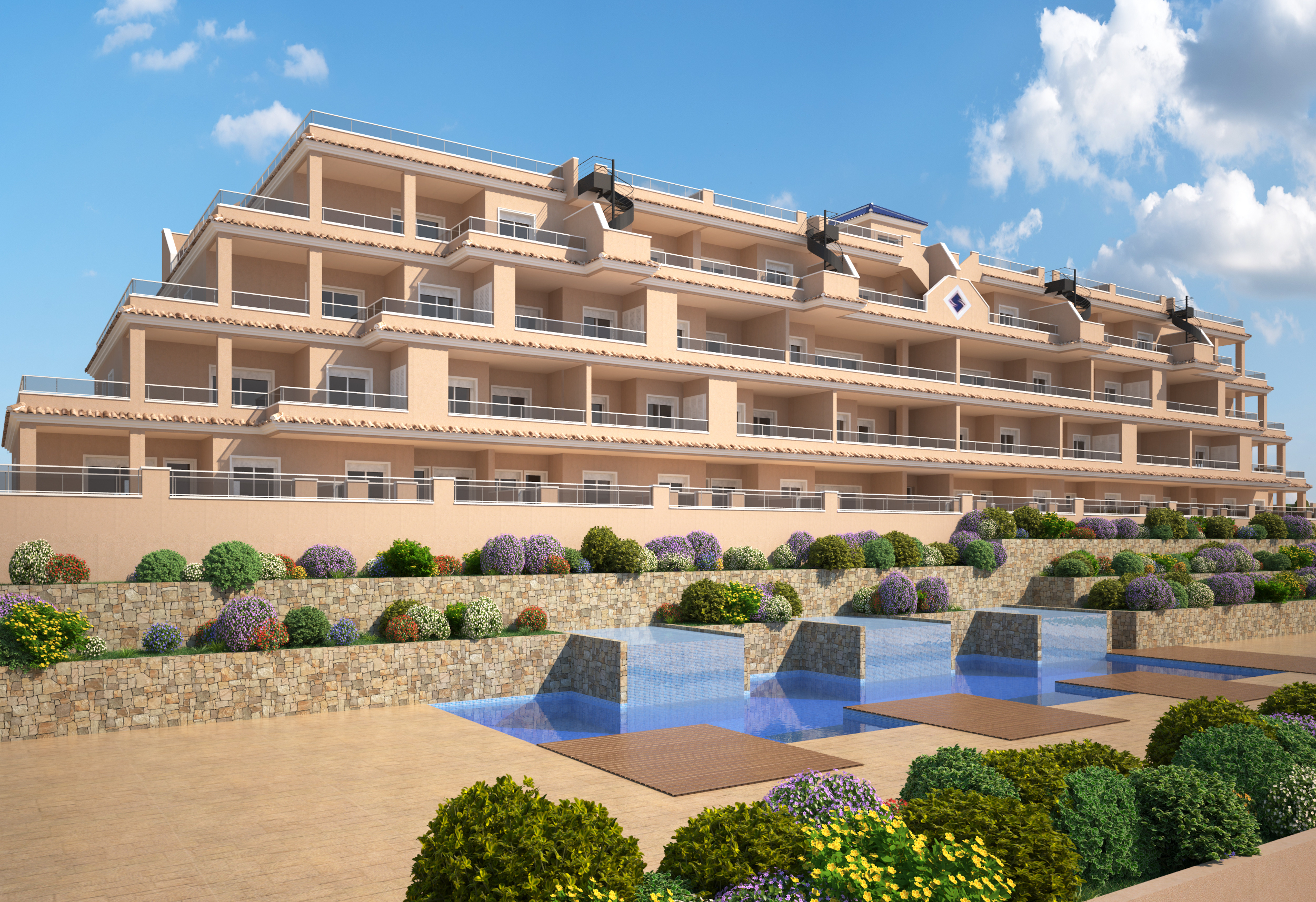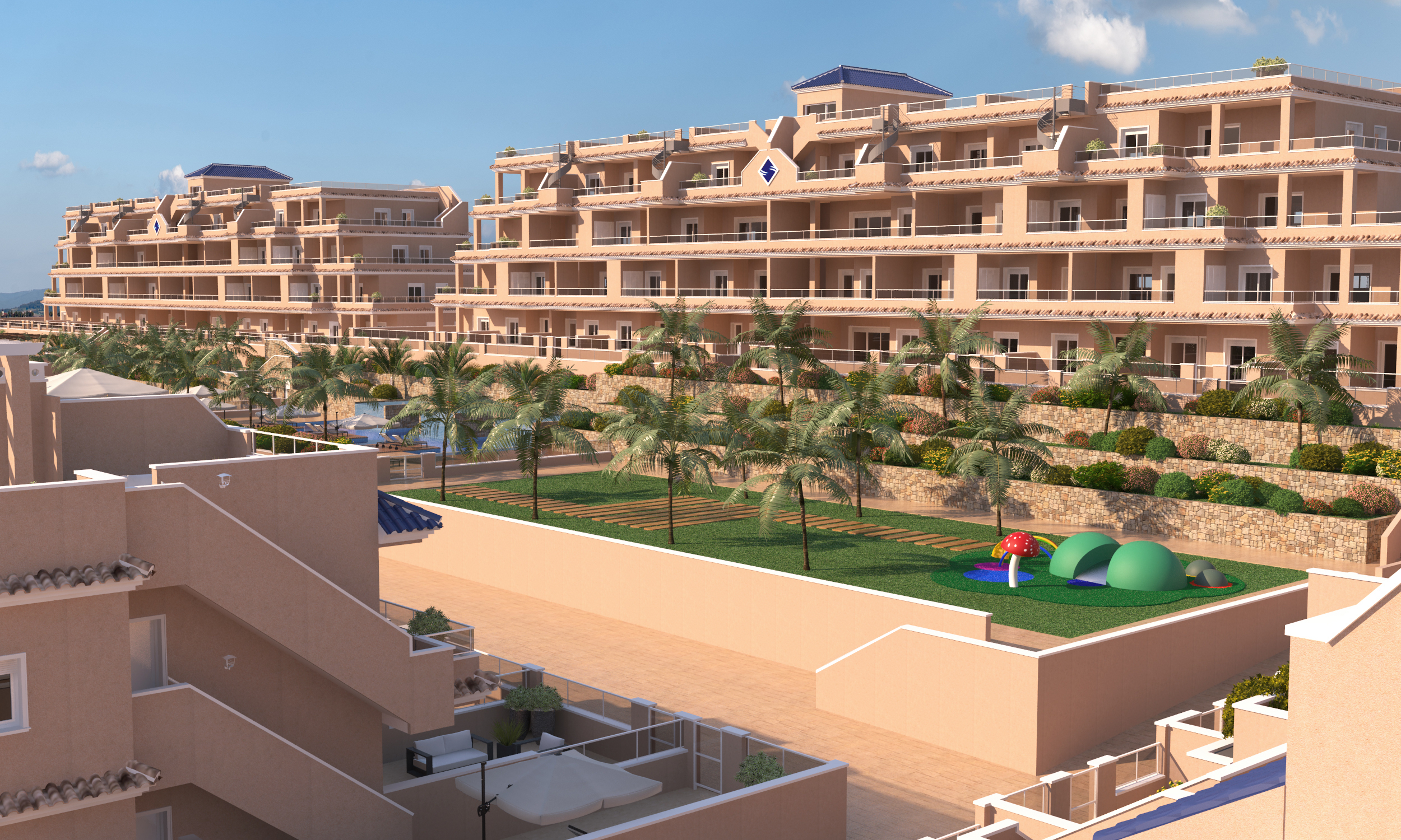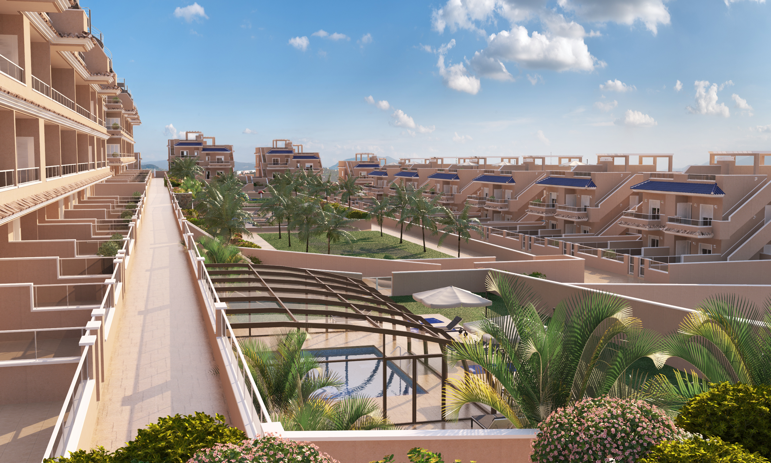 - 56 Lejligheder med 2 eller 3 soveværelser og 2 badeværelser med store terrasser.