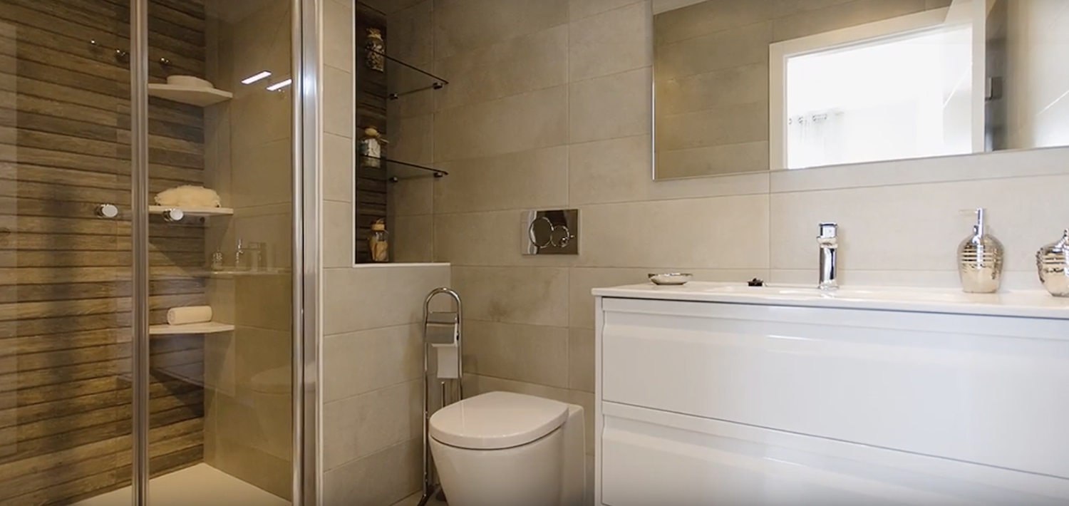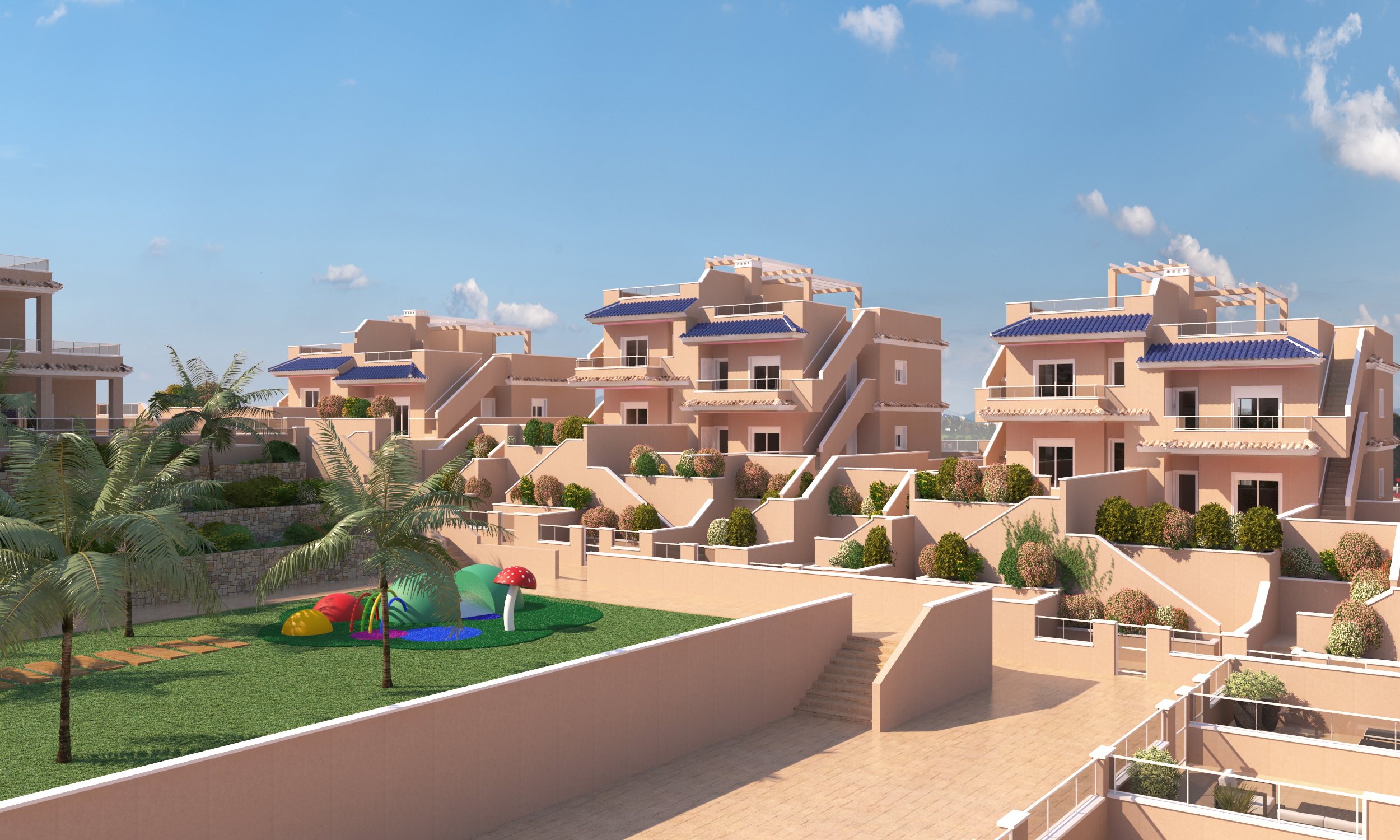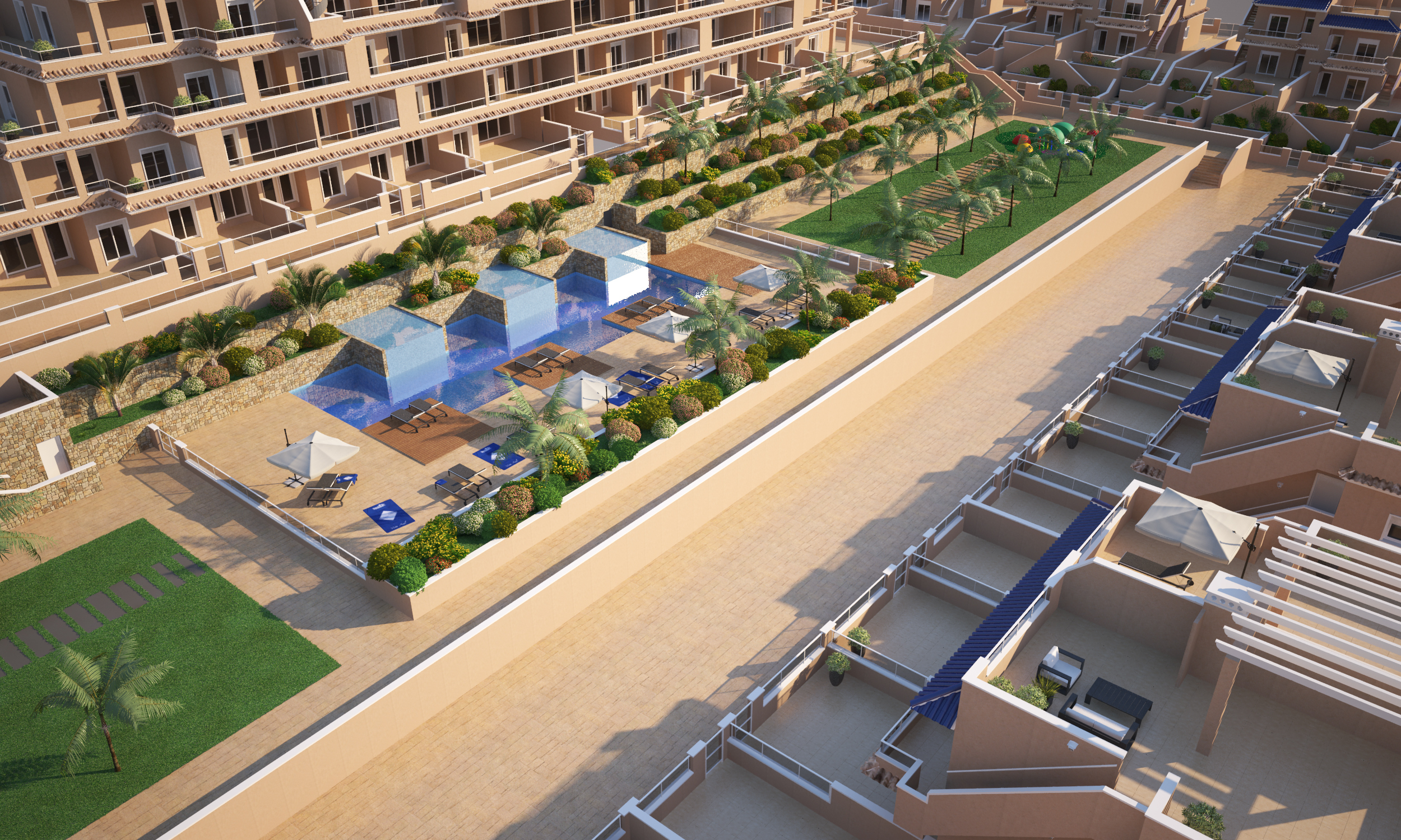 - 56 Lejligheder med 2 eller 3 soveværelser og 2 badeværelser med store terrasser.