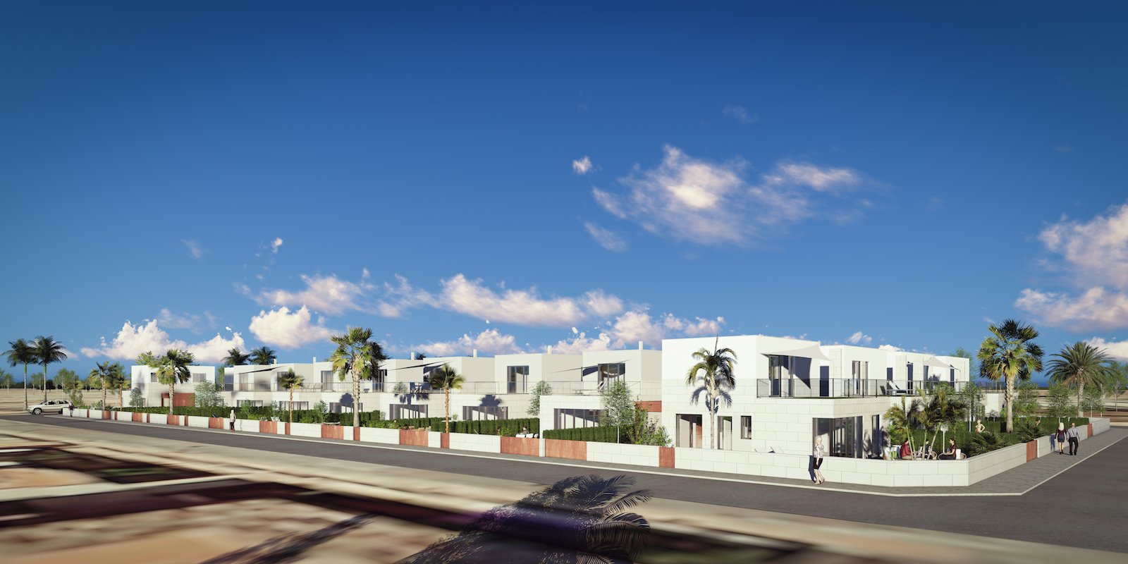 Kompleks af 22 fritliggende villaer i Los Alcázares, Costa Calida. Beliggende i et roligt område nær La Serena Golfbane, meget tæt på stranden, sportsfaciliteterne og byens centrum med alle de nødvendige tjenester og faciliteter.