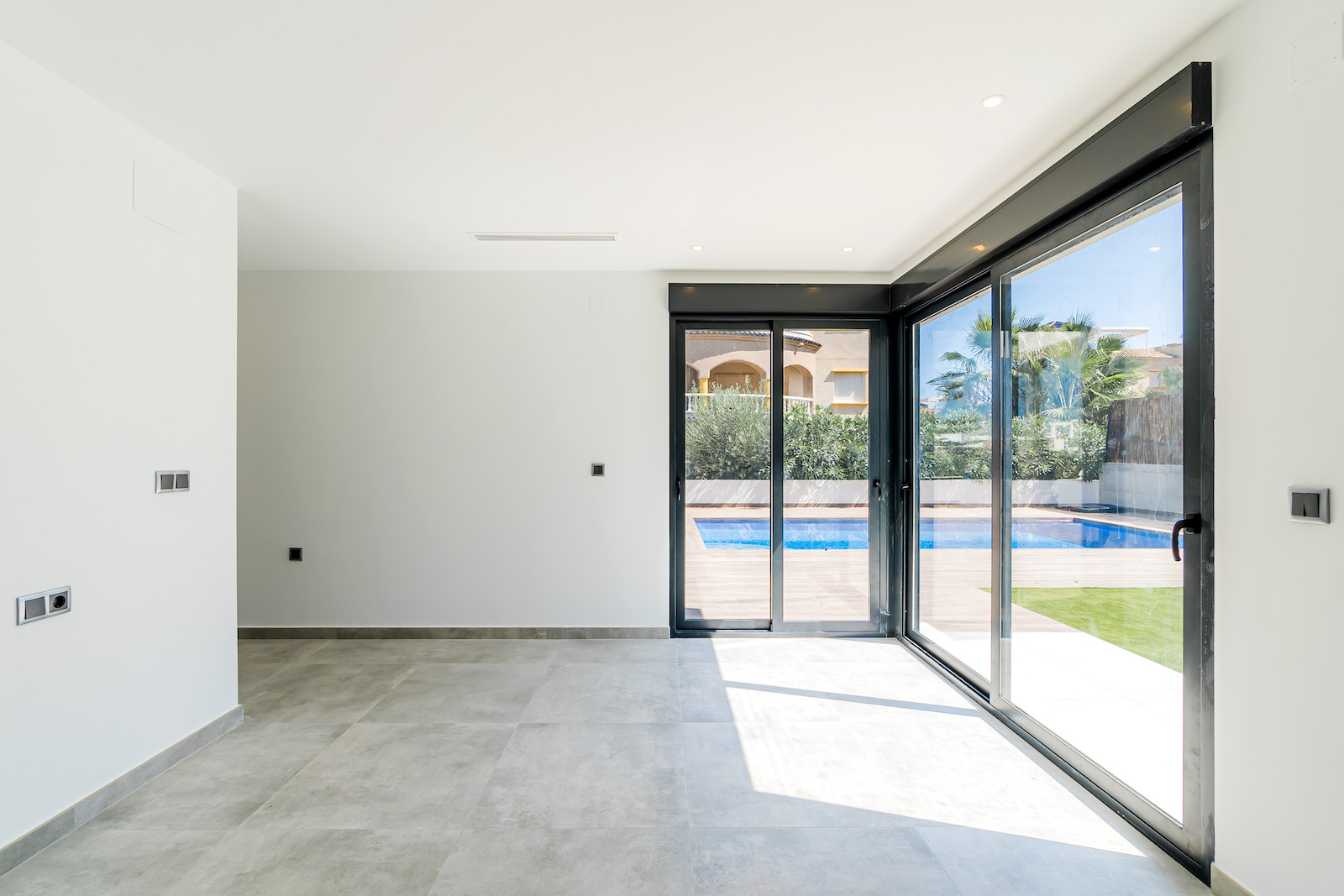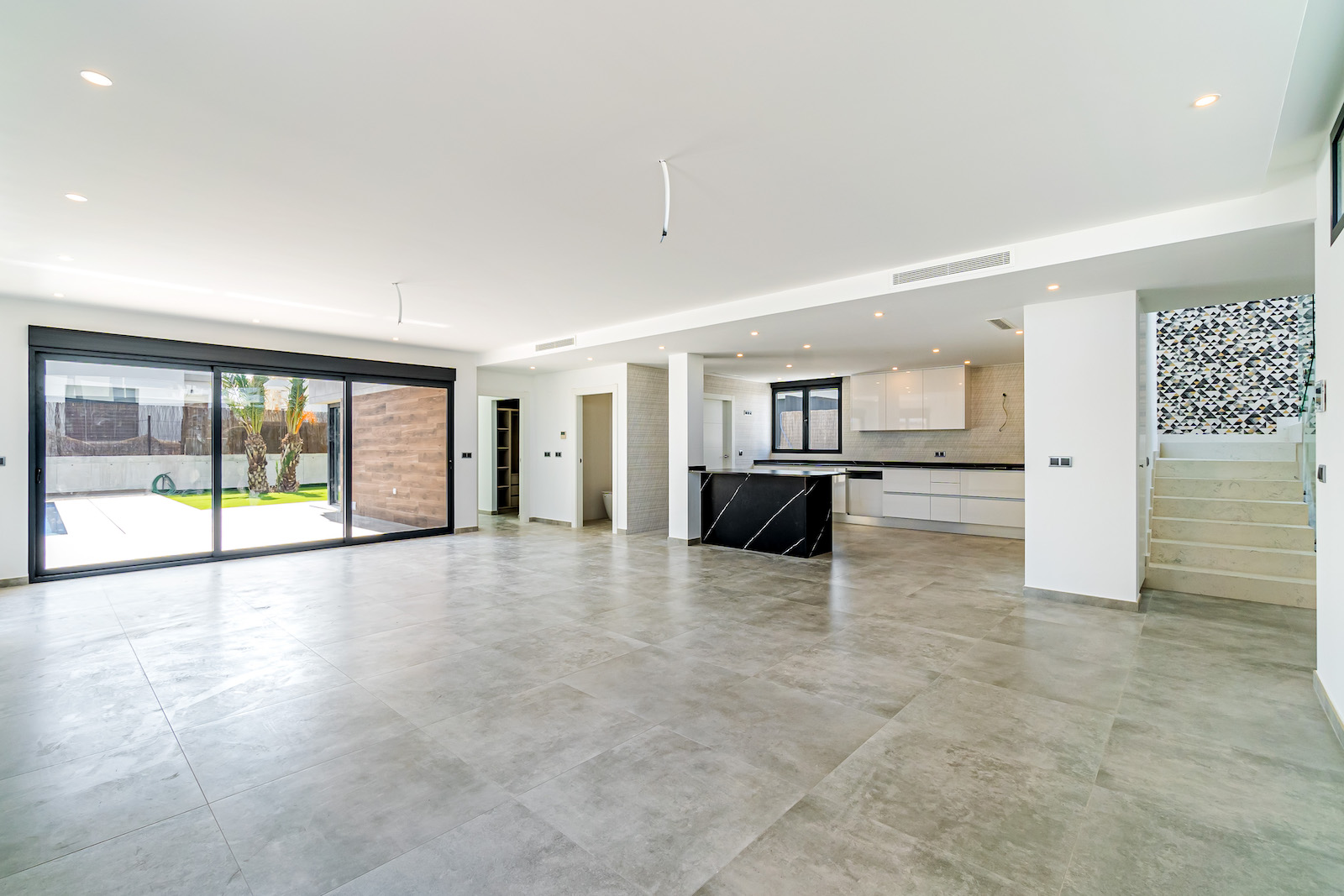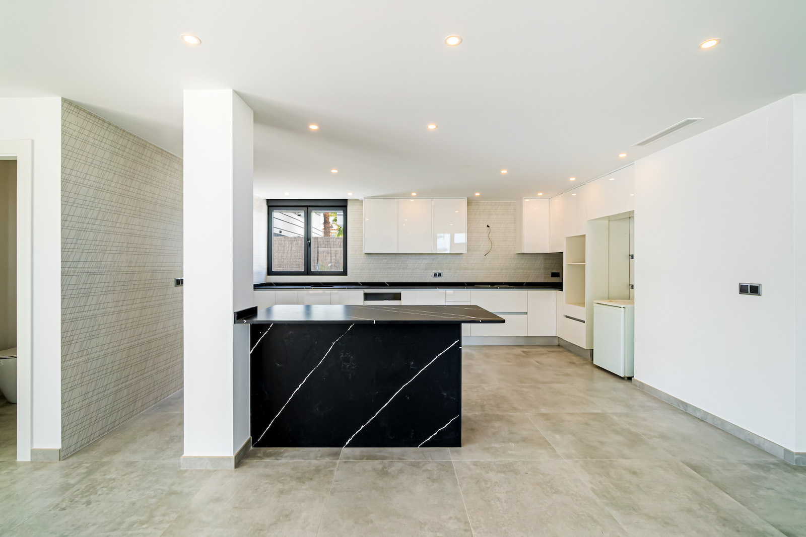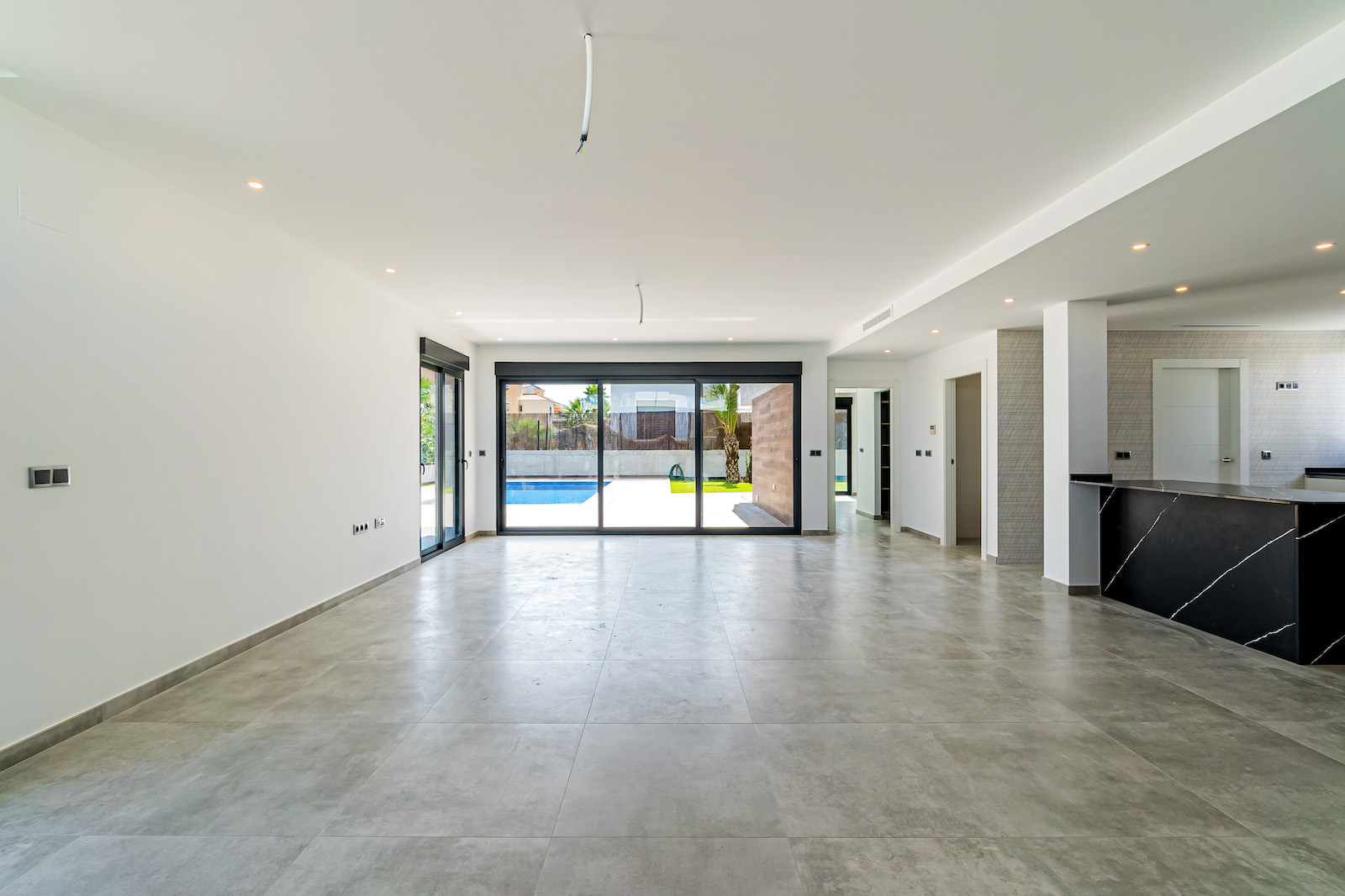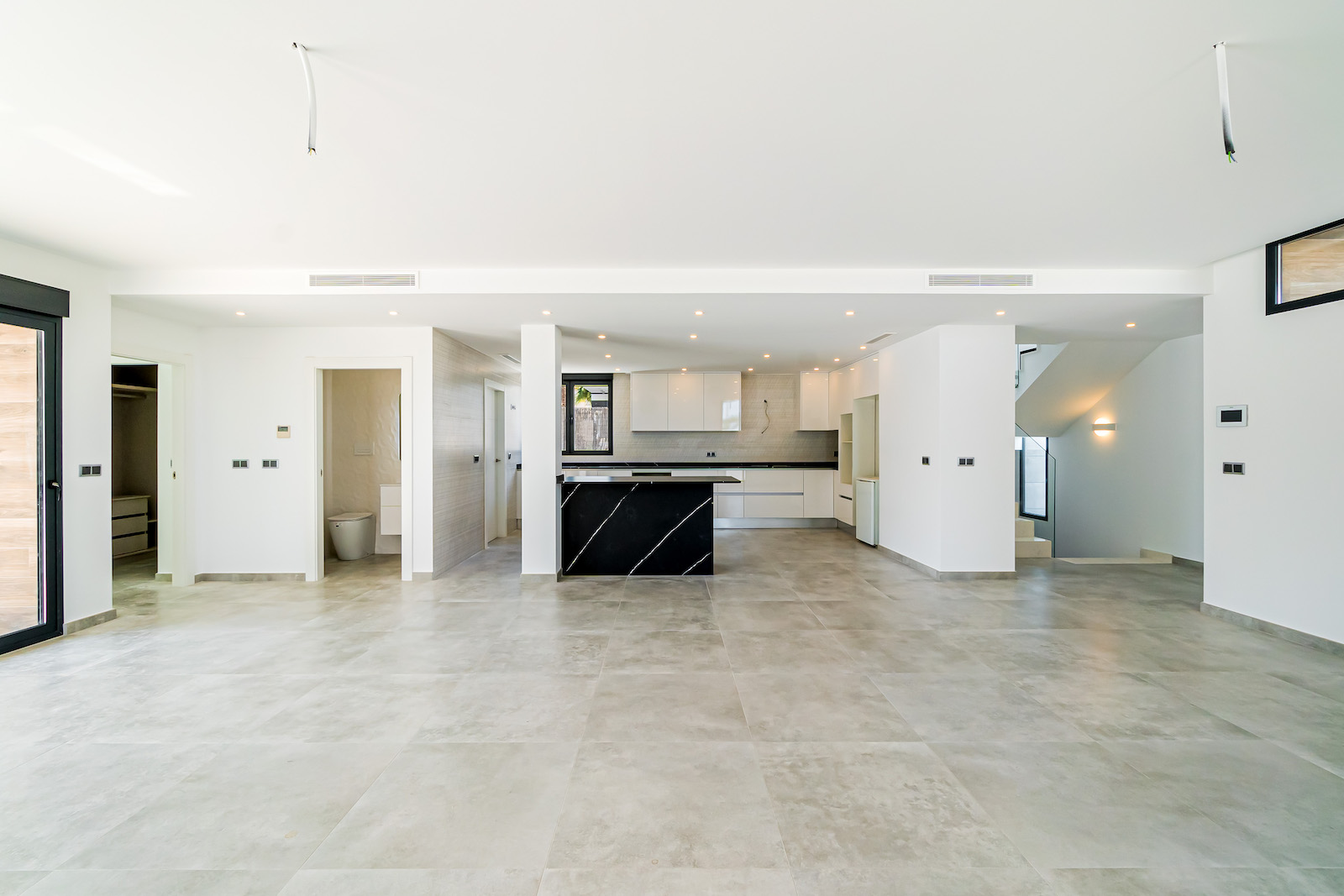 Stueetage: Ultramoderne stue med køkken, 1 toilet, 1 soveværelse med påklædningsværelse og eget badeværelse, alt på samme niveau, med direkte adgang til haven og swimmingpoolområdet.