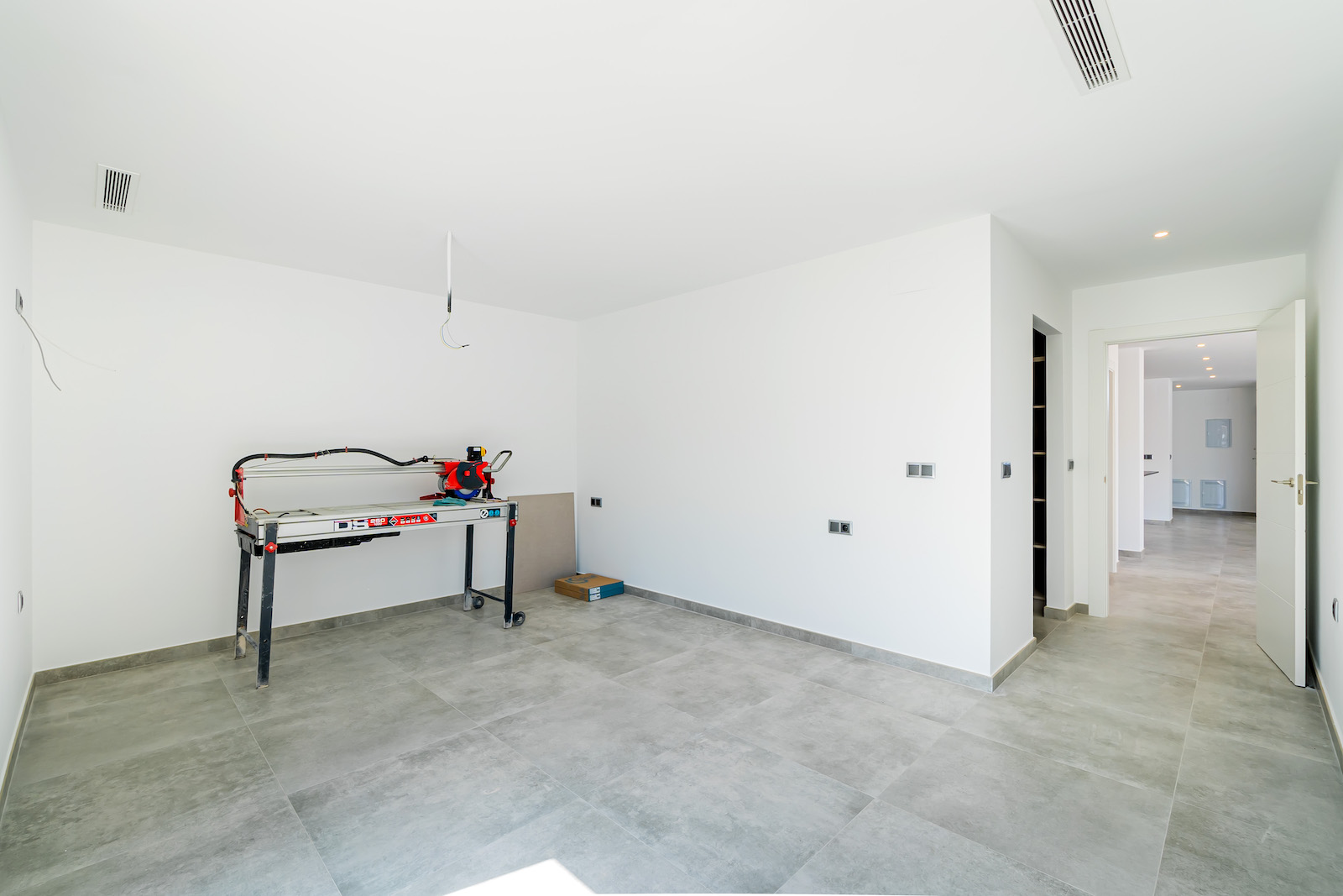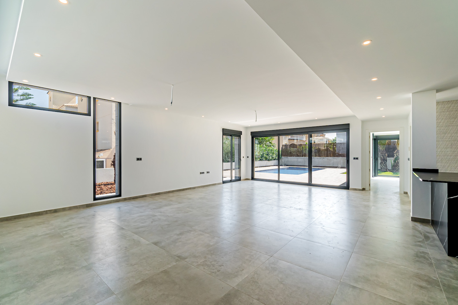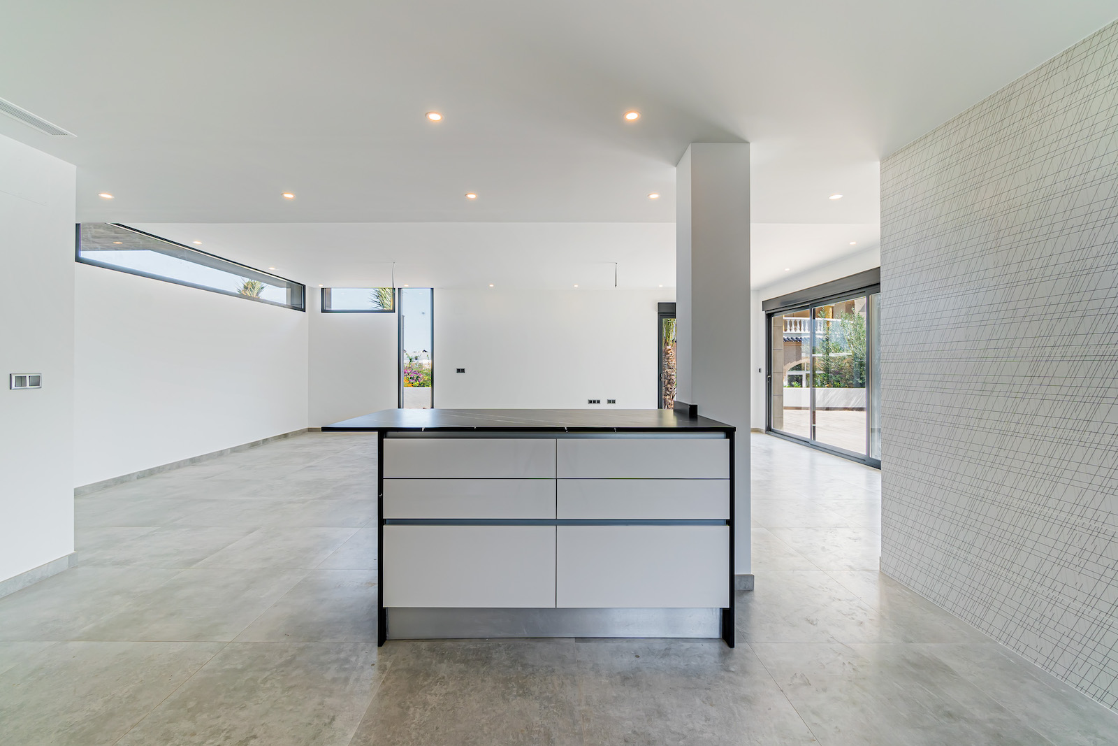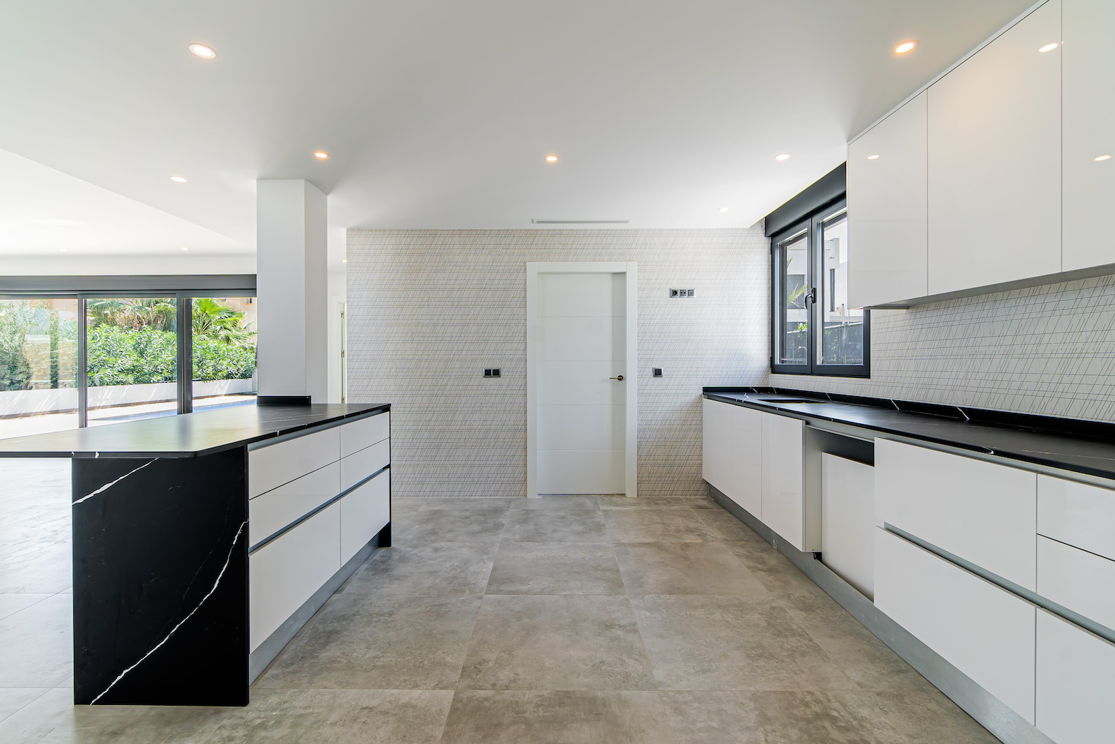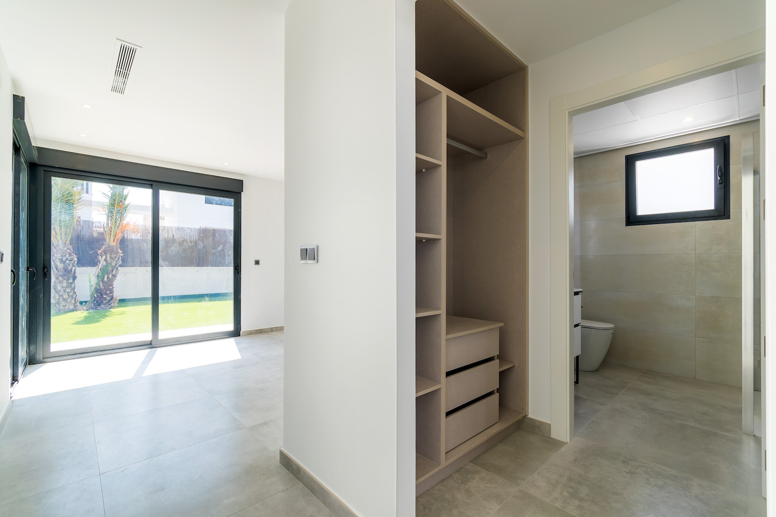 Stueetage: Ultramoderne stue med køkken, 1 toilet, 1 soveværelse med påklædningsværelse og eget badeværelse, alt på samme niveau, med direkte adgang til haven og swimmingpoolområdet.