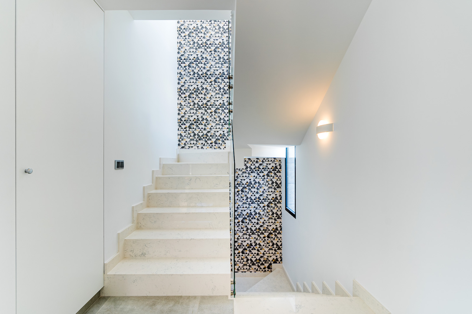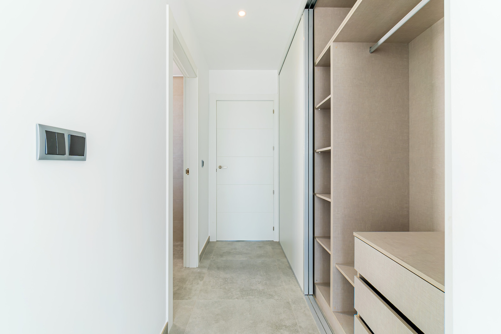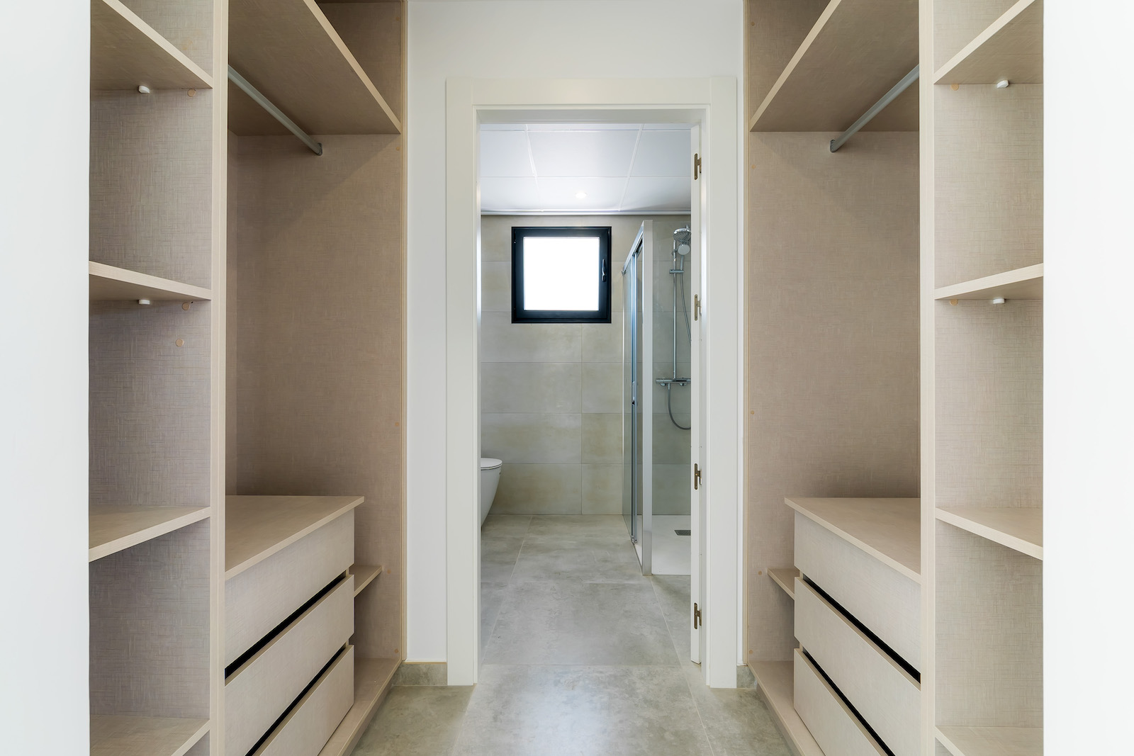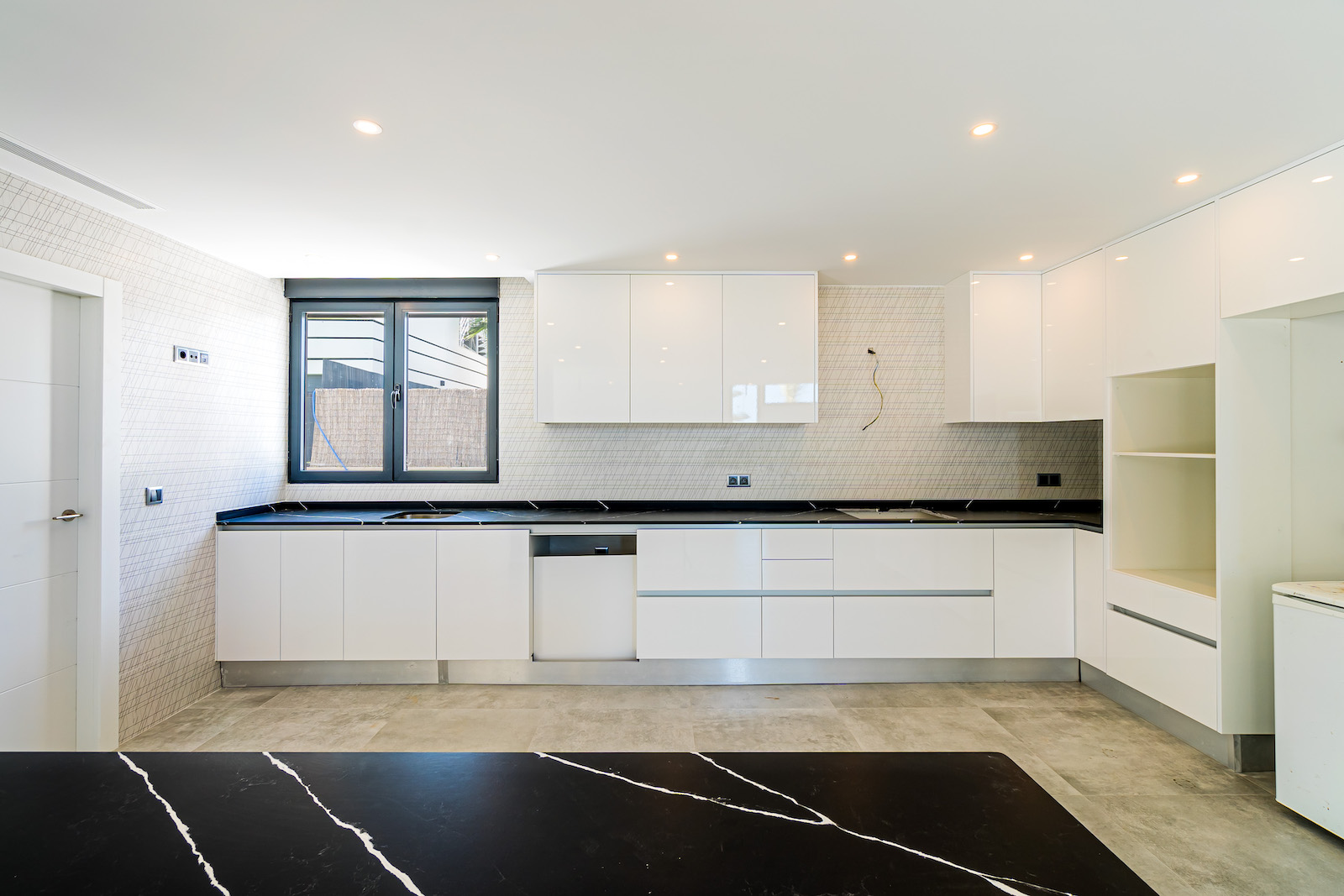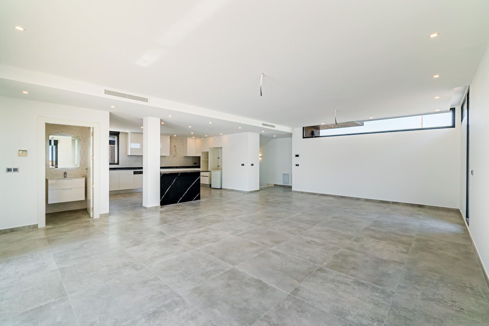 Stueetage: Ultramoderne stue med køkken, 1 toilet, 1 soveværelse med påklædningsværelse og eget badeværelse, alt på samme niveau, med direkte adgang til haven og swimmingpoolområdet.