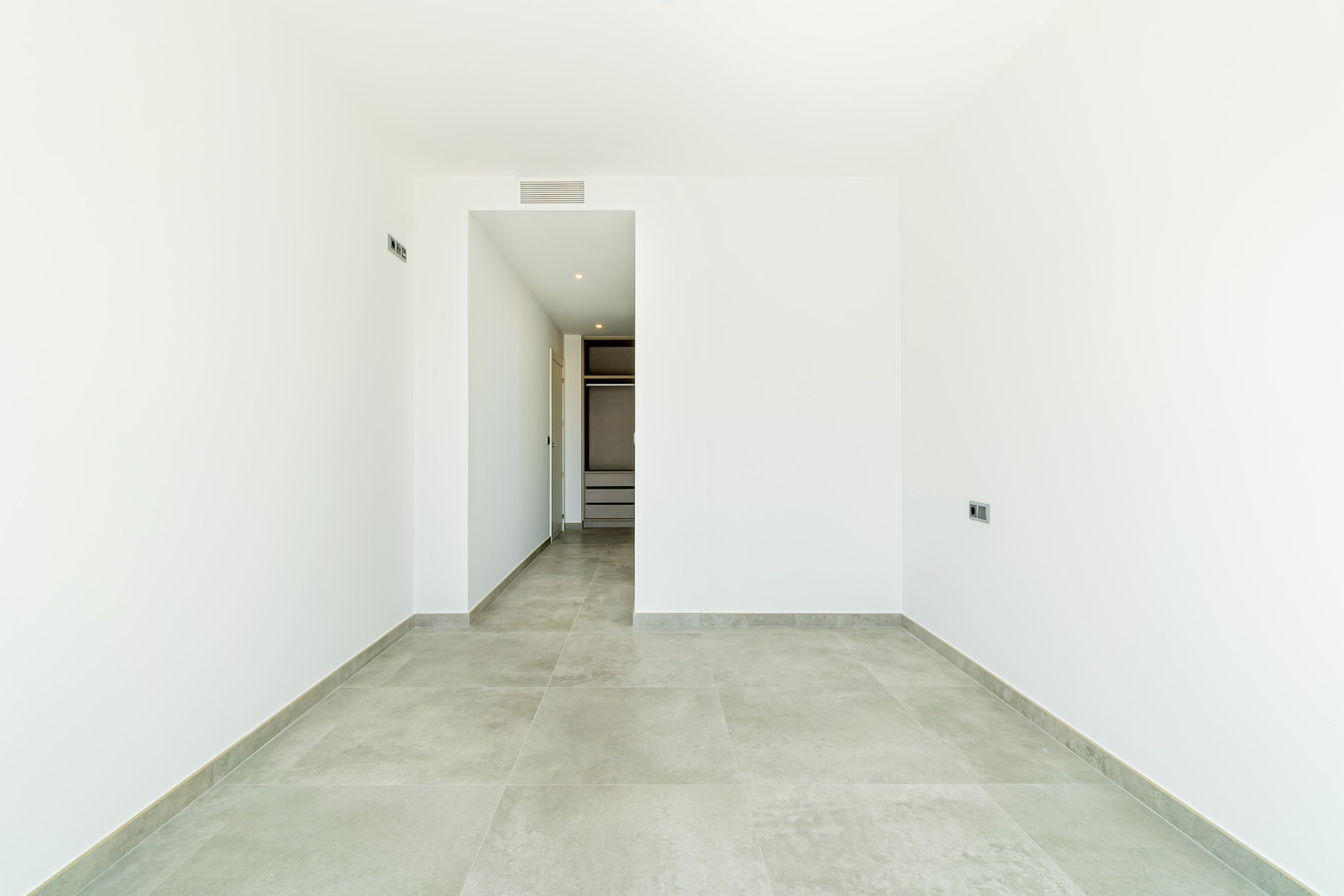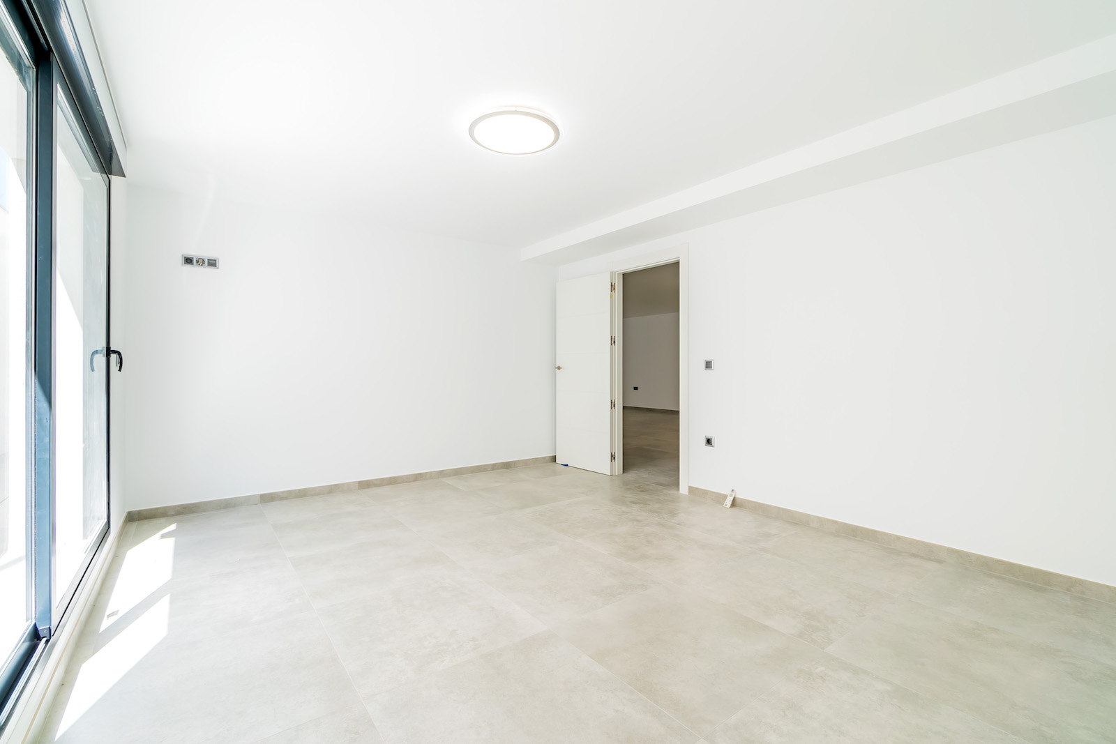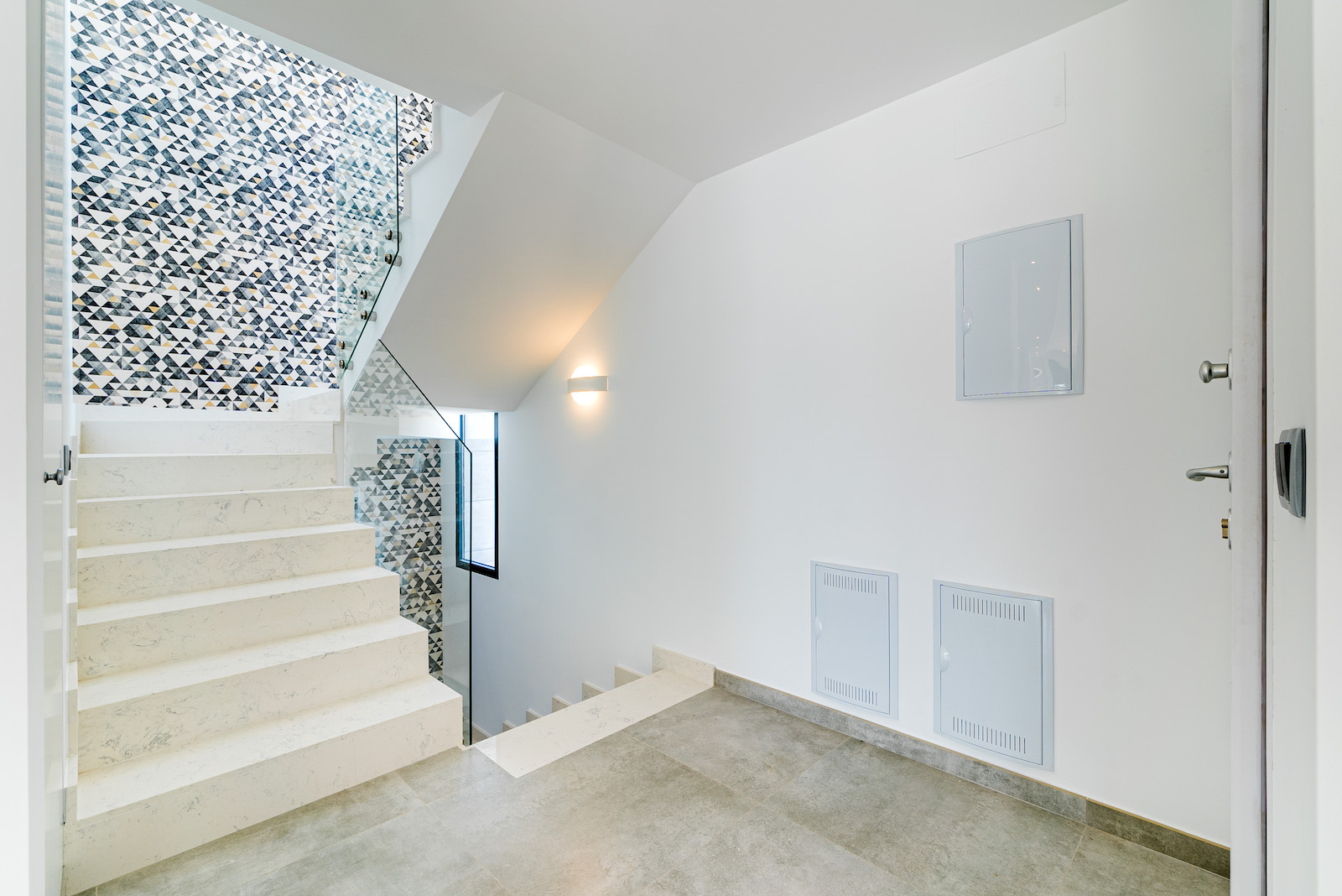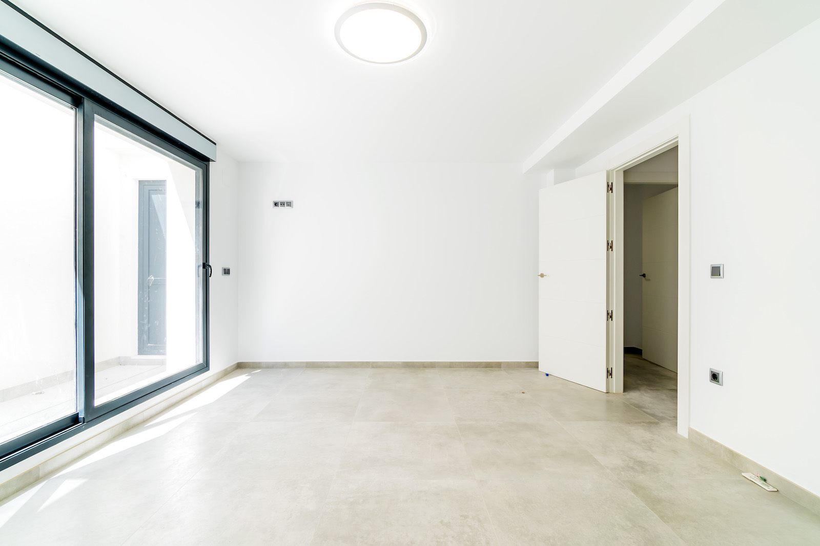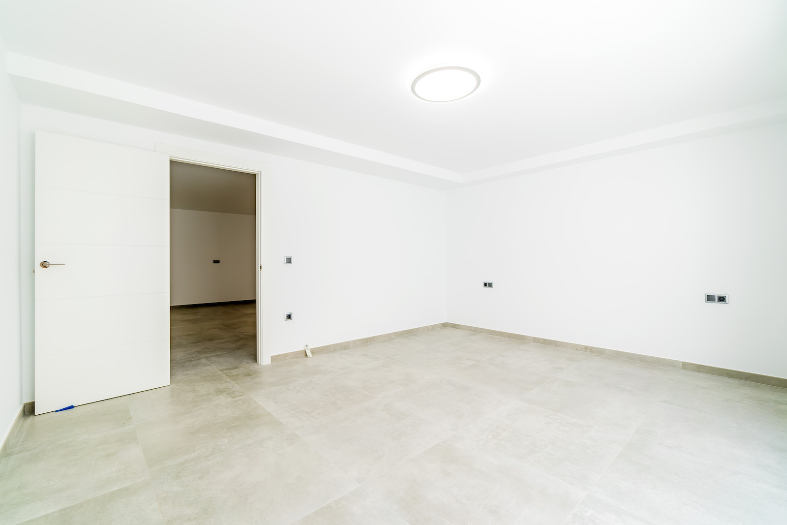 Stueetage: Ultramoderne stue med køkken, 1 toilet, 1 soveværelse med påklædningsværelse og eget badeværelse, alt på samme niveau, med direkte adgang til haven og swimmingpoolområdet.