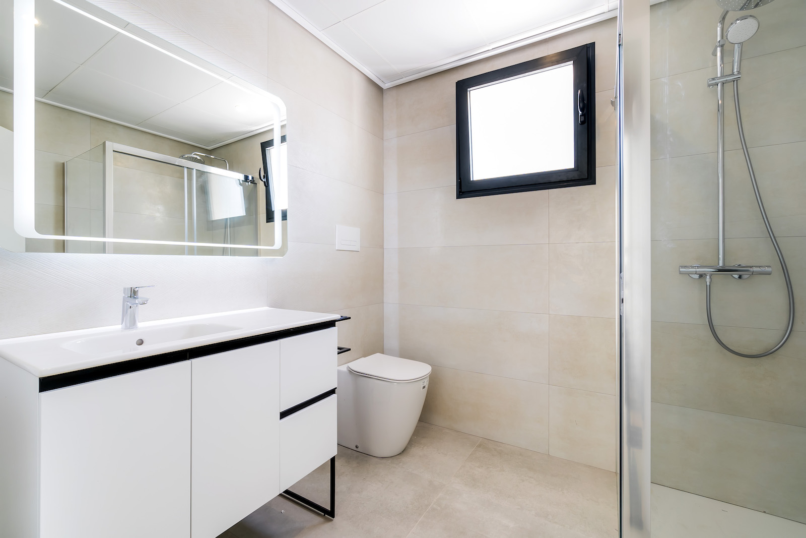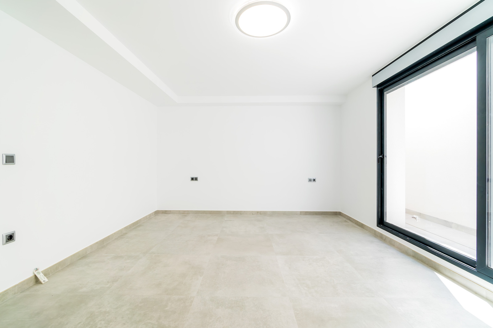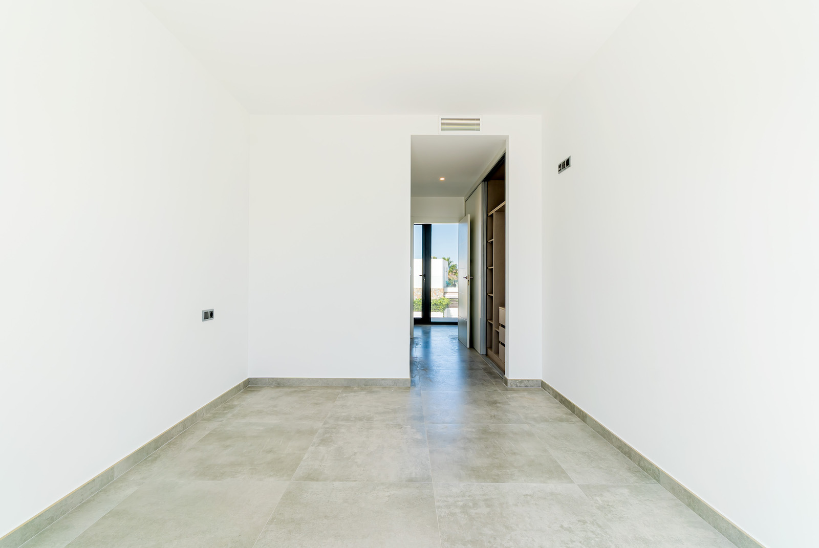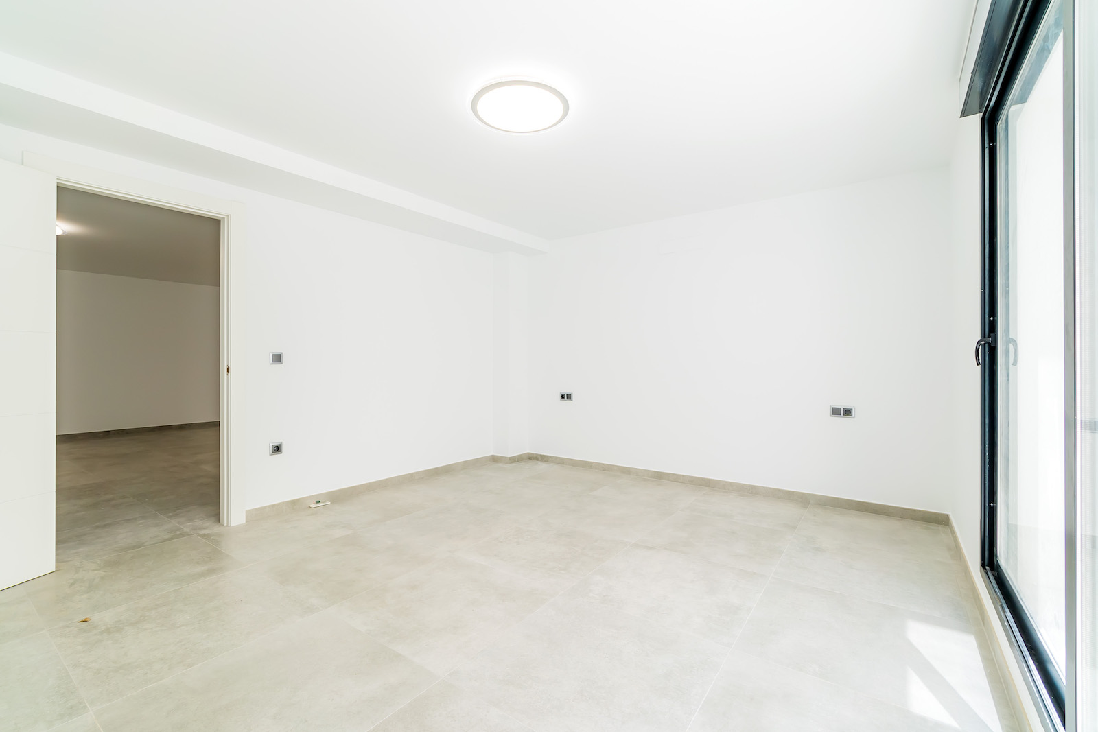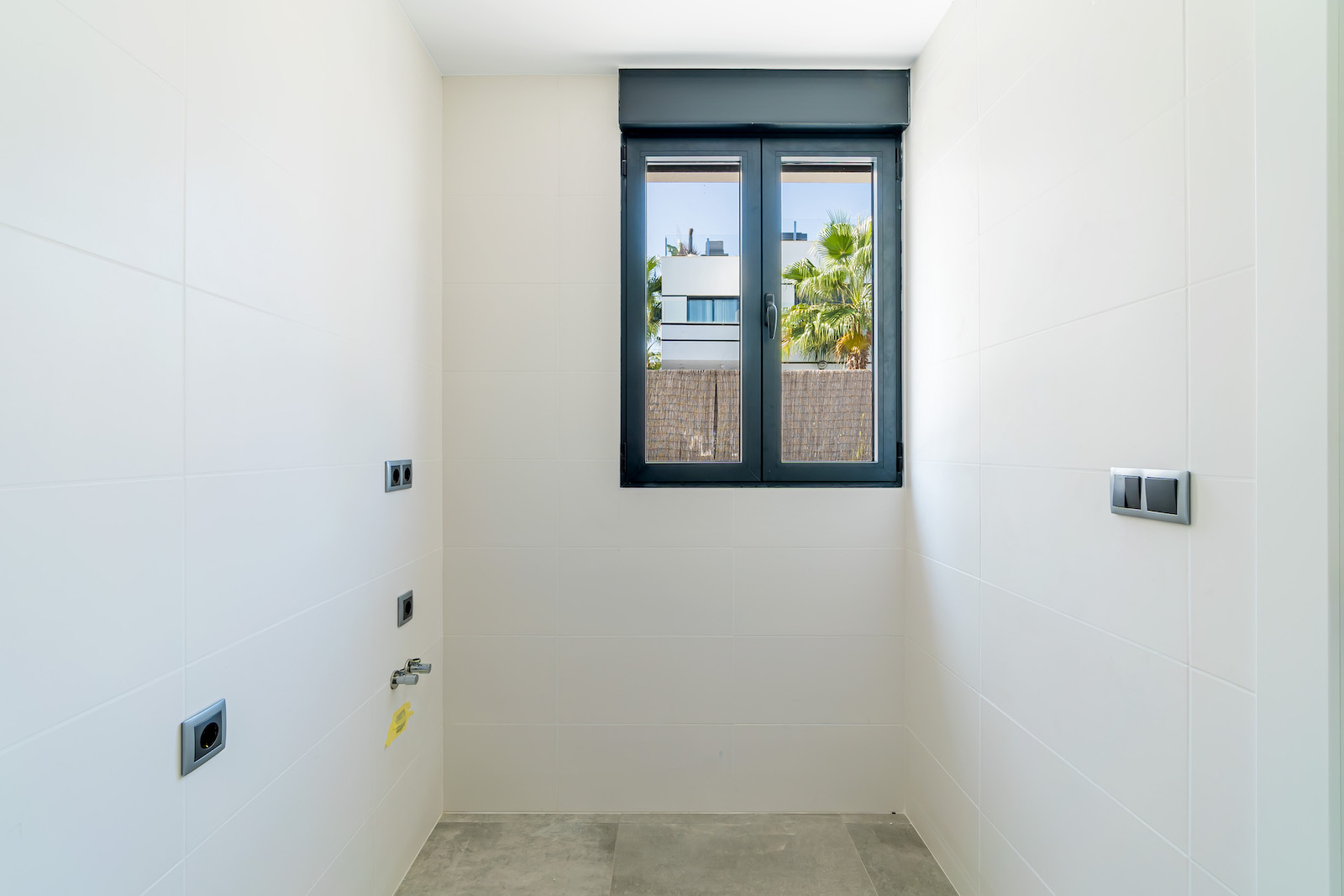 Stueetage: Ultramoderne stue med køkken, 1 toilet, 1 soveværelse med påklædningsværelse og eget badeværelse, alt på samme niveau, med direkte adgang til haven og swimmingpoolområdet.
