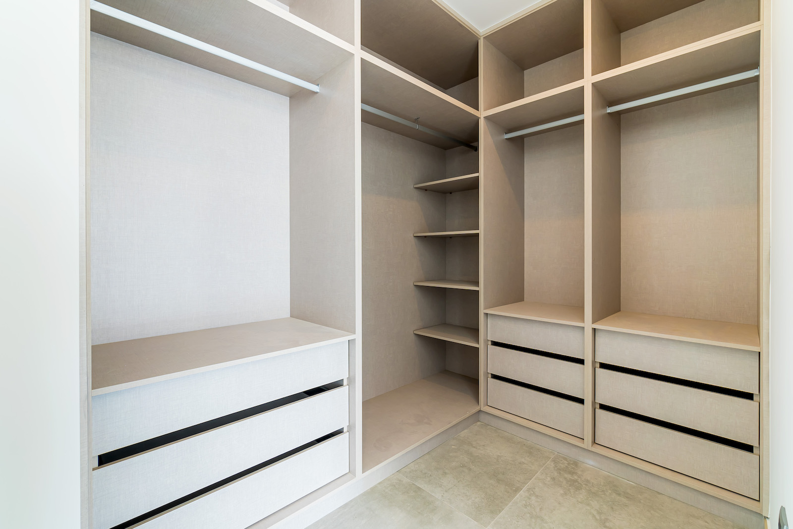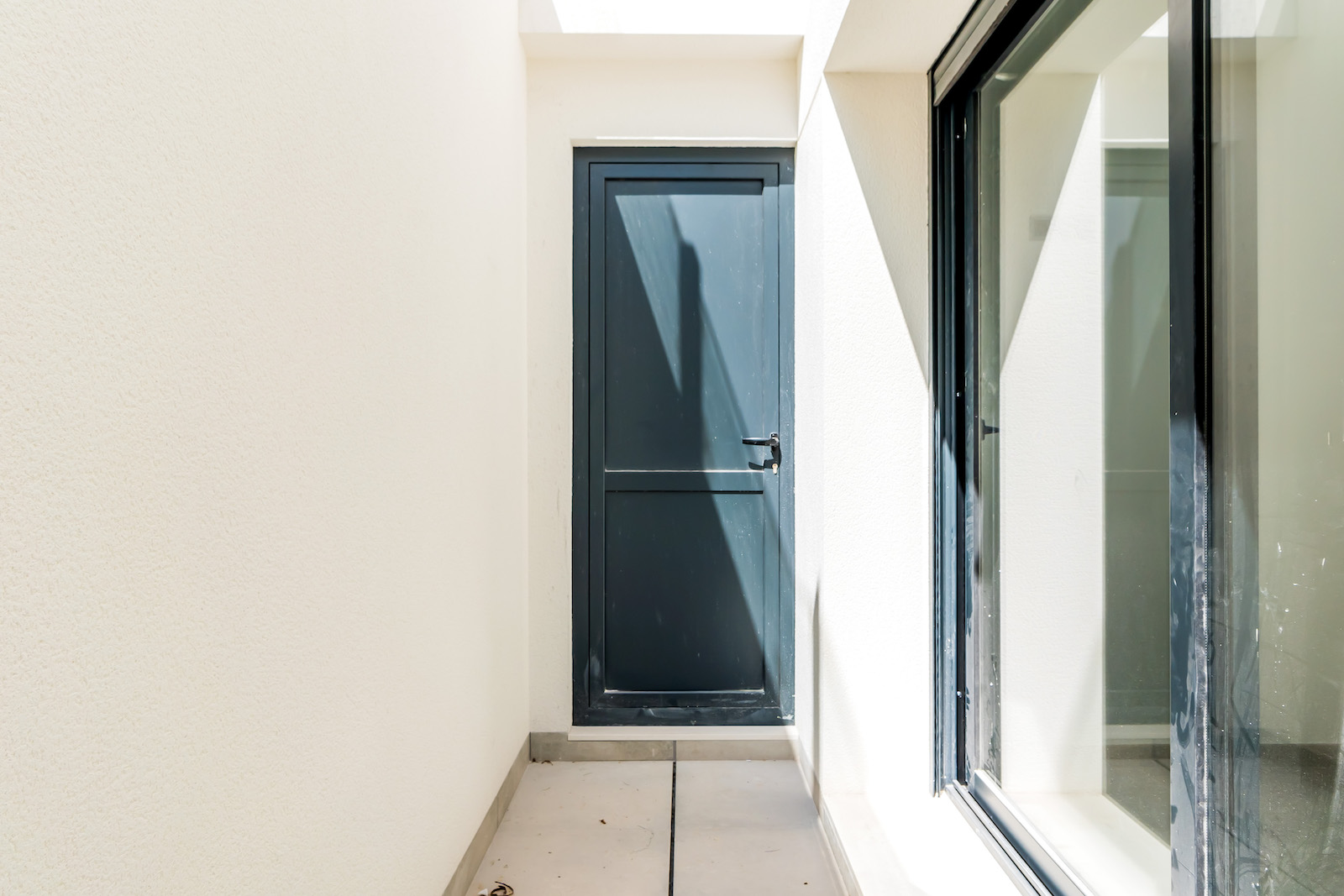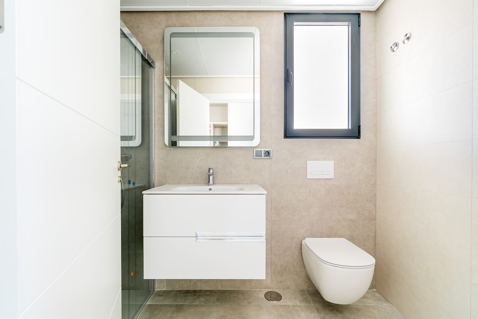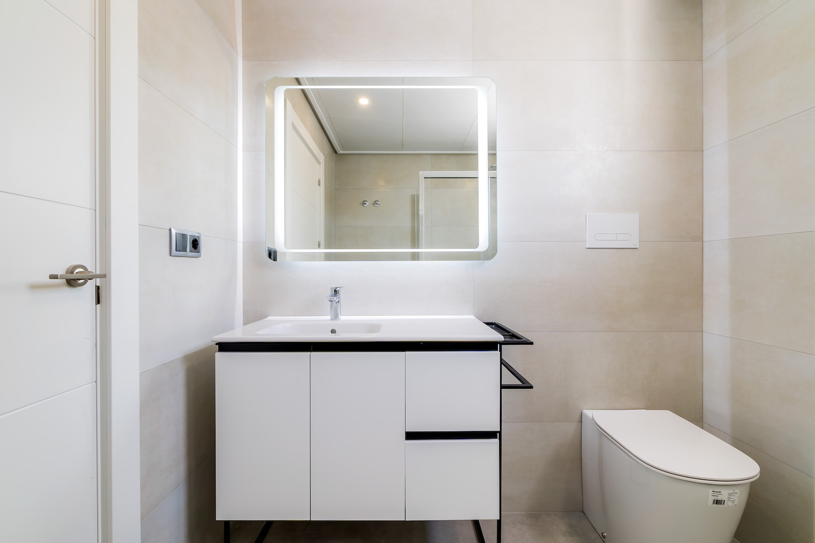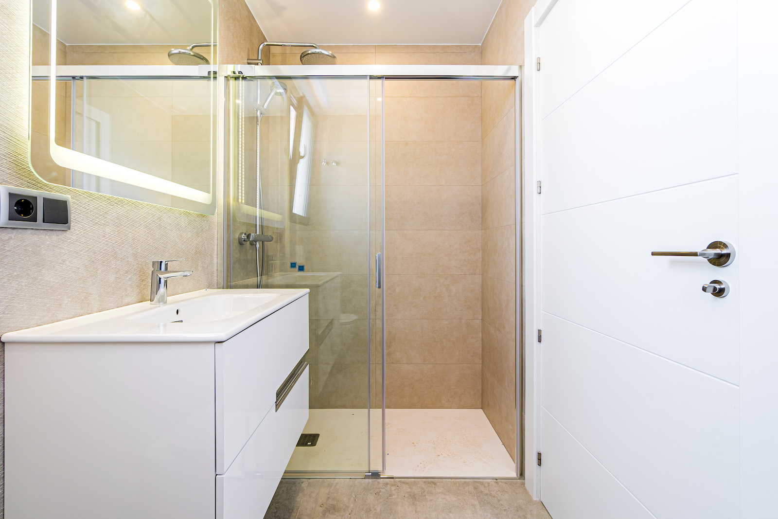 Stueetage: Ultramoderne stue med køkken, 1 toilet, 1 soveværelse med påklædningsværelse og eget badeværelse, alt på samme niveau, med direkte adgang til haven og swimmingpoolområdet.