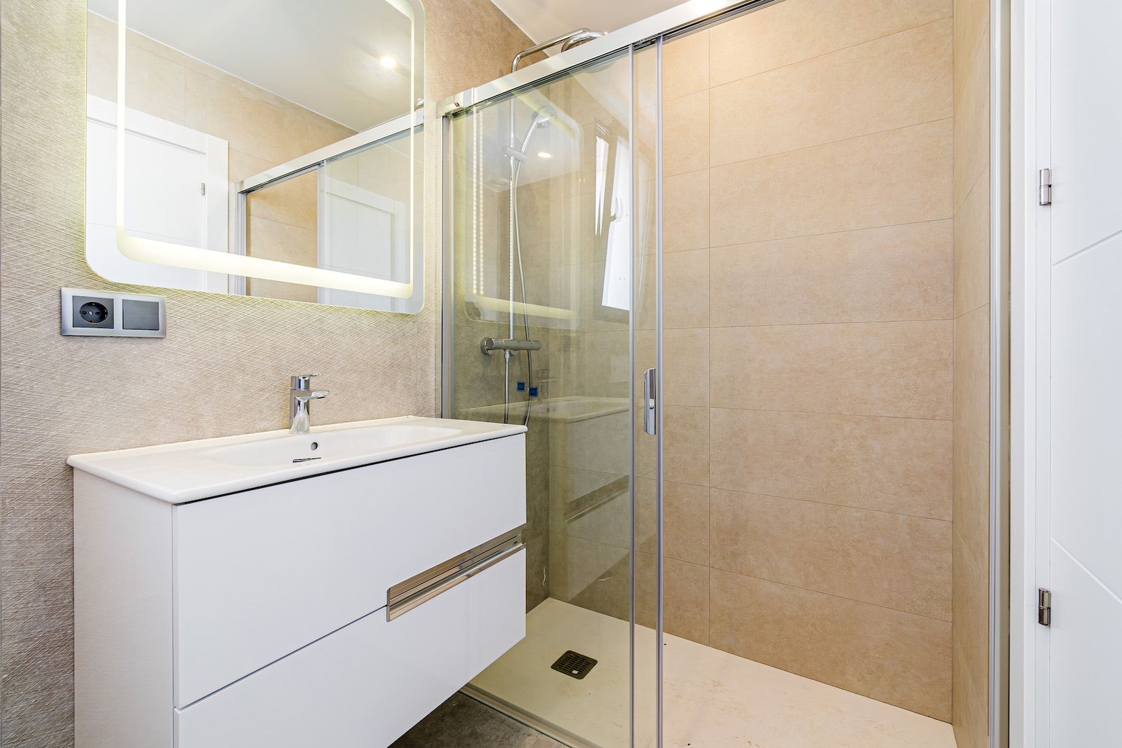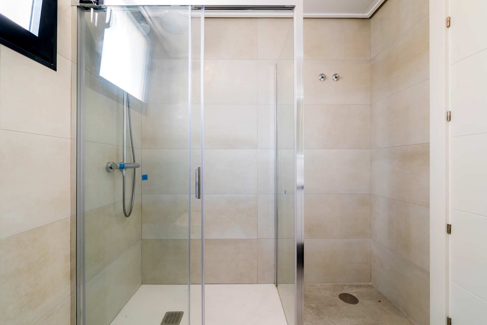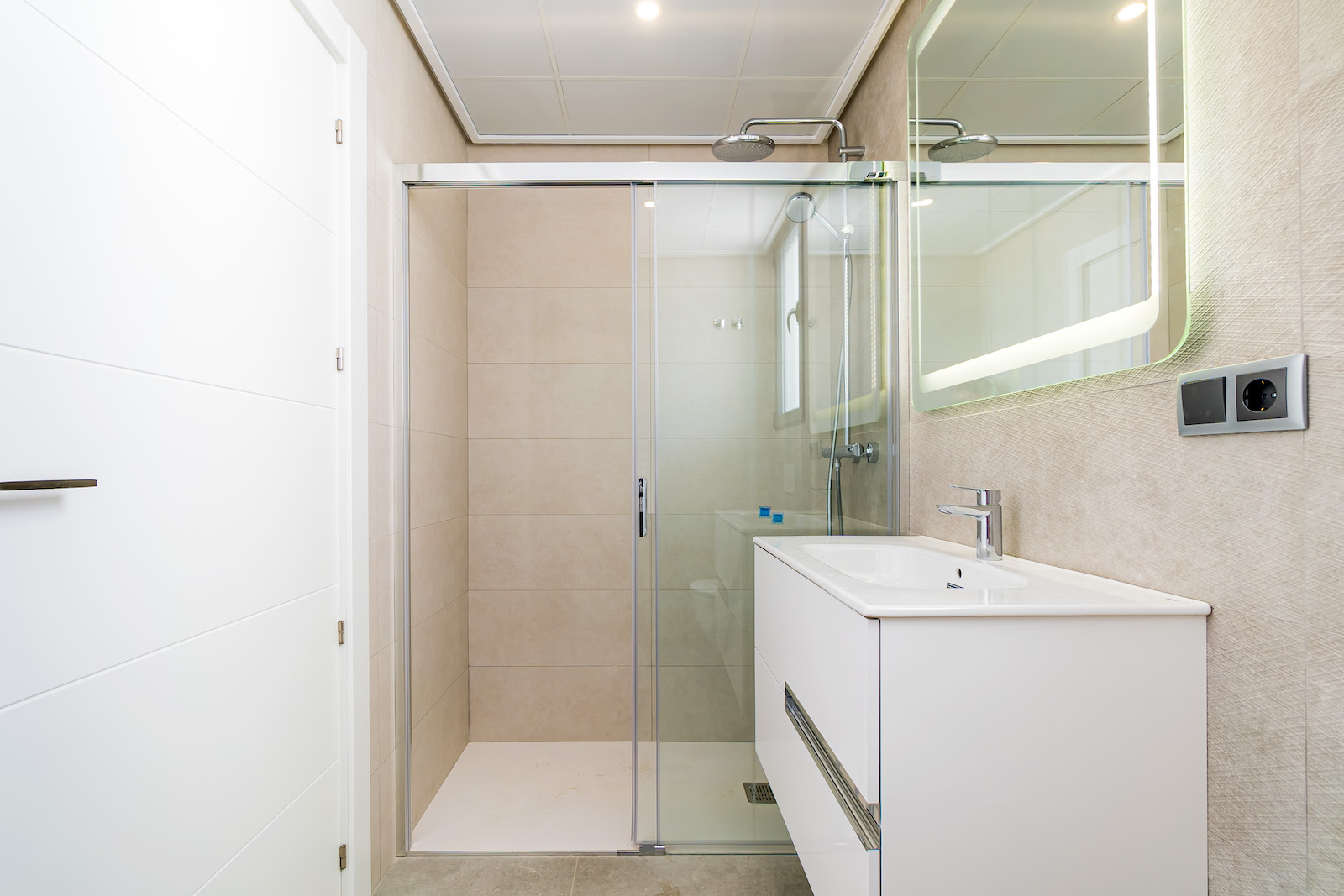 1. sal: 2 soveværelser med dobbeltsenge med 2 badeværelser en suite og 60 kvm terrasse.
