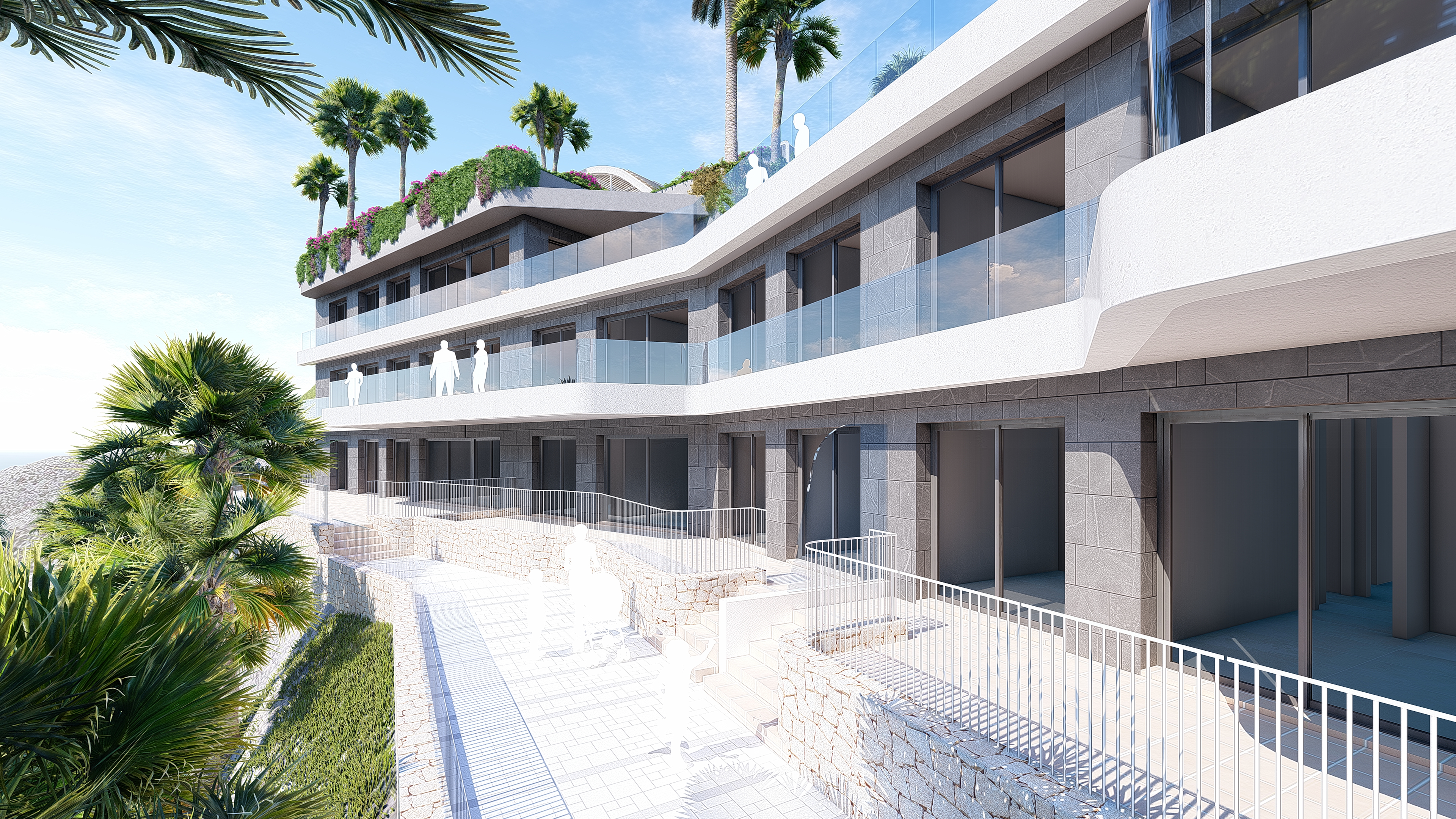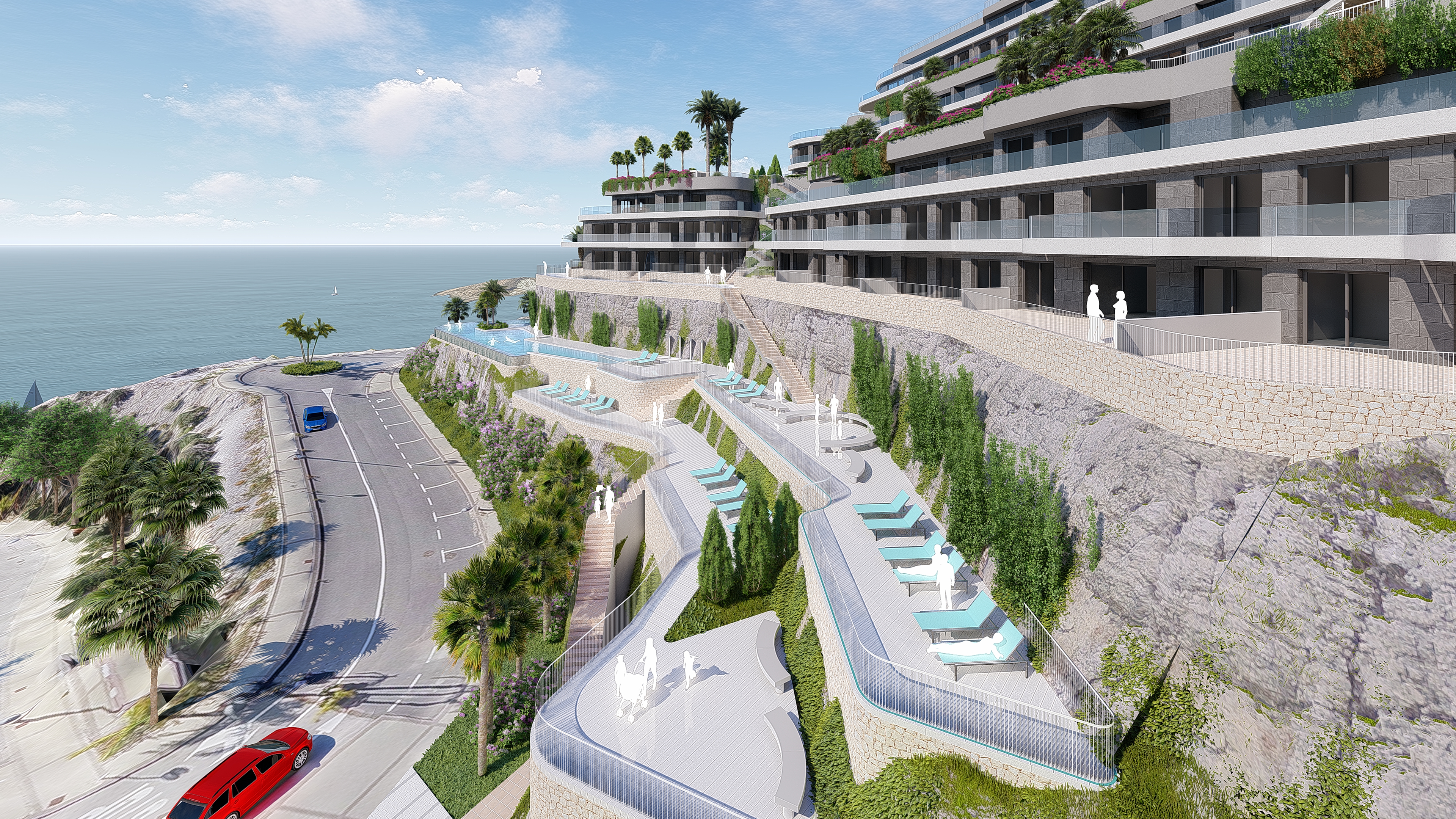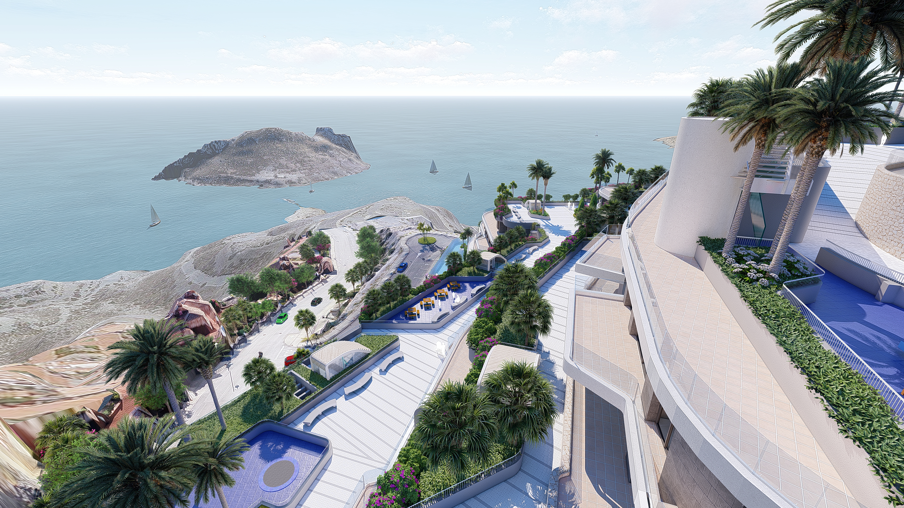 Projektets enestående beliggenhed, giver en fantastisk havudsigt. Byggeriets design og arkitektur smelter sammen med formerne i de naturlige omgivelser, hvori det er beliggende. Takket være den naturlige skrænt, projektet er bygget på, er boligerne designet til at få mest muligt ud af det naturlige lys med den spektakulære udsigt over Middelhavet fra de store terrasser. De ædle materialer, udnyttelsen af bjergets udformning og den enorme mængde vegetation i landskabet, skaber den perfekte harmoni mellem byggeriet og de naturlige omgivelser.
