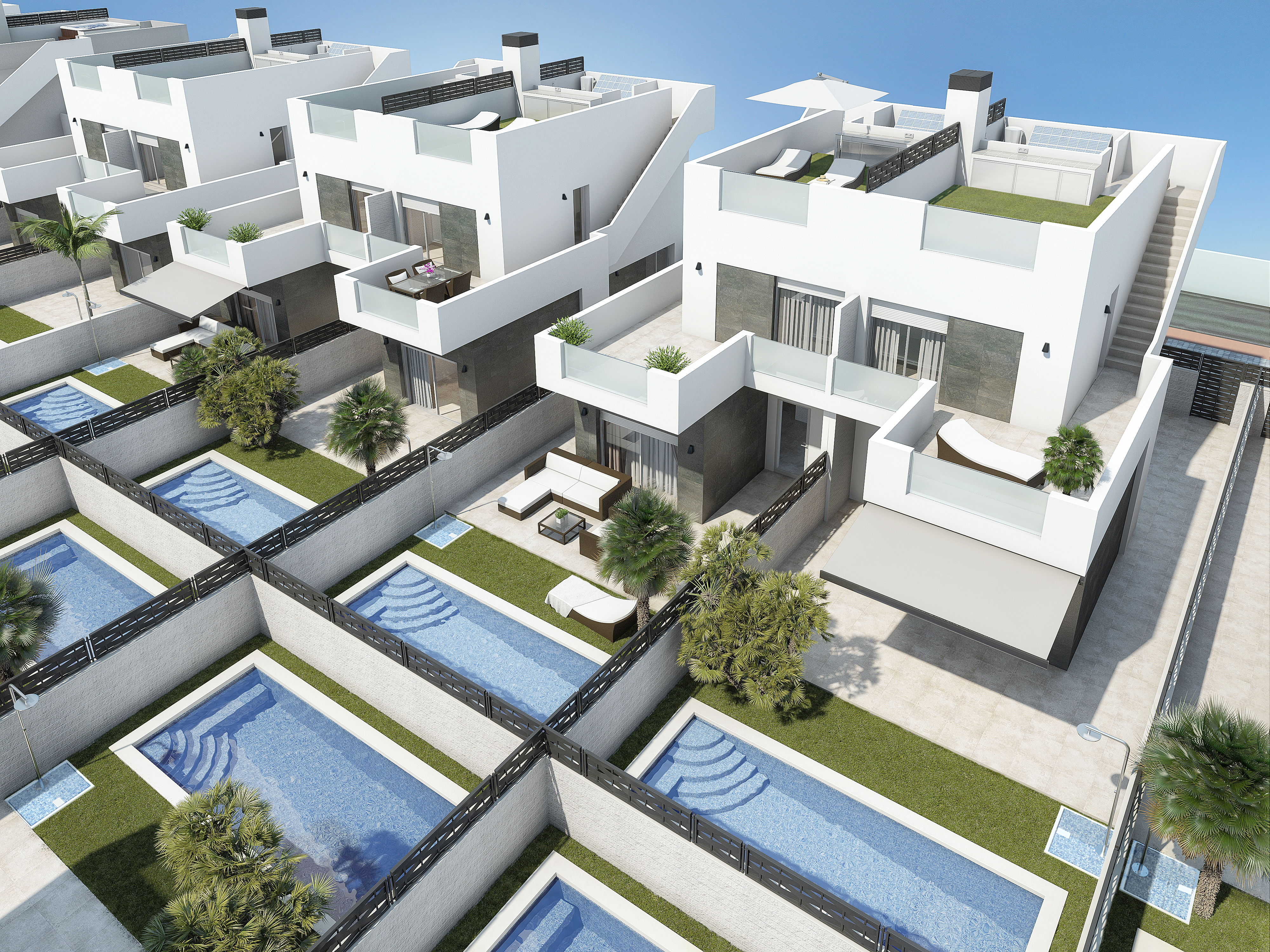 16 villaer med 3 soveværelser, 2 badeværelser, 1 gæstetoilet, privat pool, aircondition, indvendig og udvendig belysning, fuldt udstyret badeværelser, tagterrasse ..