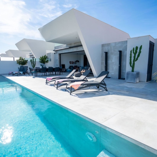 Villaer beliggende 50 meter fra golfbanen La Marquesa, de har 3 soveværelser og 2 badeværelser, omfatter en 3x6 m pool og terrasser i haven og poolområdet. De har en tagterrasse og en stor parkeringsplads. Kun få meter fra ligger der et indkøbscenter med butikker, supermarked, barer og internationale restauranter. 5 minutter fra Rojales by og 15 minutter fra Guardamar strande. Lufthavnen ligger 35 minutter væk.