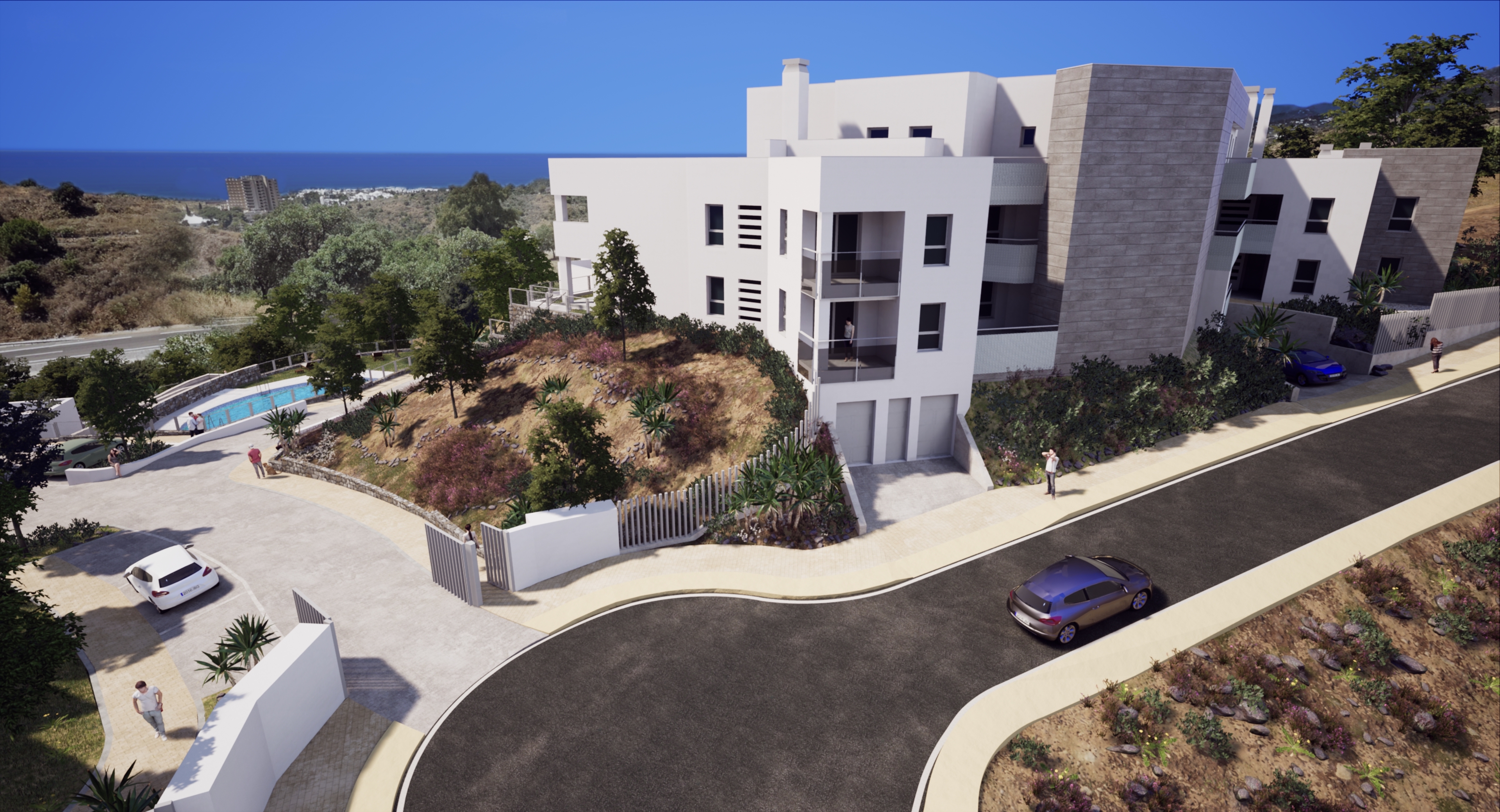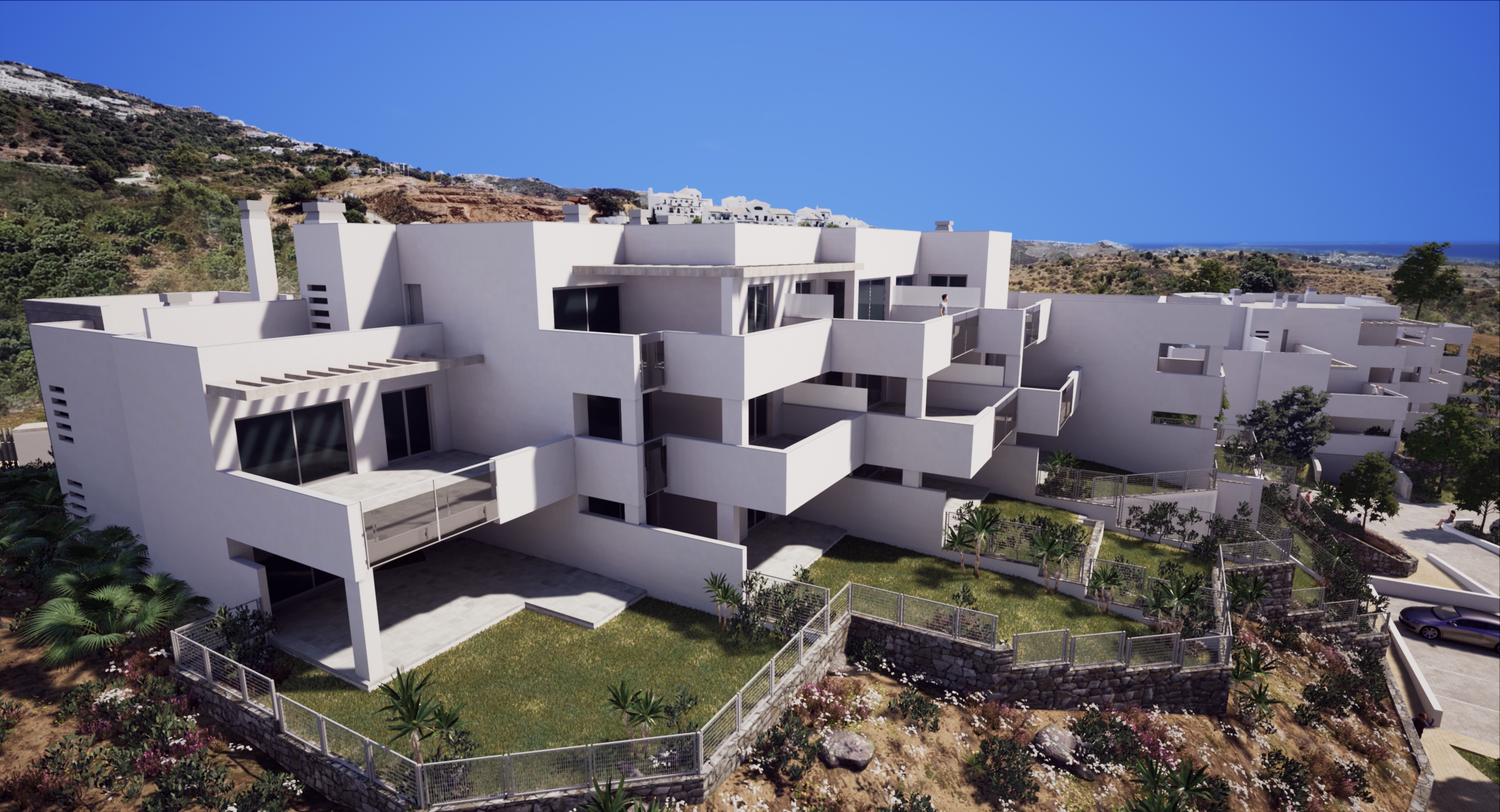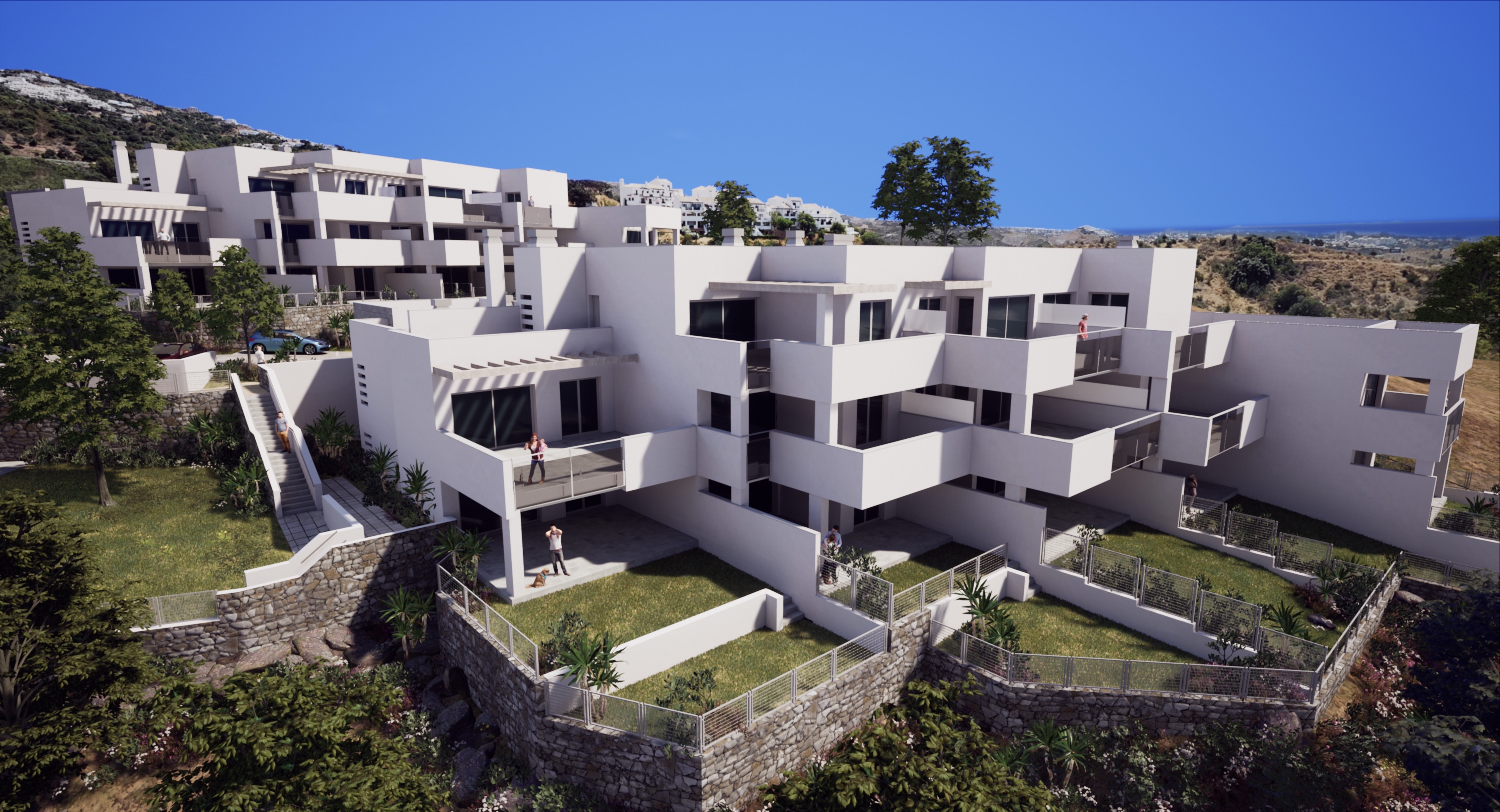 Moderne et, to, tre og fire soveværelses lejligheder i stueetagen med store private terrasser. Første og anden etage med rummelige, sydvestvendte terrasser med fantastisk havudsigt.