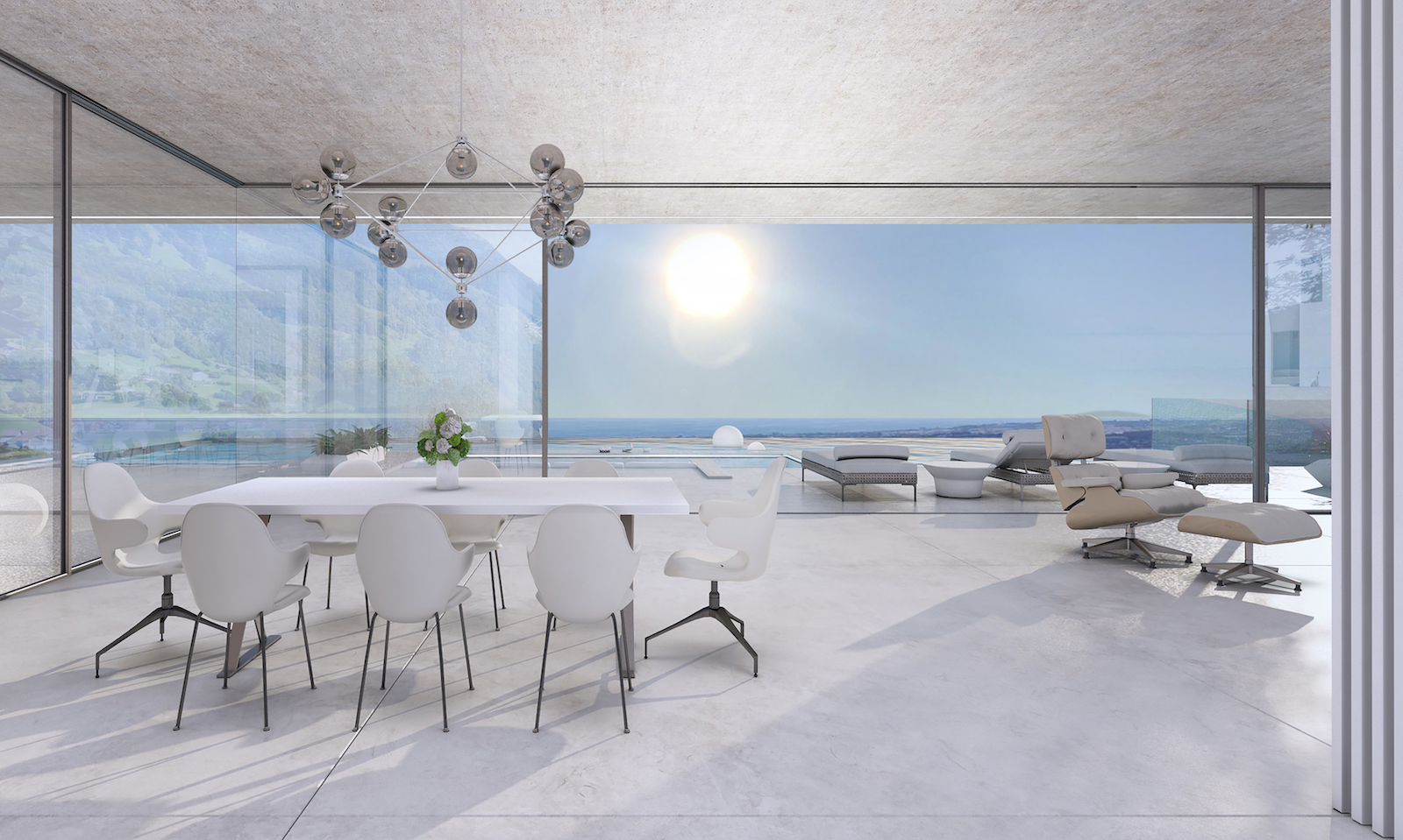 Følelsen af harmoni intensiveres ved hjælp af minimalistiske vinduesrammer, der er indlejret i væggene. De glidende paneler er skjult i væggene og åbner derfor huset mod udendørs området.