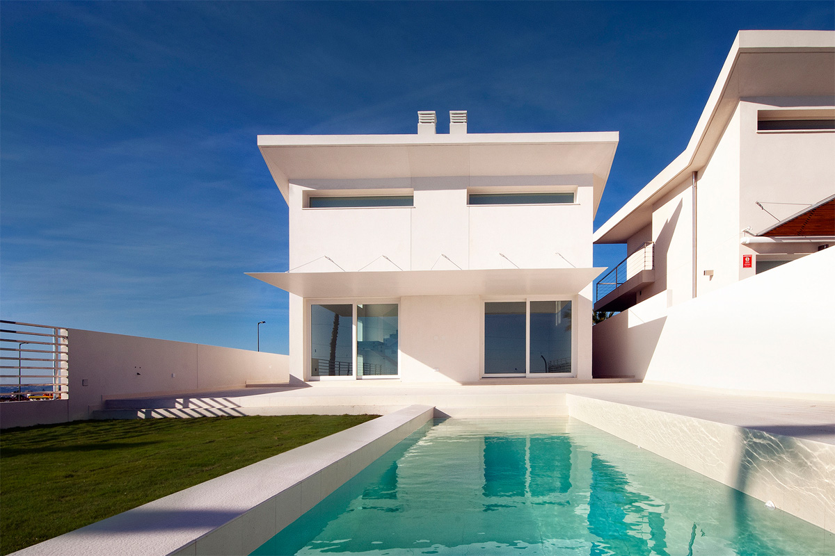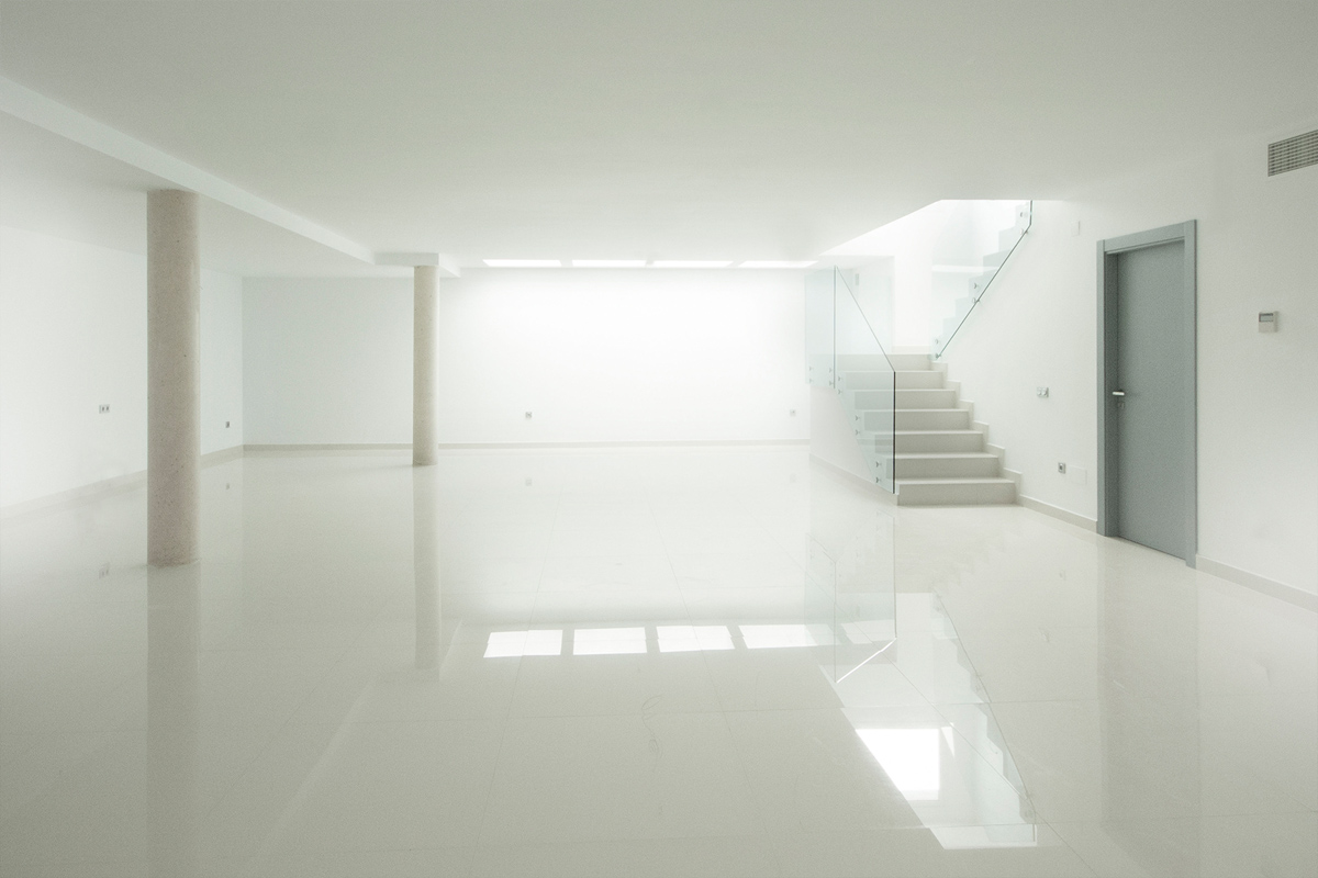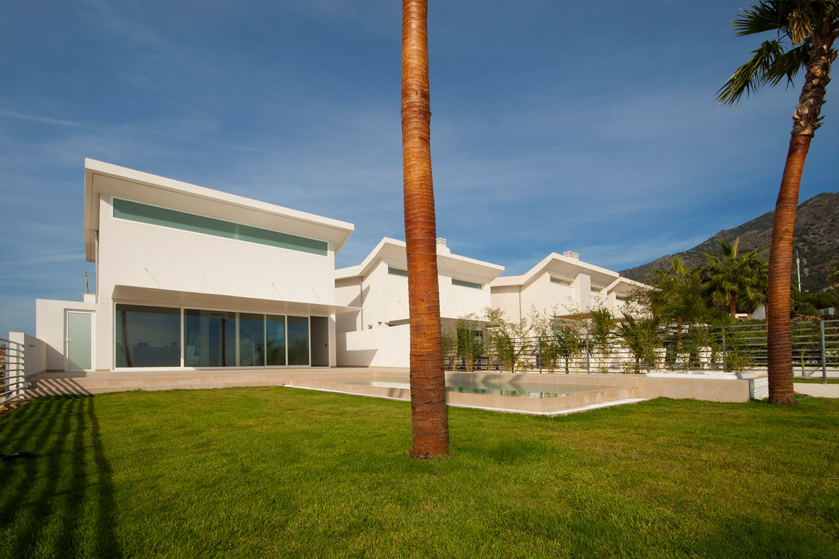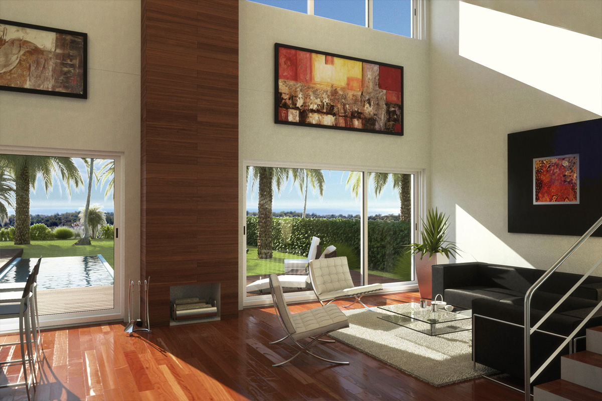 1. Sal: Indgang gennem en gangbro til hoveddøren, Gæstetoilet, åbent køkken med ø, høje og lave møbler, Stue med dobbelt højde spisestue, store vinduer med udgang til terrassen udgør hele syd- og vest facaden, overdækket og afdækket terrasse, have og pool adgang og grill.