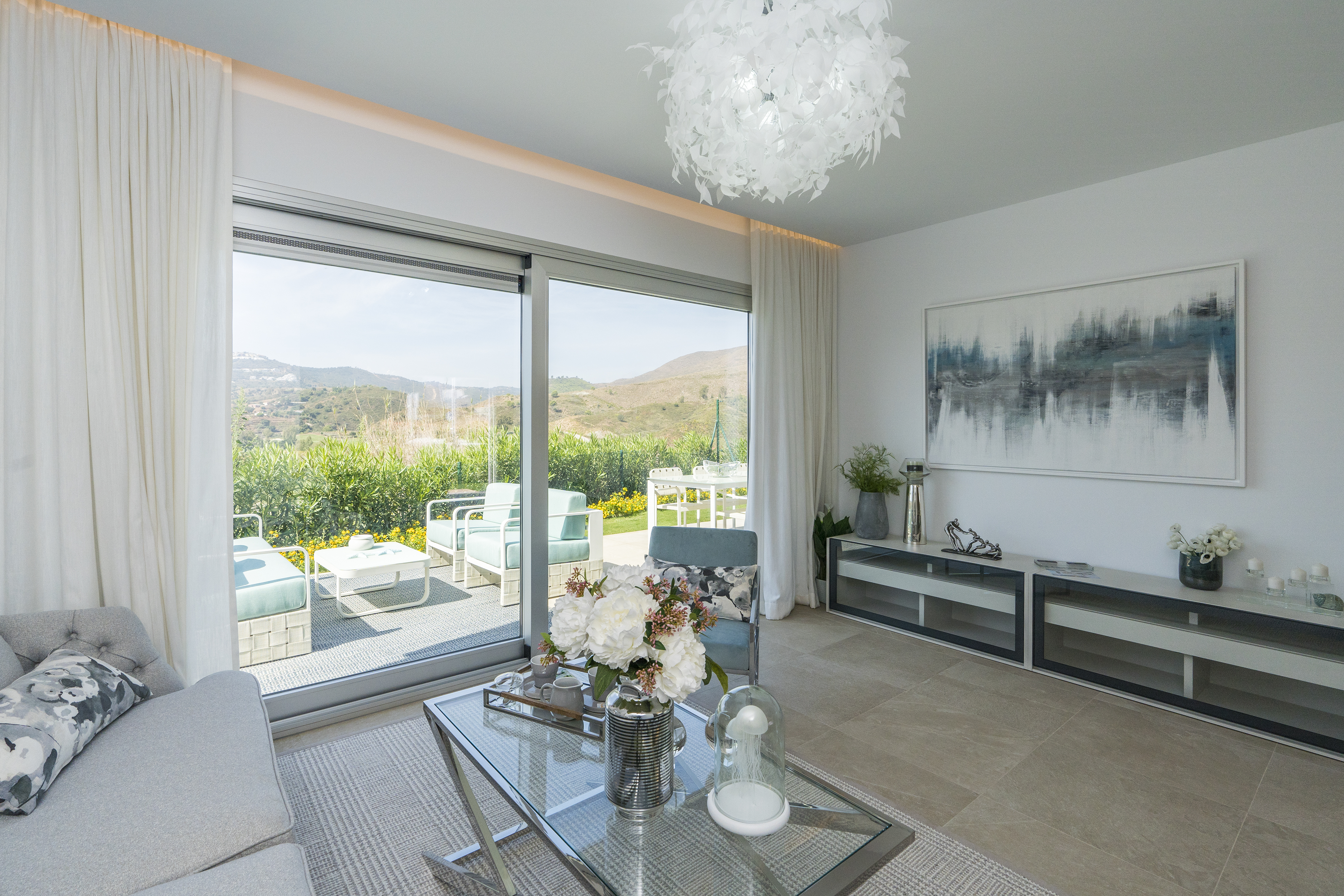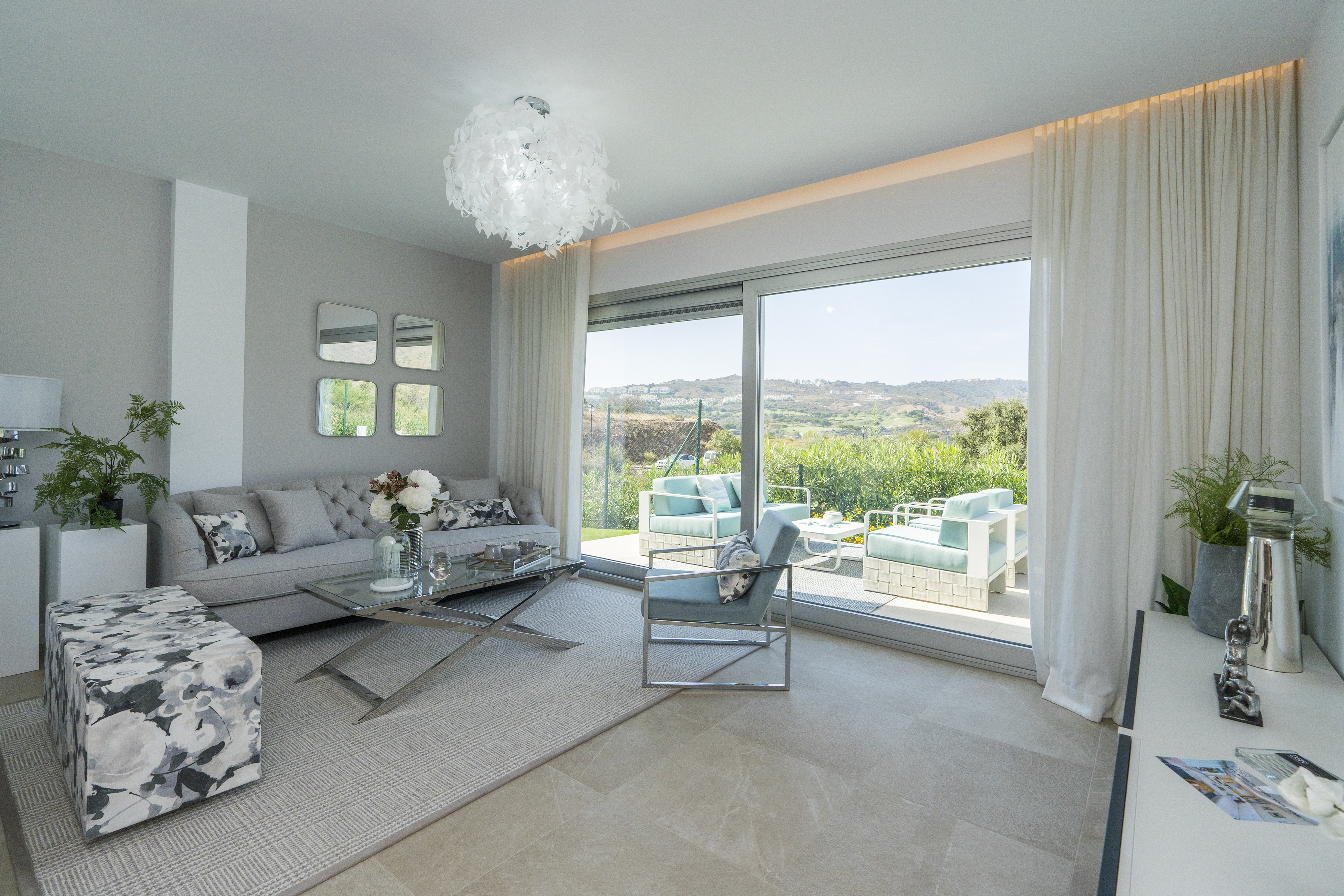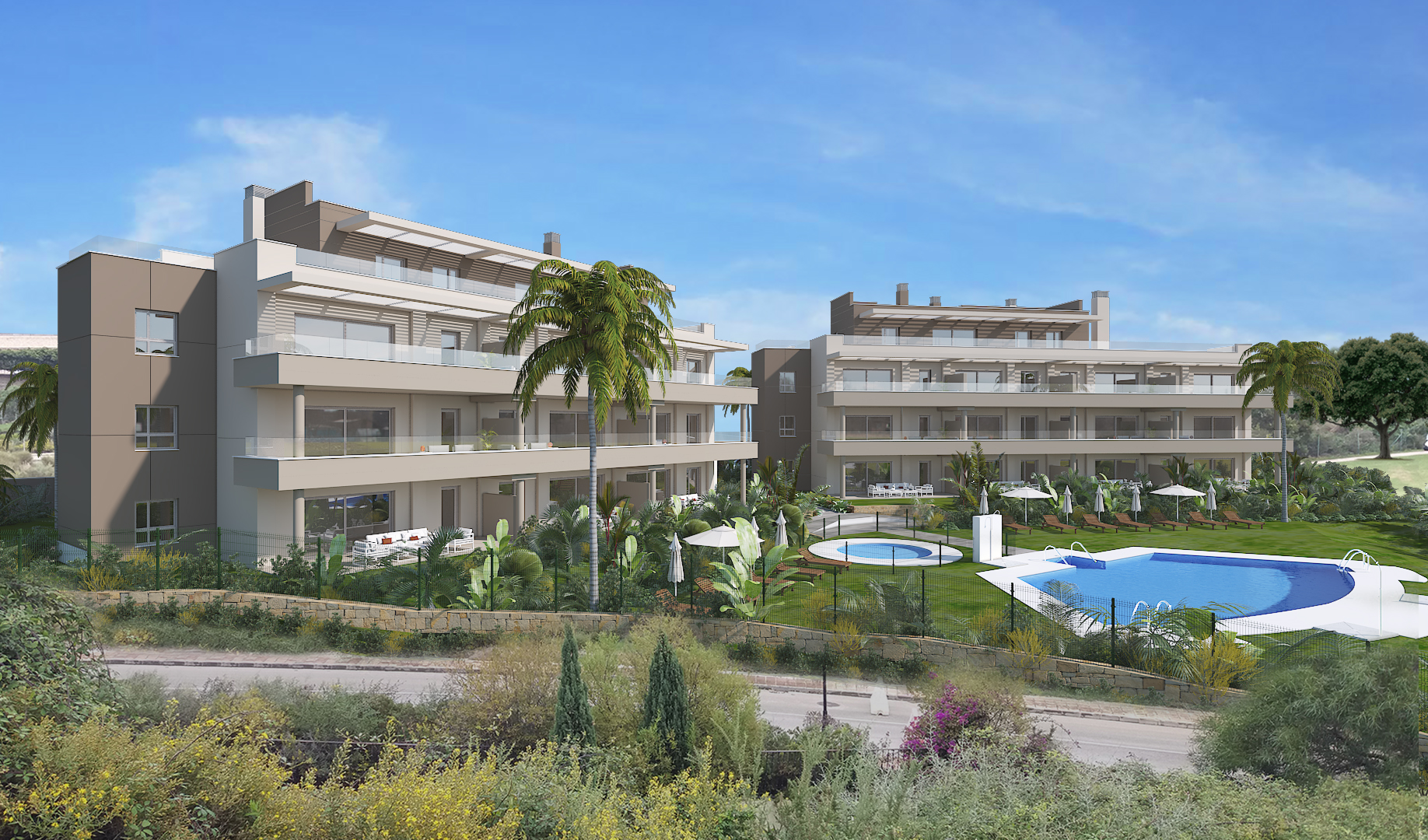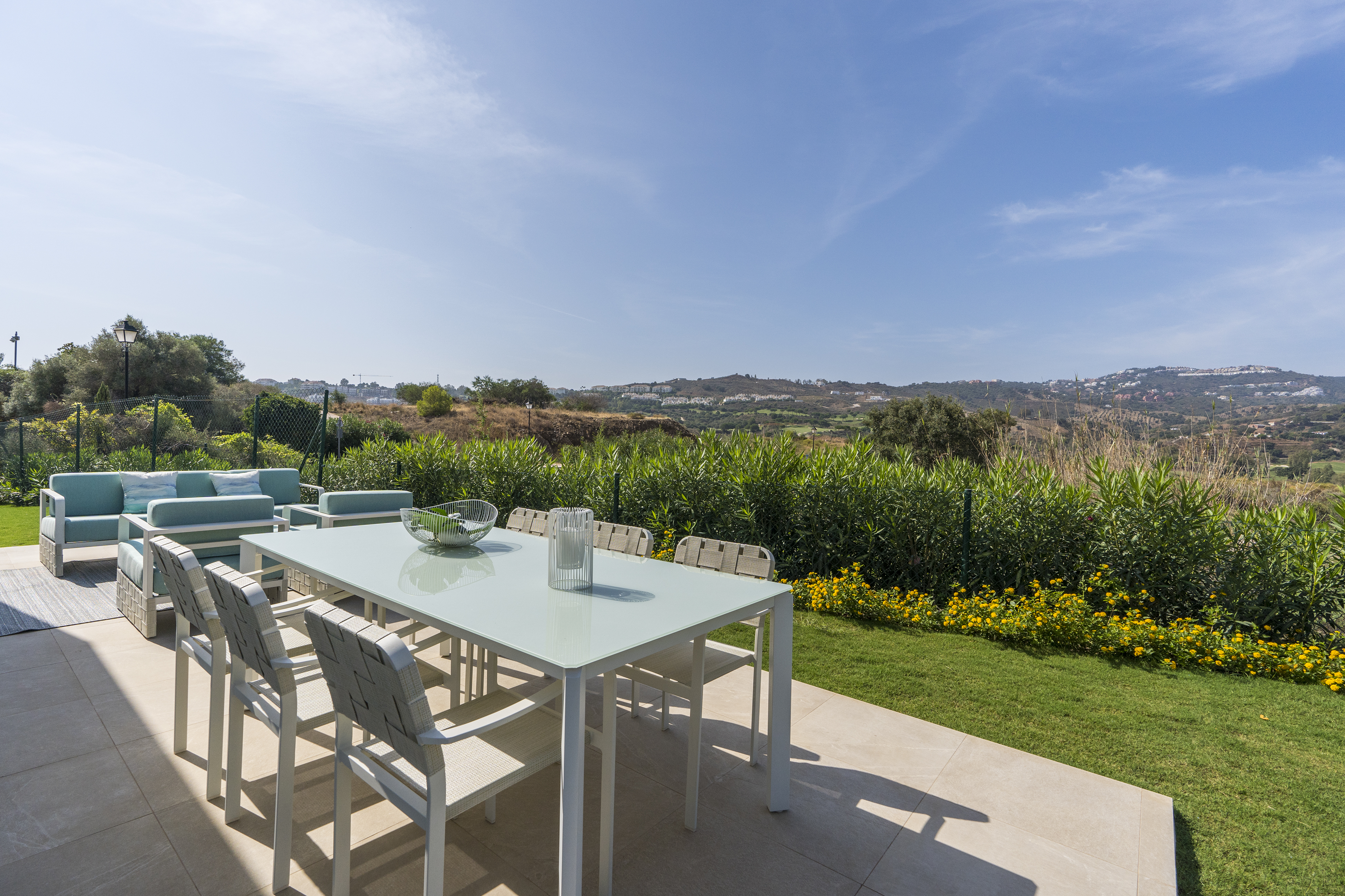 Alle lejlighederne har store terrasser med altaner i glas, så du fuldt ud kan nyde den fantastiske udsigt over golfbanen, og lejlighederne i stueetagen har også private haver med udsigt over poolen, resorthaverne og golfbanen, der omgiver udviklingen.