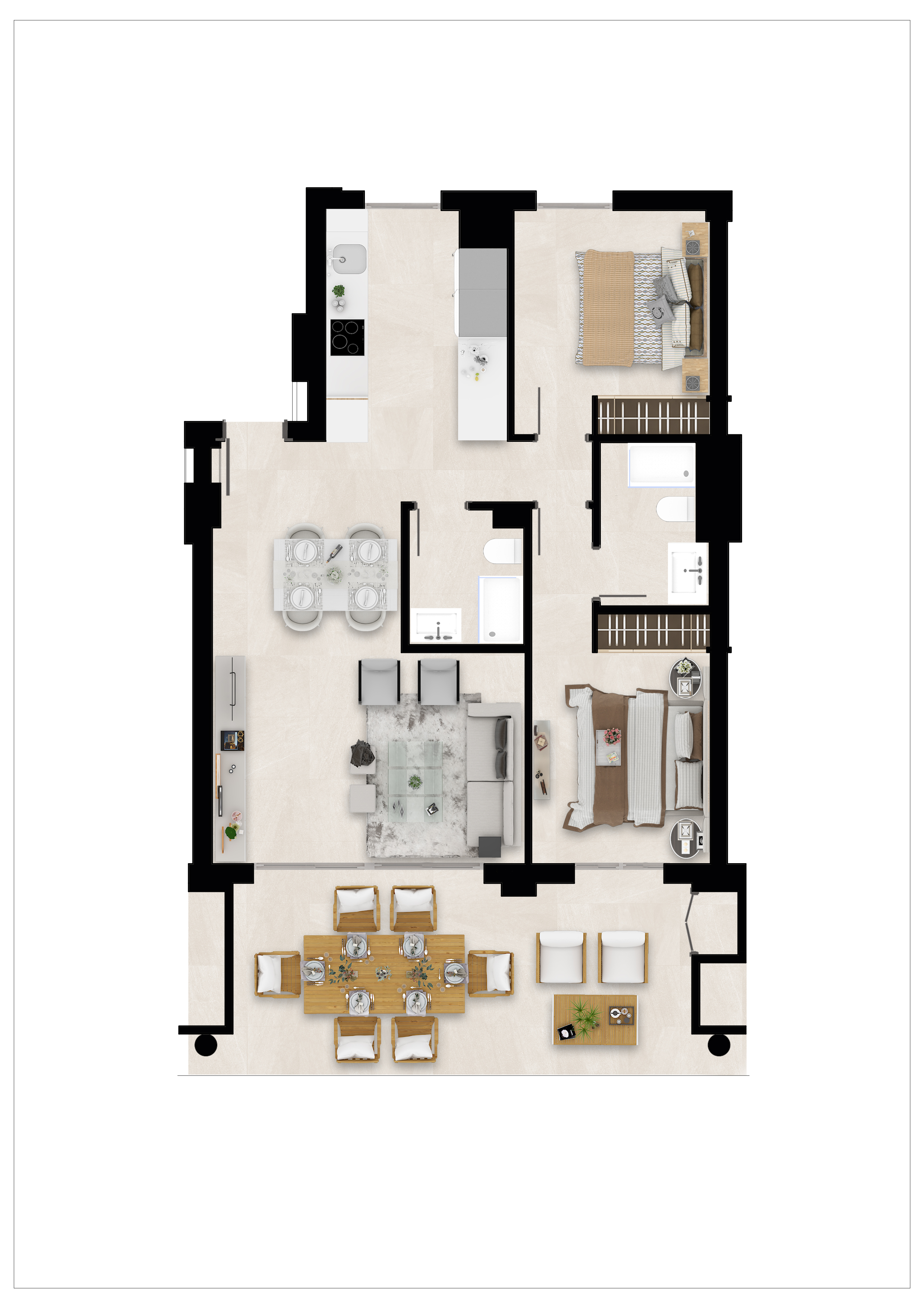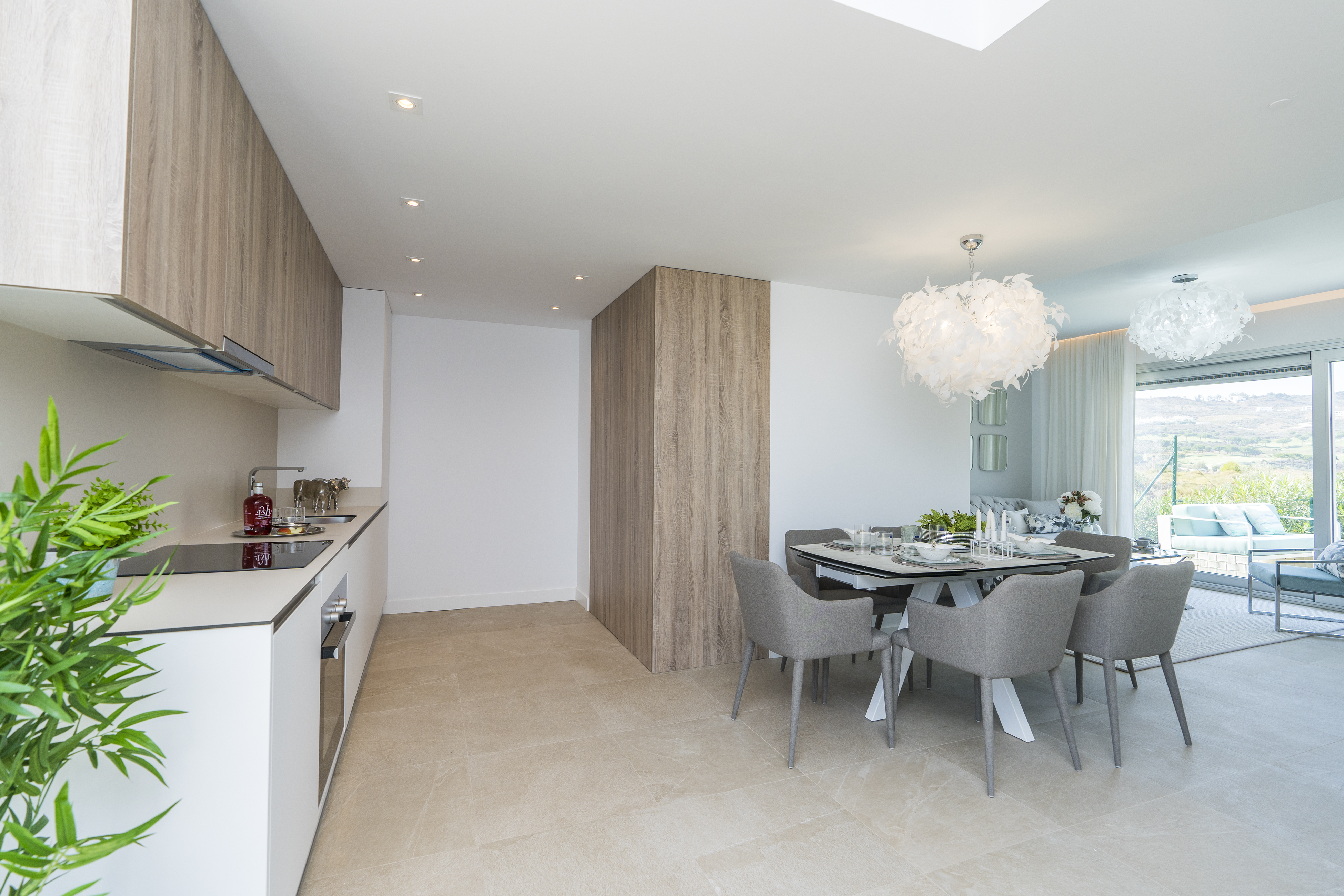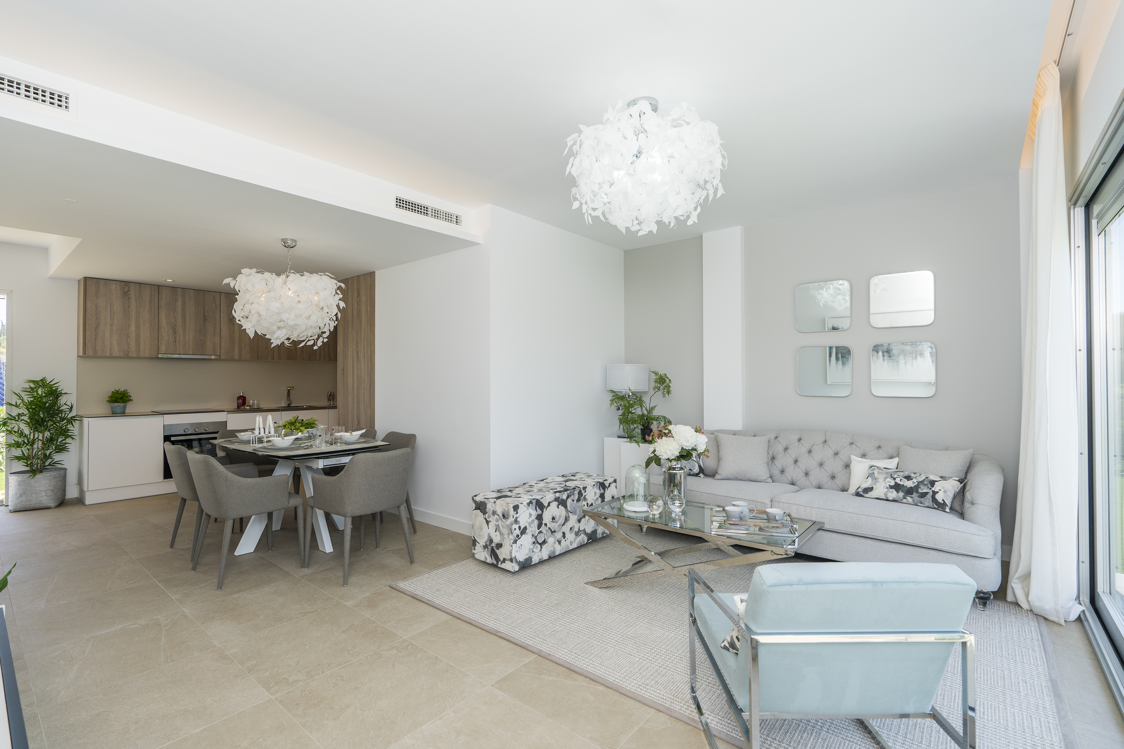 Alle lejlighederne har store terrasser med altaner i glas, så du fuldt ud kan nyde den fantastiske udsigt over golfbanen, og lejlighederne i stueetagen har også private haver med udsigt over poolen, resorthaverne og golfbanen, der omgiver udviklingen.