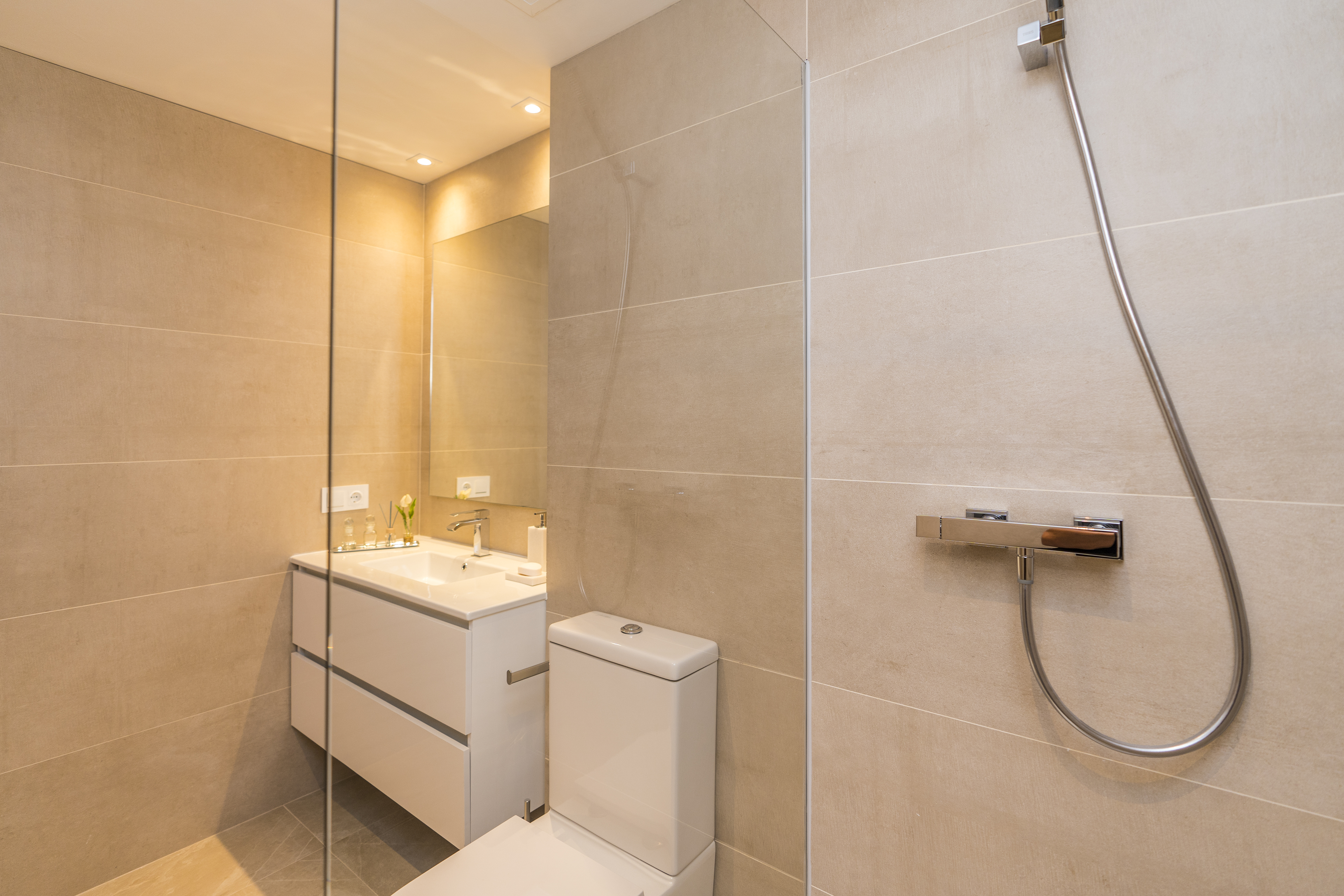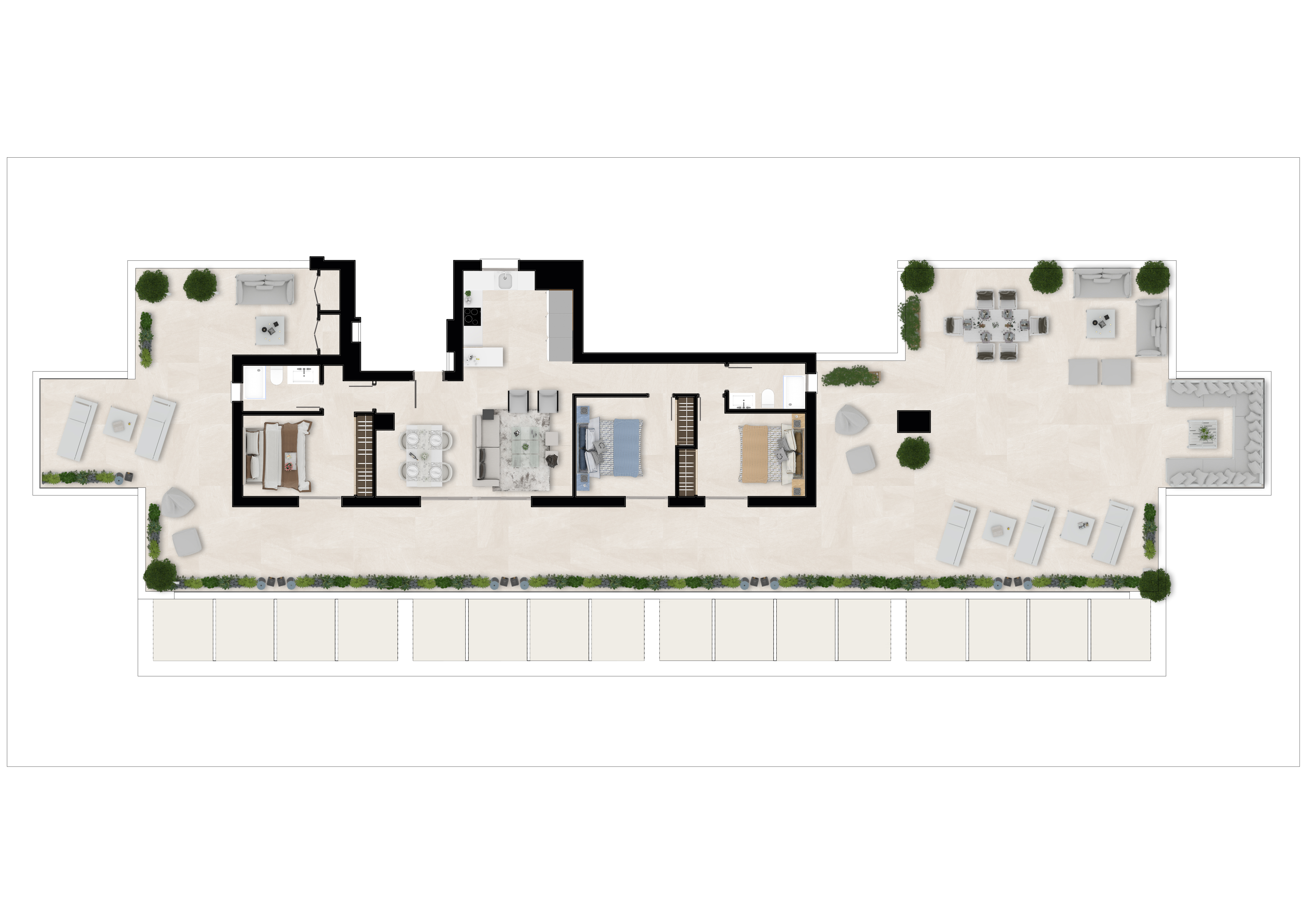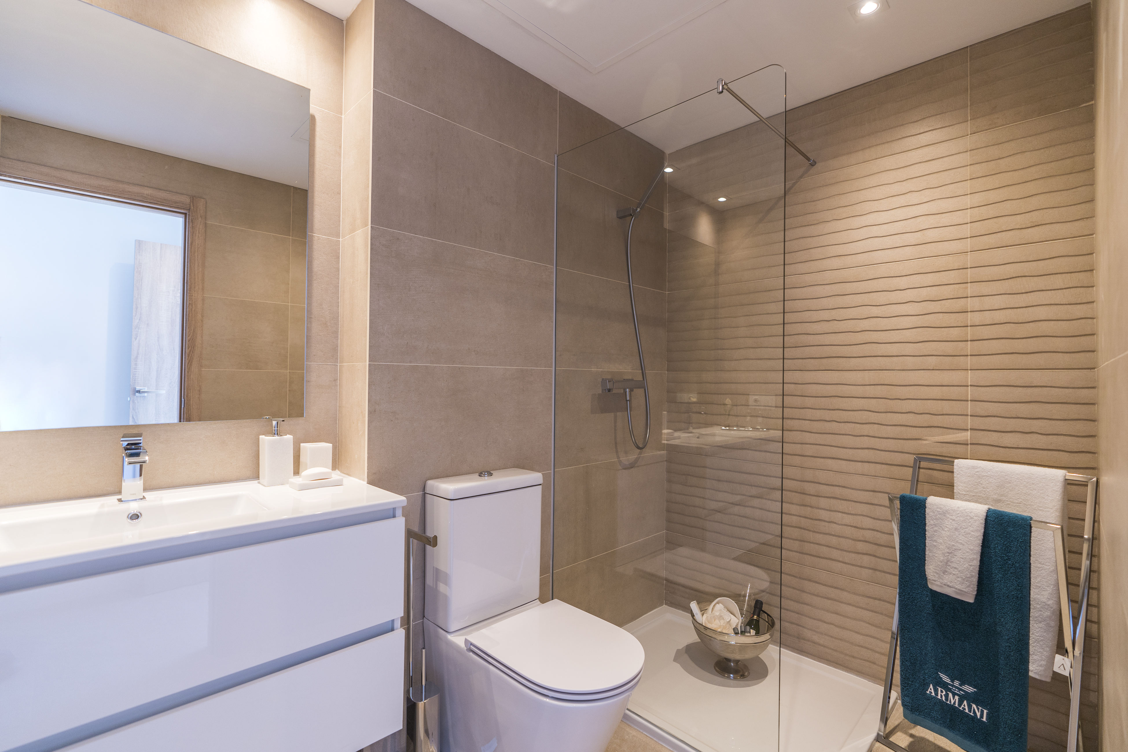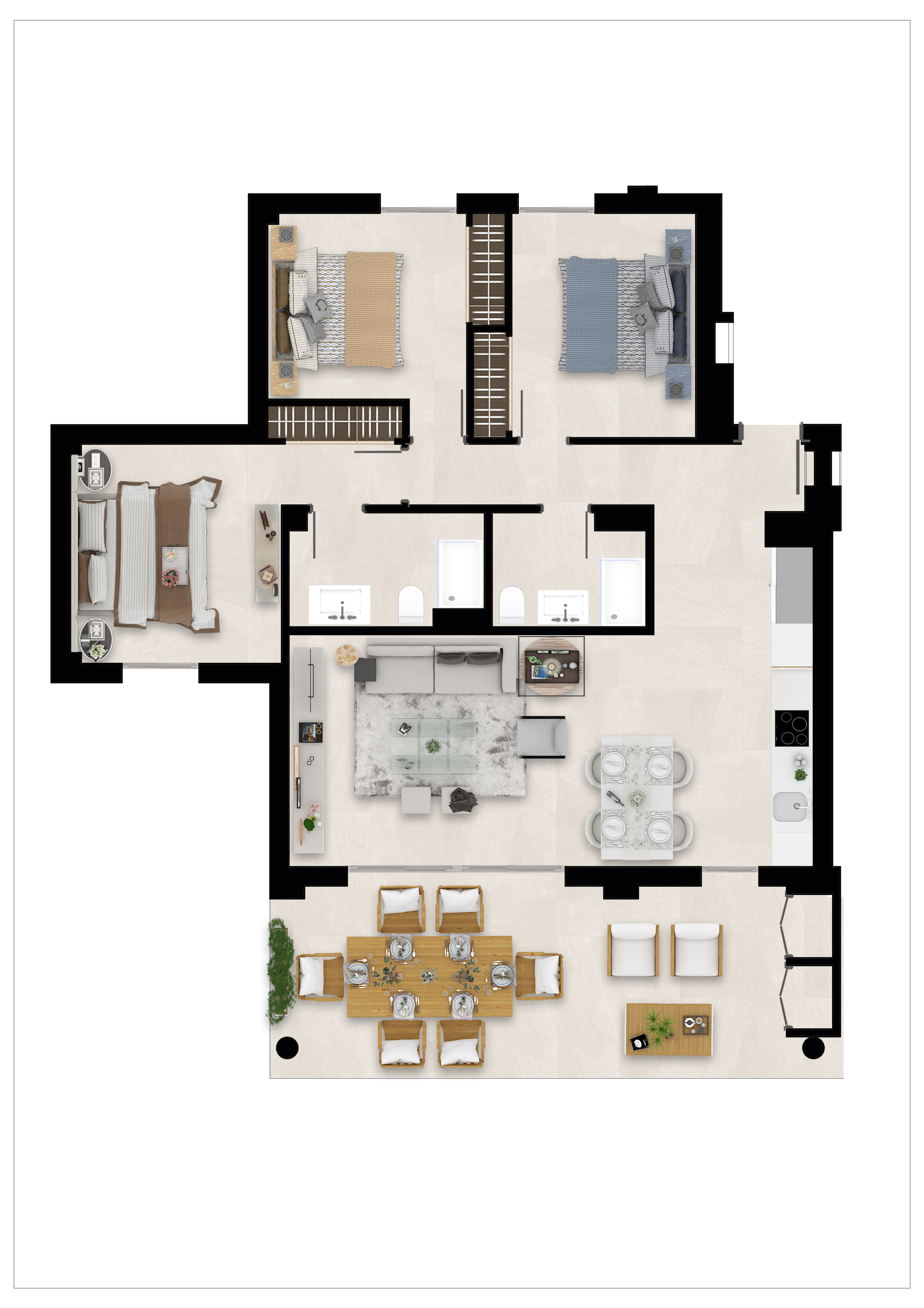 Alle lejlighederne har store terrasser med altaner i glas, så du fuldt ud kan nyde den fantastiske udsigt over golfbanen, og lejlighederne i stueetagen har også private haver med udsigt over poolen, resorthaverne og golfbanen, der omgiver udviklingen.