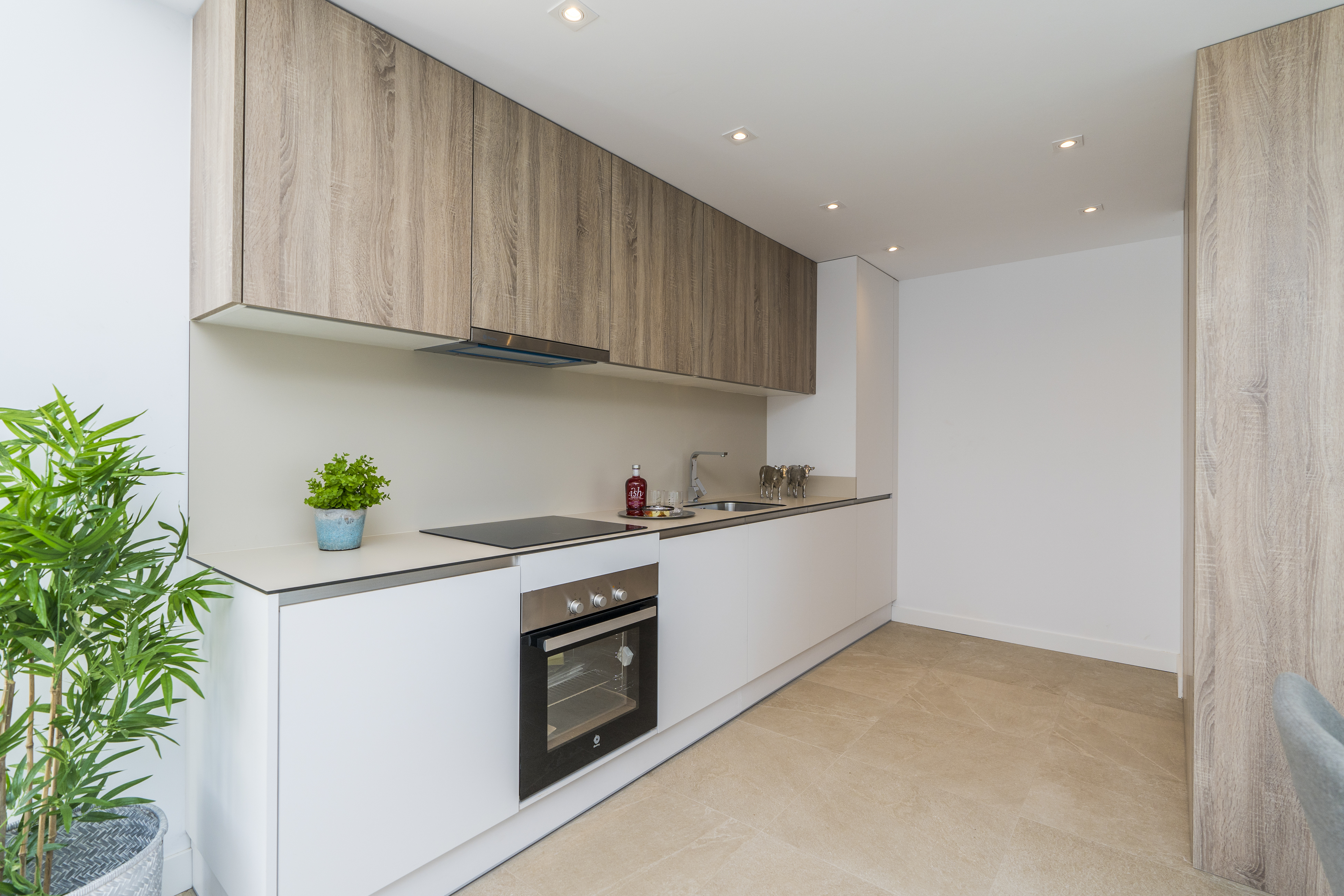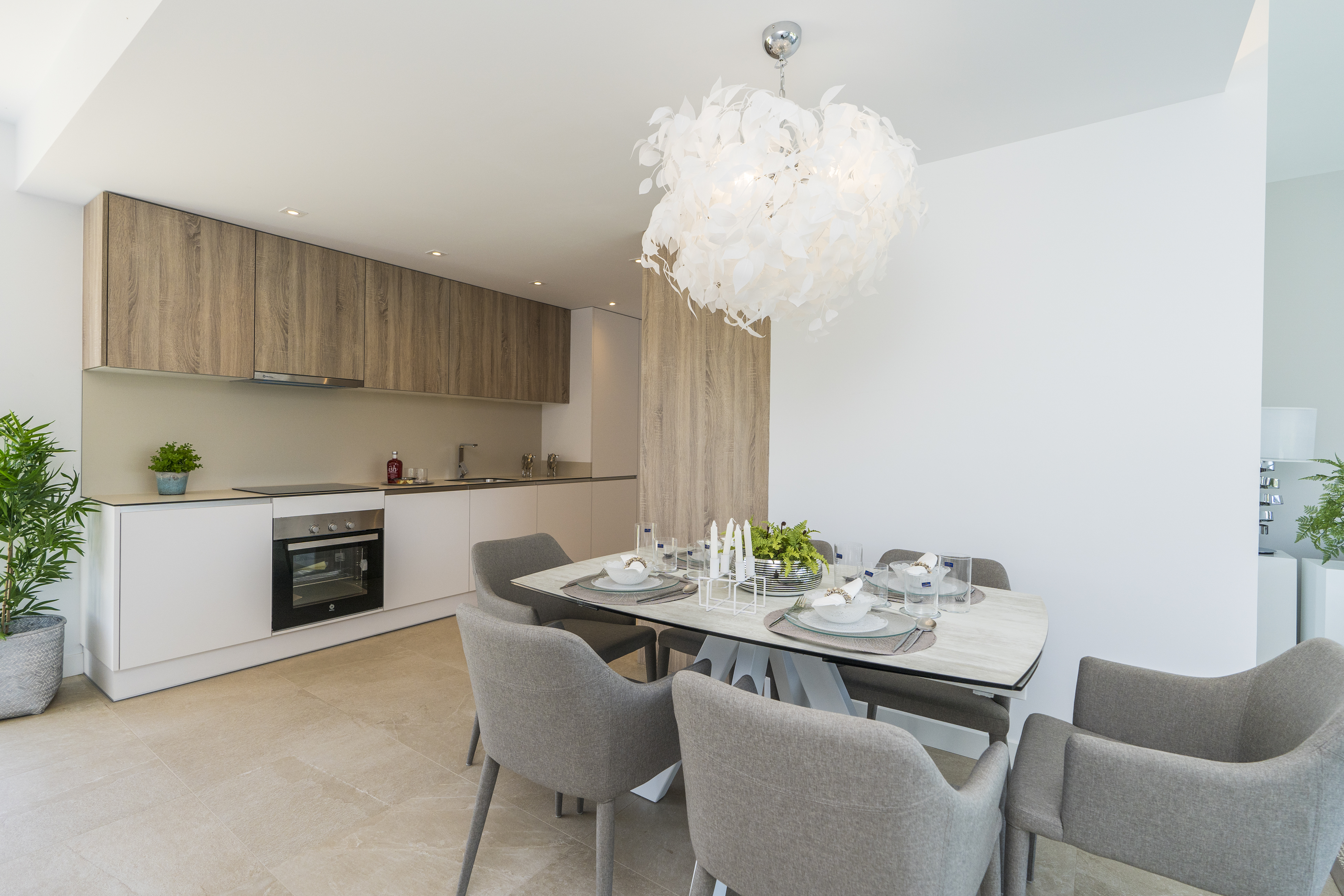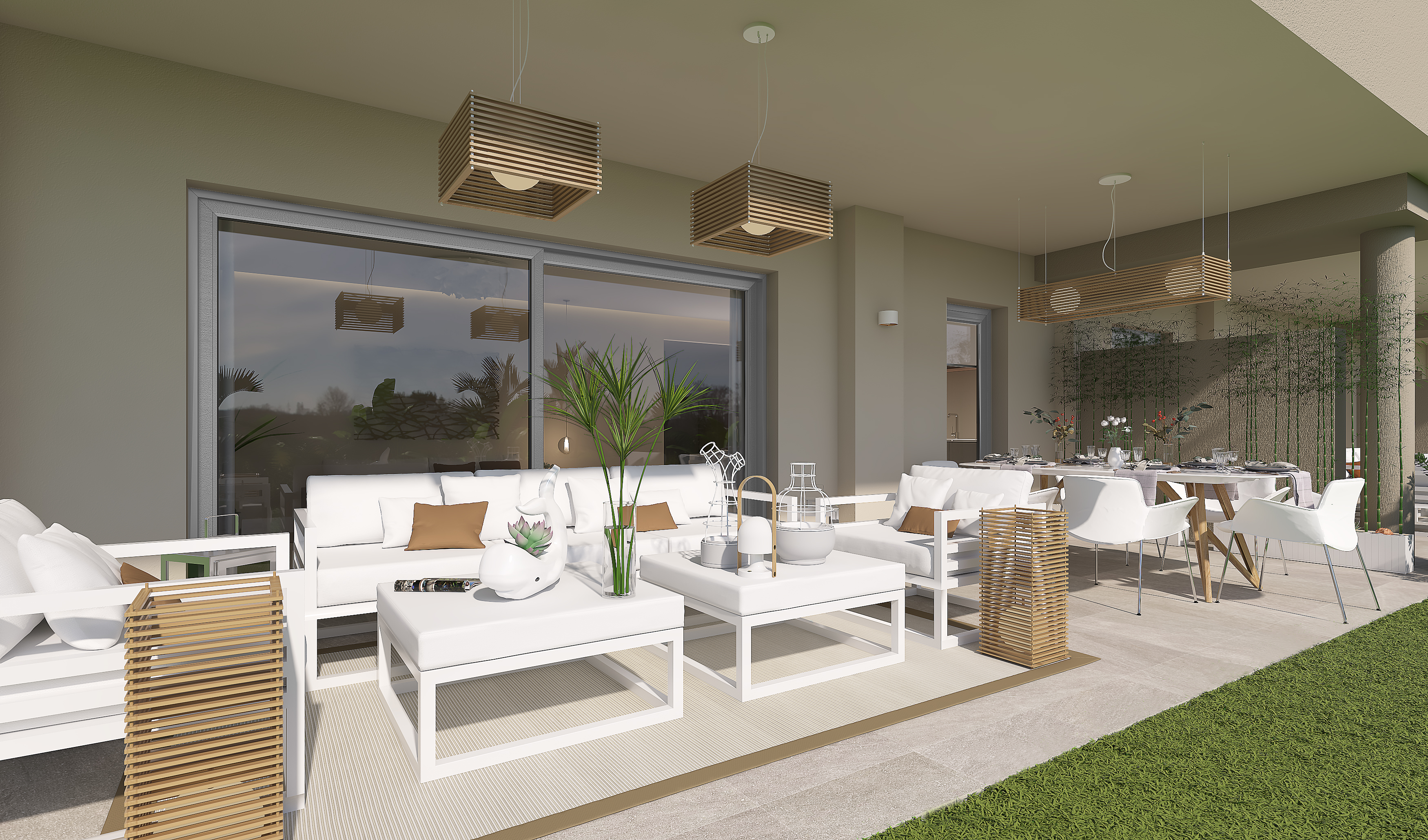 Hjemmene har en moderne fordeling med konceptet "total living", hvor al pladsen udnyttes, og med en stor stue, der integrerer terrassen via de store vinduer.