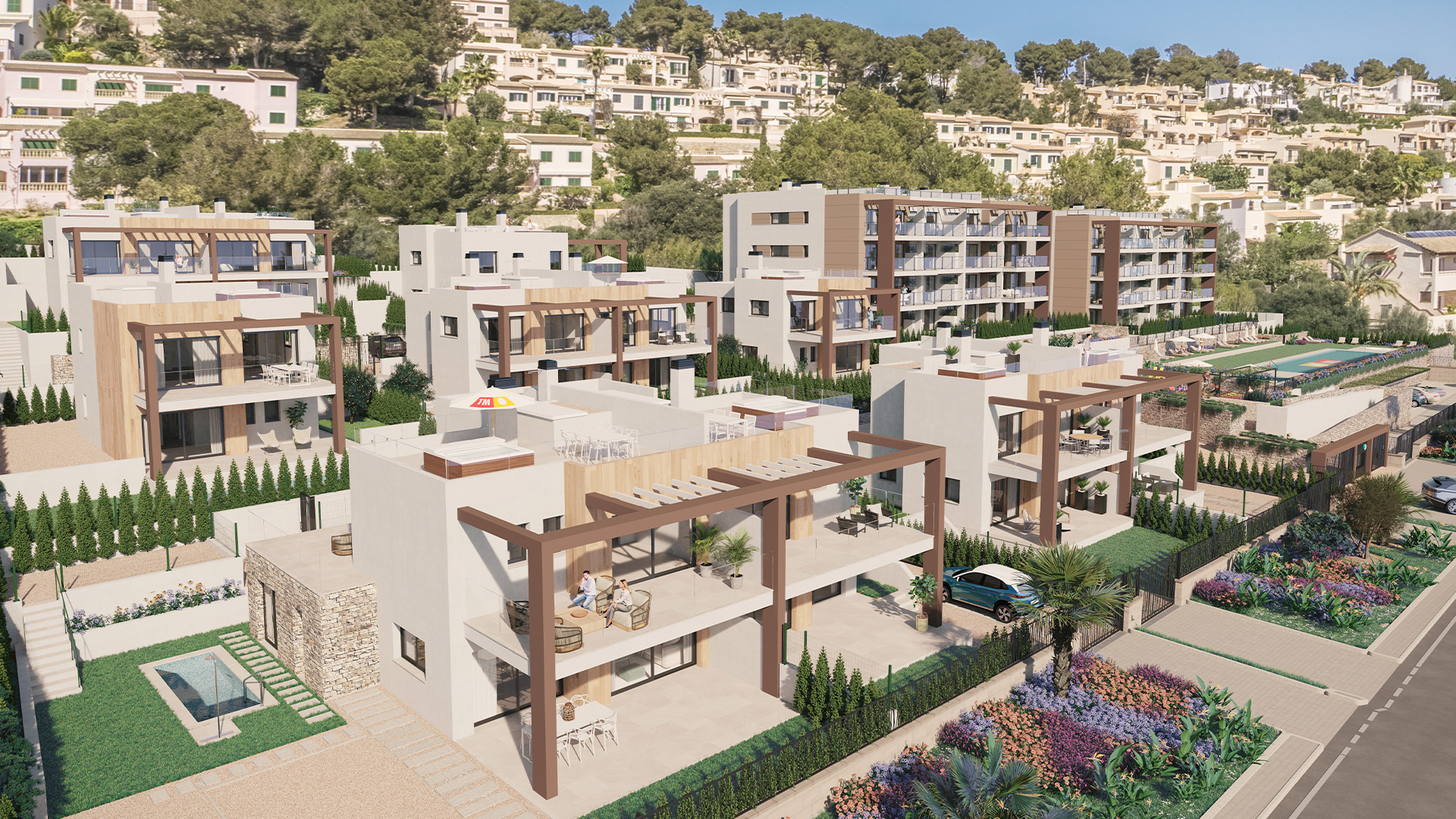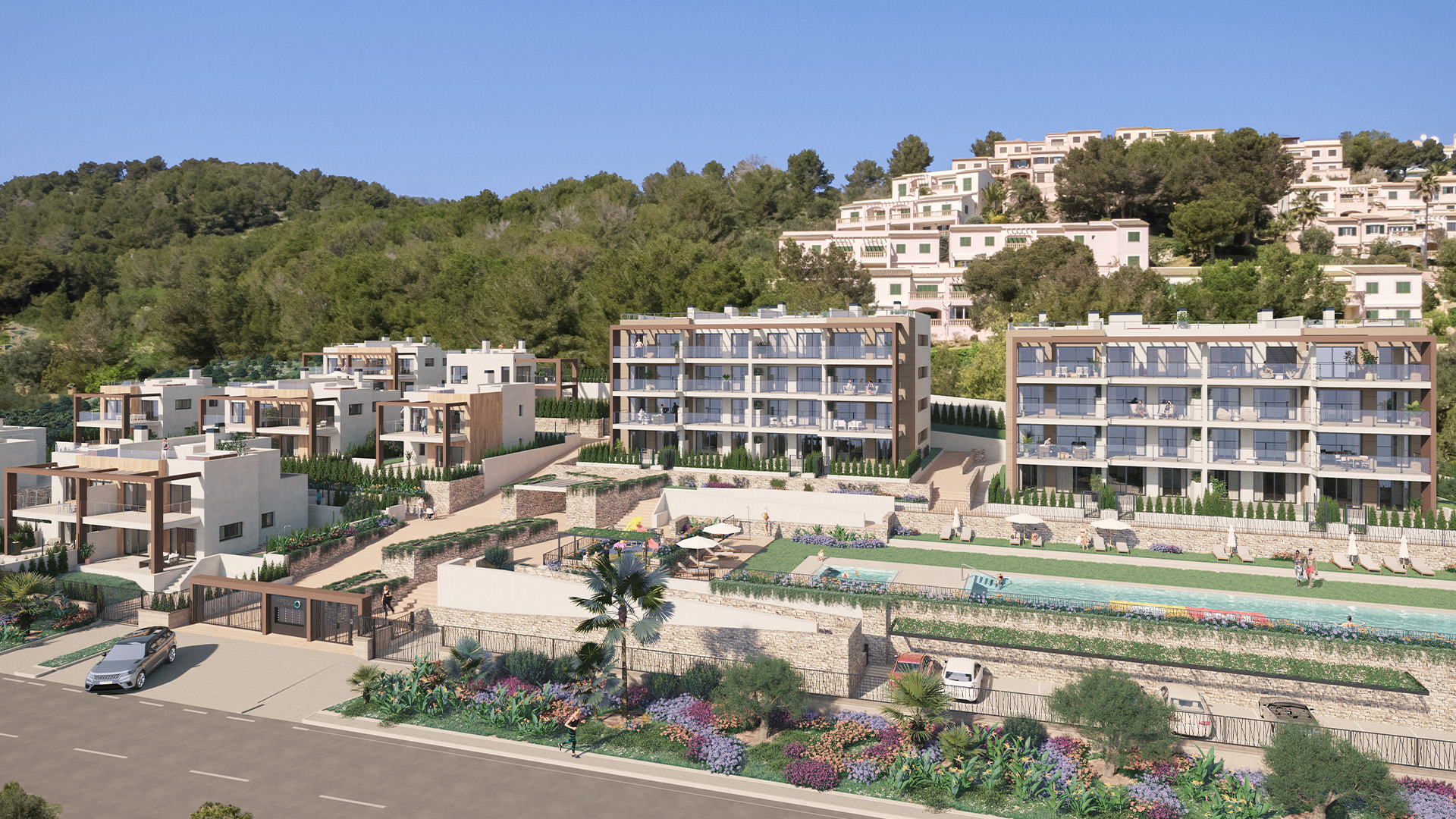 Essence of Sa Cala består af 42 boliger, 31 af dem findes i 2 lejlighedsblokke, hvor lejlighederne har 2 til 3 soveværelser. Derudover er der 11 dobbelthuse eller parcelvillaer som består af 2 til 3-værelses enfamiliehuse. Hvis du leder efter en lejlighed, kan du vælge mellem en i stueetagen, en på første sal eller en penthouse med solarium. Alle lejligheder har en parkeringsplads og depotrum, som er inkluderet i prisen. Leder du efter et enfamiliehus, kan du vælge mellem et dobbelthus eller en parcelvilla. Alle er fordelt på 2 etager. Udover selve boligen er der også en tagterrasse, en have og en privat parkeringsplads på din egen grund.