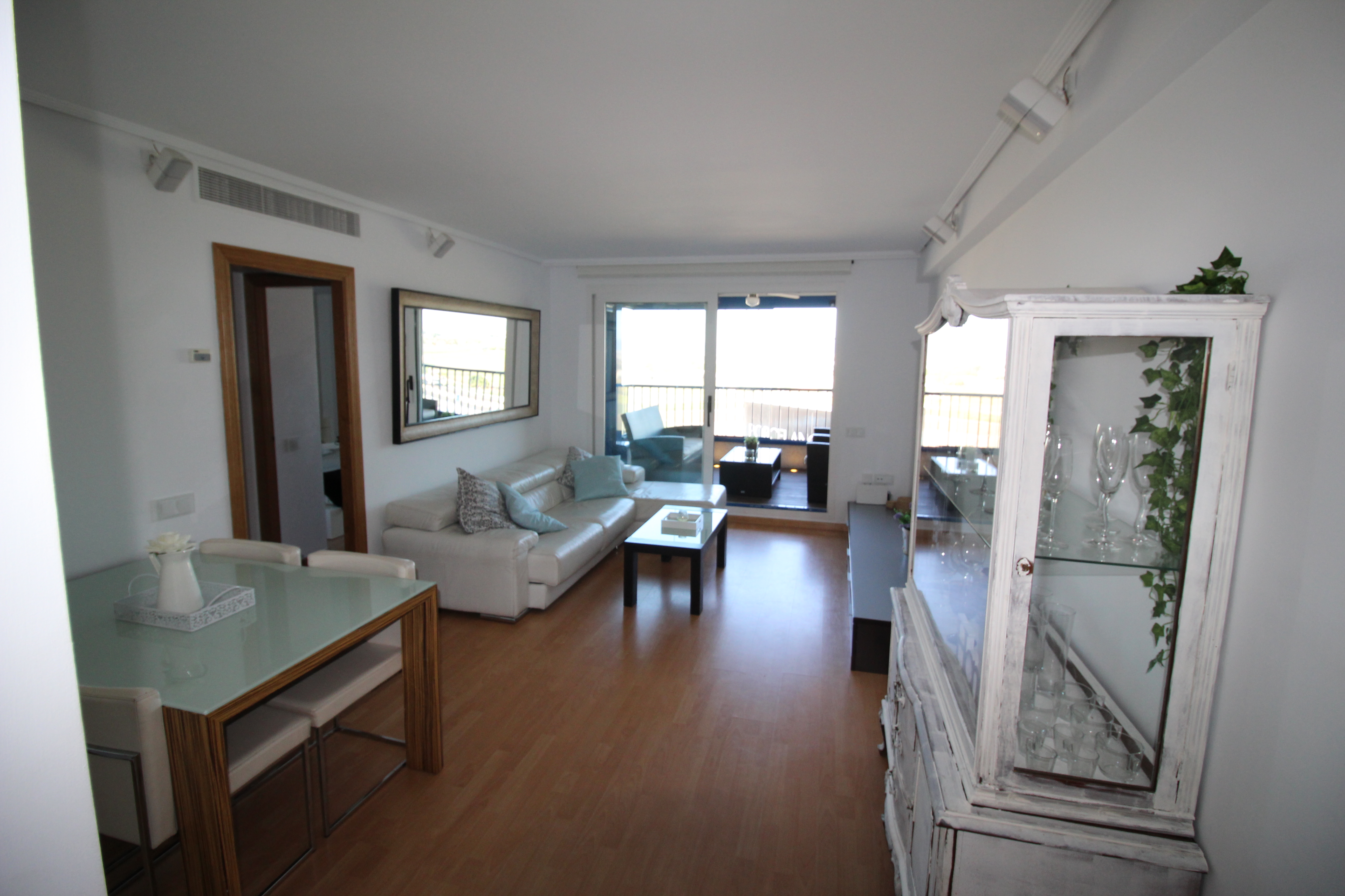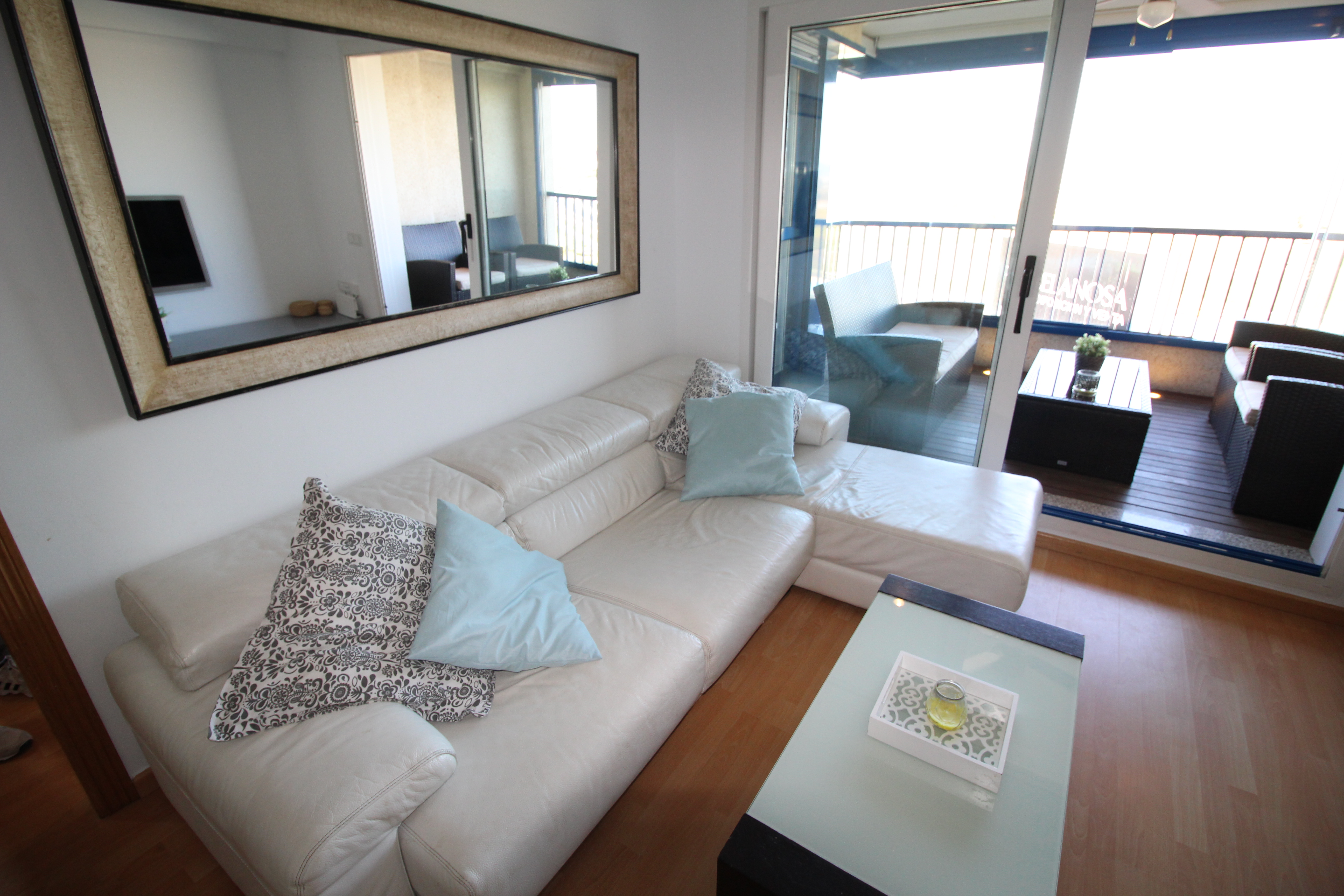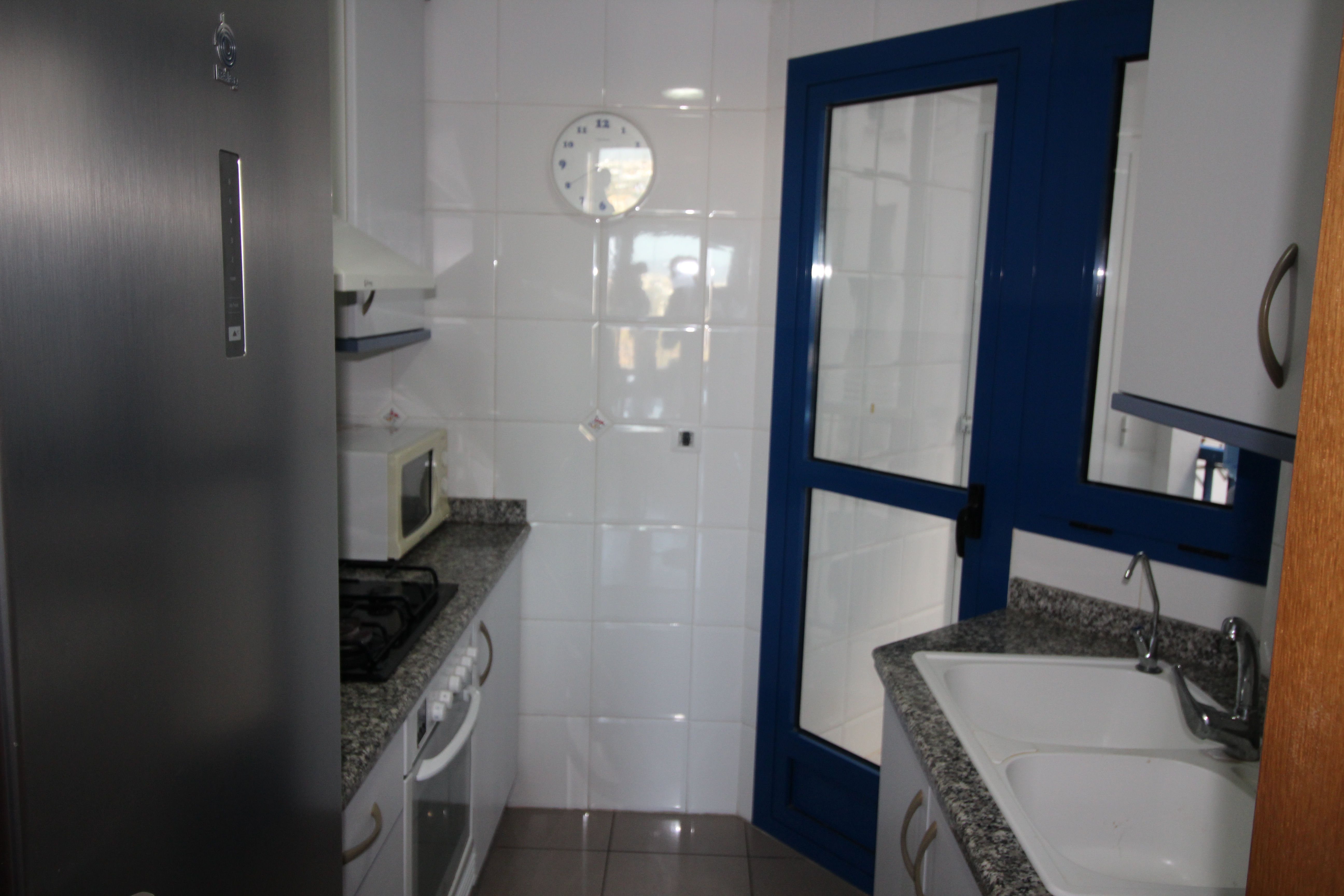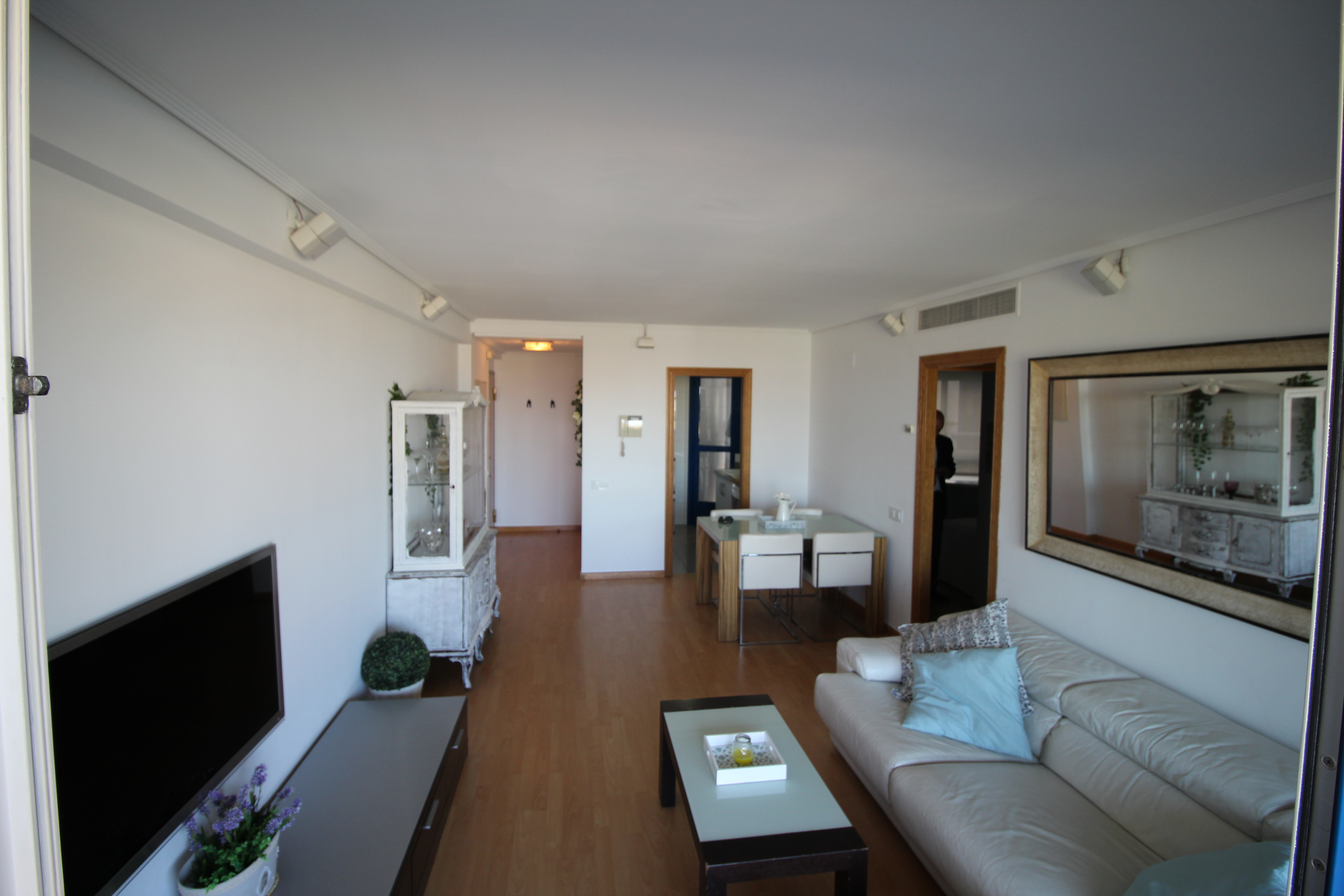 Når du kommer ind i den nordøstlig vendte to-soveværelseslejlighed på 6. etage, kommer du ind i en lille gang, der fører op til en stor, rummelig stue. Til venstre for stuen finder man et komplet køkken, som fører til et åbent vaskeområde med vaskemaskine og tørretumbler på den anden side. Køkkenet har gaskomfur, ovn, mikroovn, 2 håndvaske og opvaskemaskine. Går vi tilbage til stuen, beligger der sig en lille, hyggelig, oplyst 10 m2 terrasse på højre hånd. Terrassen byder på en smuk udsigt over bjergene, der kolliderer med havet, når man ser mod øst. Mellem køkkenet og terrassen forbinder en anden lille gang de 2 soveværelser og badeværelset med stuen. Det store soveværelse har indbyggede skabe i væggen, direkte adgang til terrassen og en luksuriøs dobbeltseng.