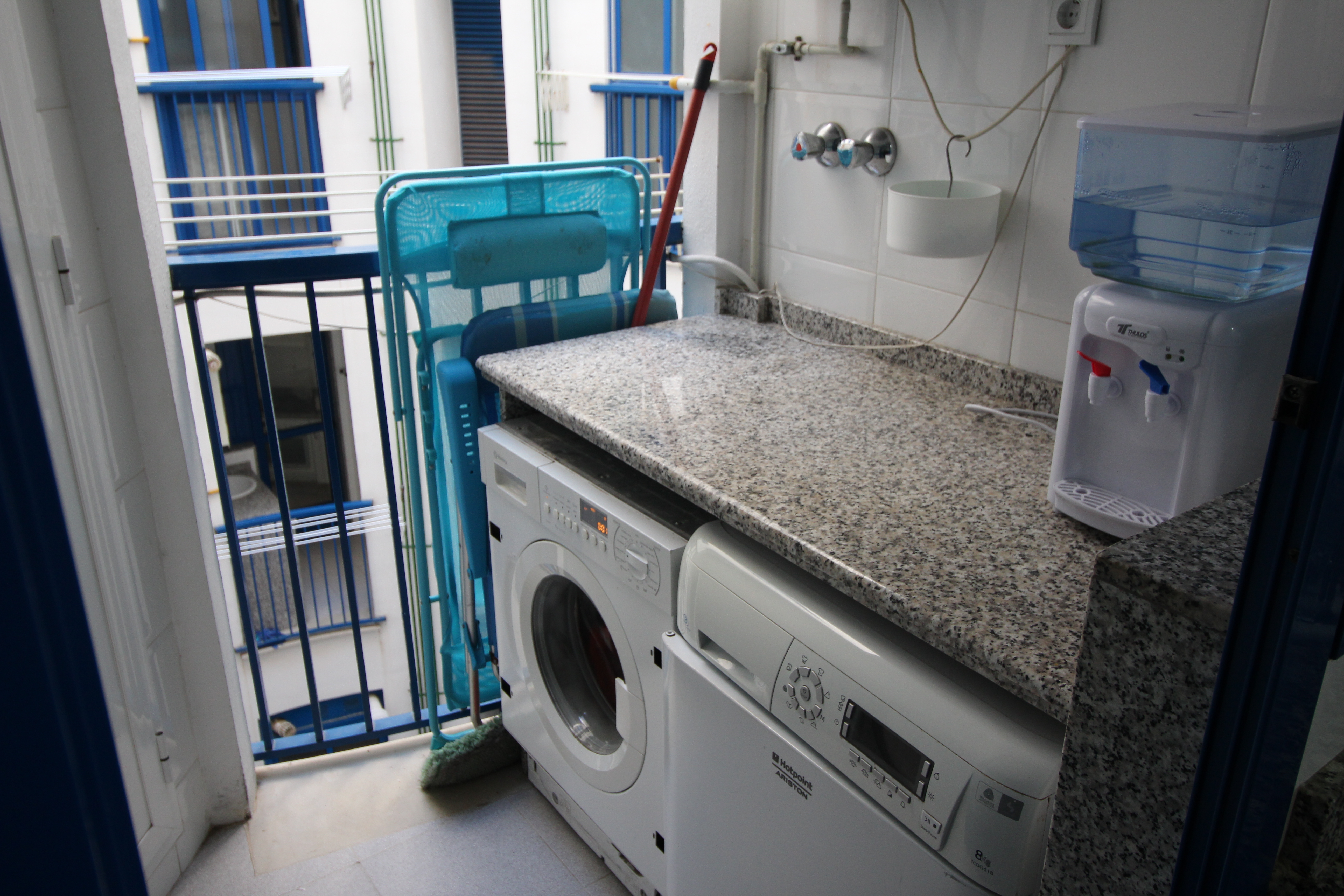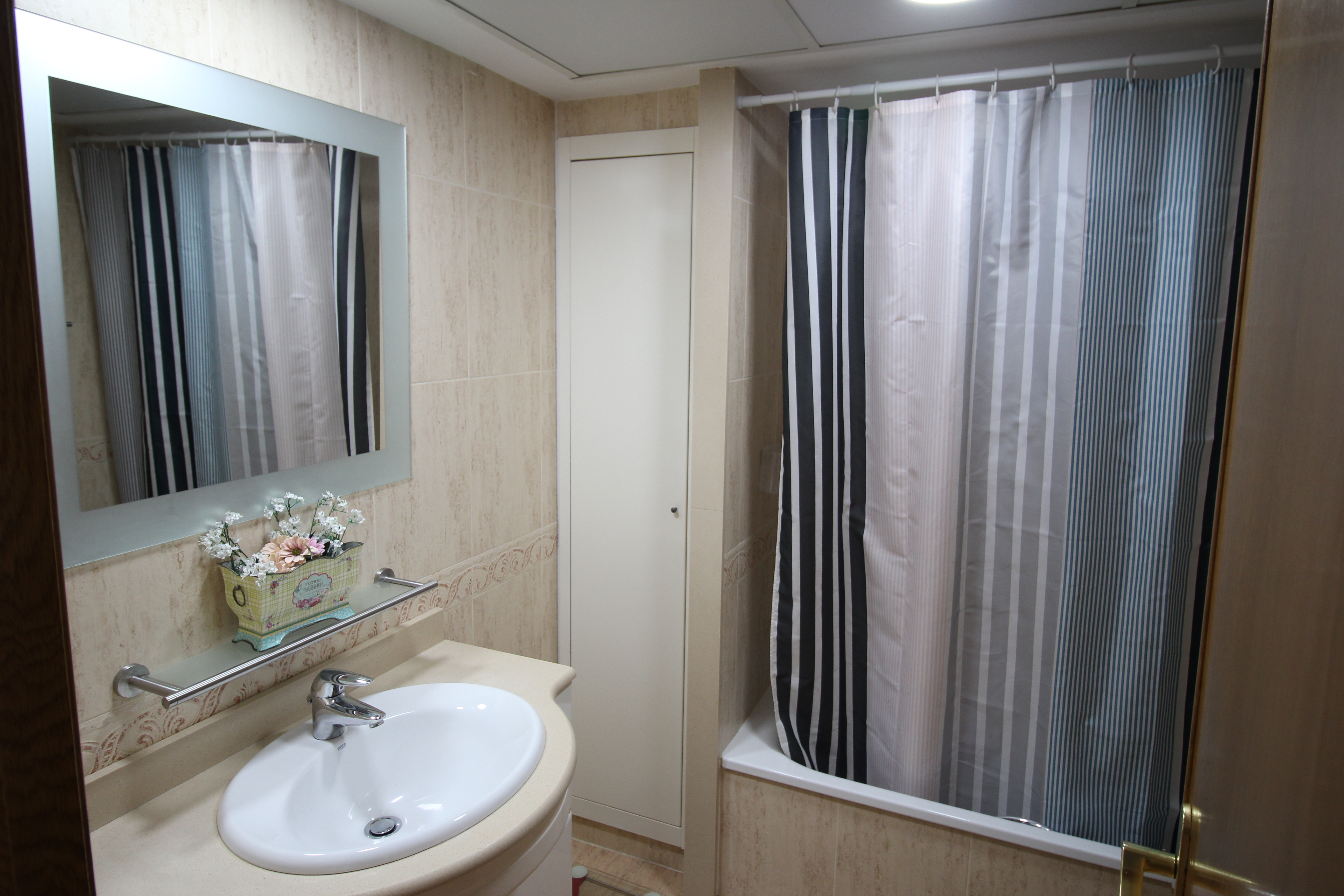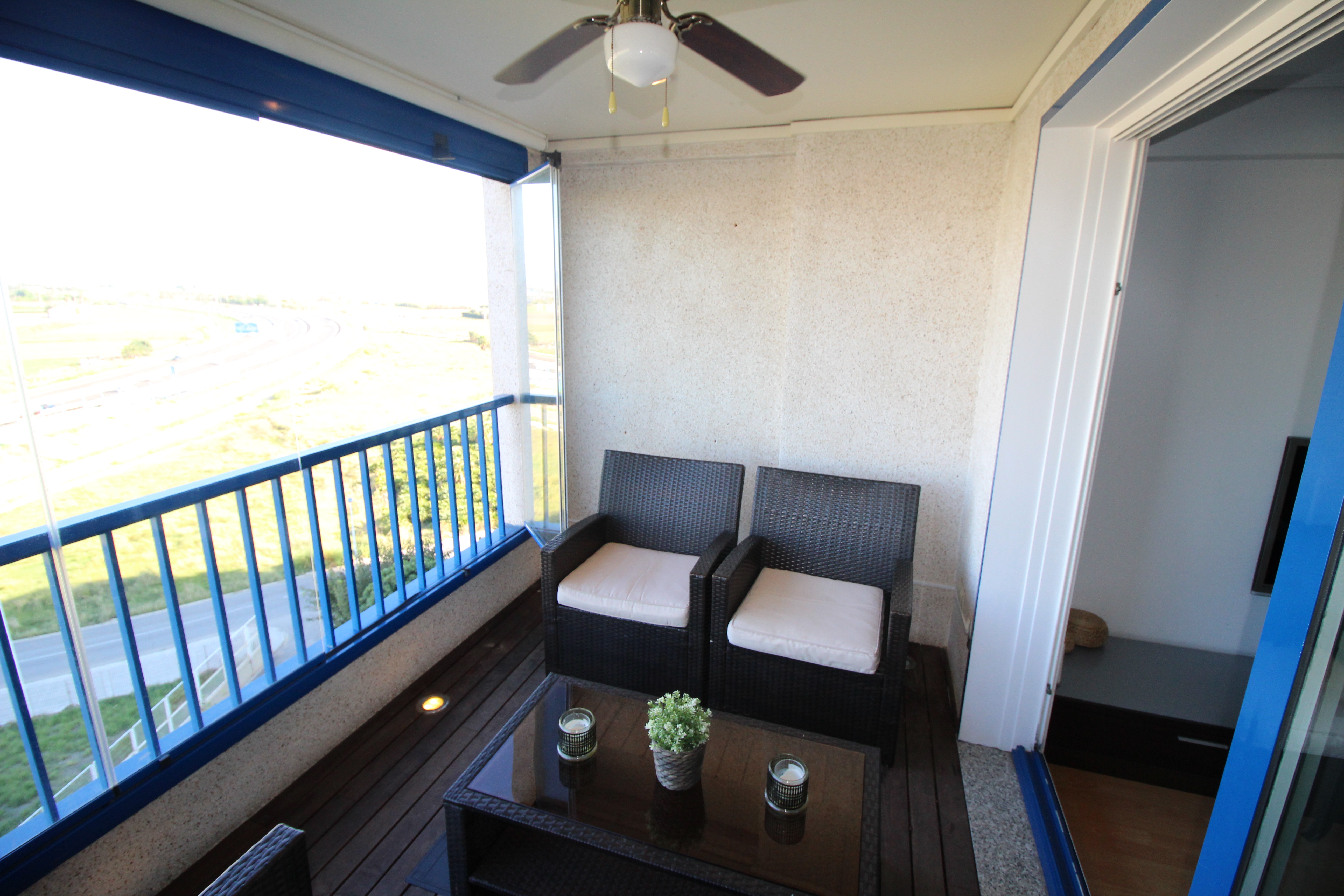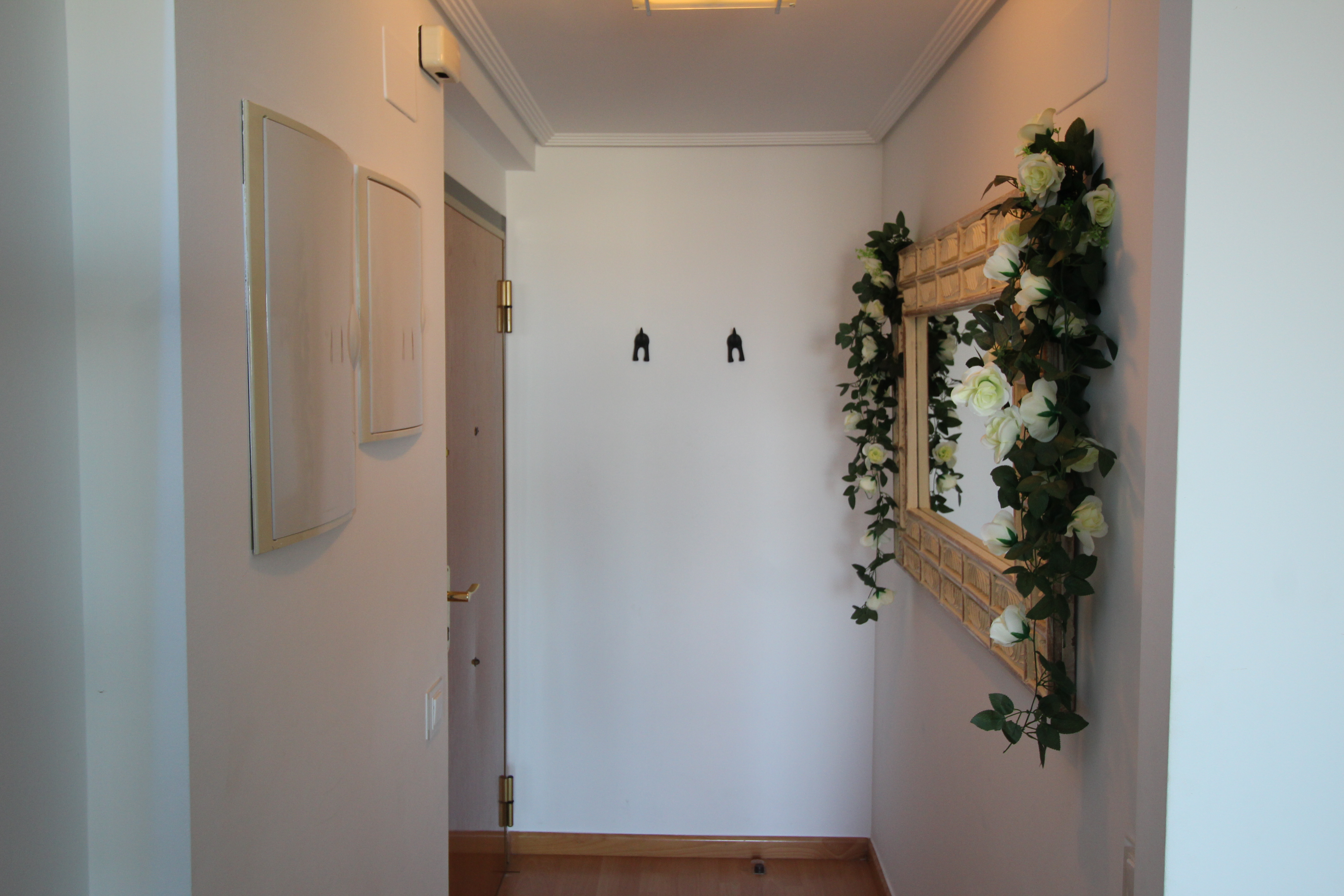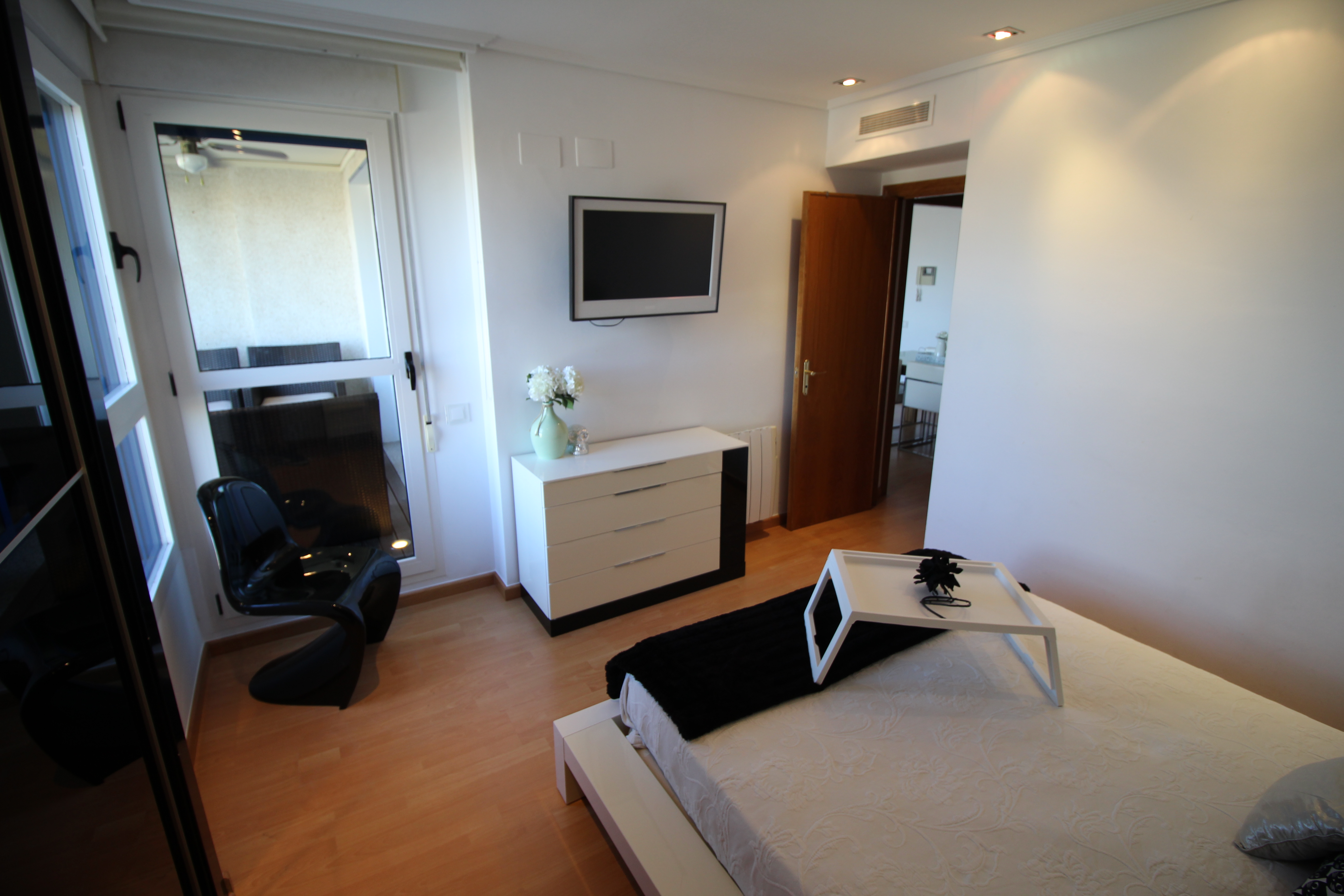 Når du kommer ind i den nordøstlig vendte to-soveværelseslejlighed på 6. etage, kommer du ind i en lille gang, der fører op til en stor, rummelig stue. Til venstre for stuen finder man et komplet køkken, som fører til et åbent vaskeområde med vaskemaskine og tørretumbler på den anden side. Køkkenet har gaskomfur, ovn, mikroovn, 2 håndvaske og opvaskemaskine. Går vi tilbage til stuen, beligger der sig en lille, hyggelig, oplyst 10 m2 terrasse på højre hånd. Terrassen byder på en smuk udsigt over bjergene, der kolliderer med havet, når man ser mod øst. Mellem køkkenet og terrassen forbinder en anden lille gang de 2 soveværelser og badeværelset med stuen. Det store soveværelse har indbyggede skabe i væggen, direkte adgang til terrassen og en luksuriøs dobbeltseng.