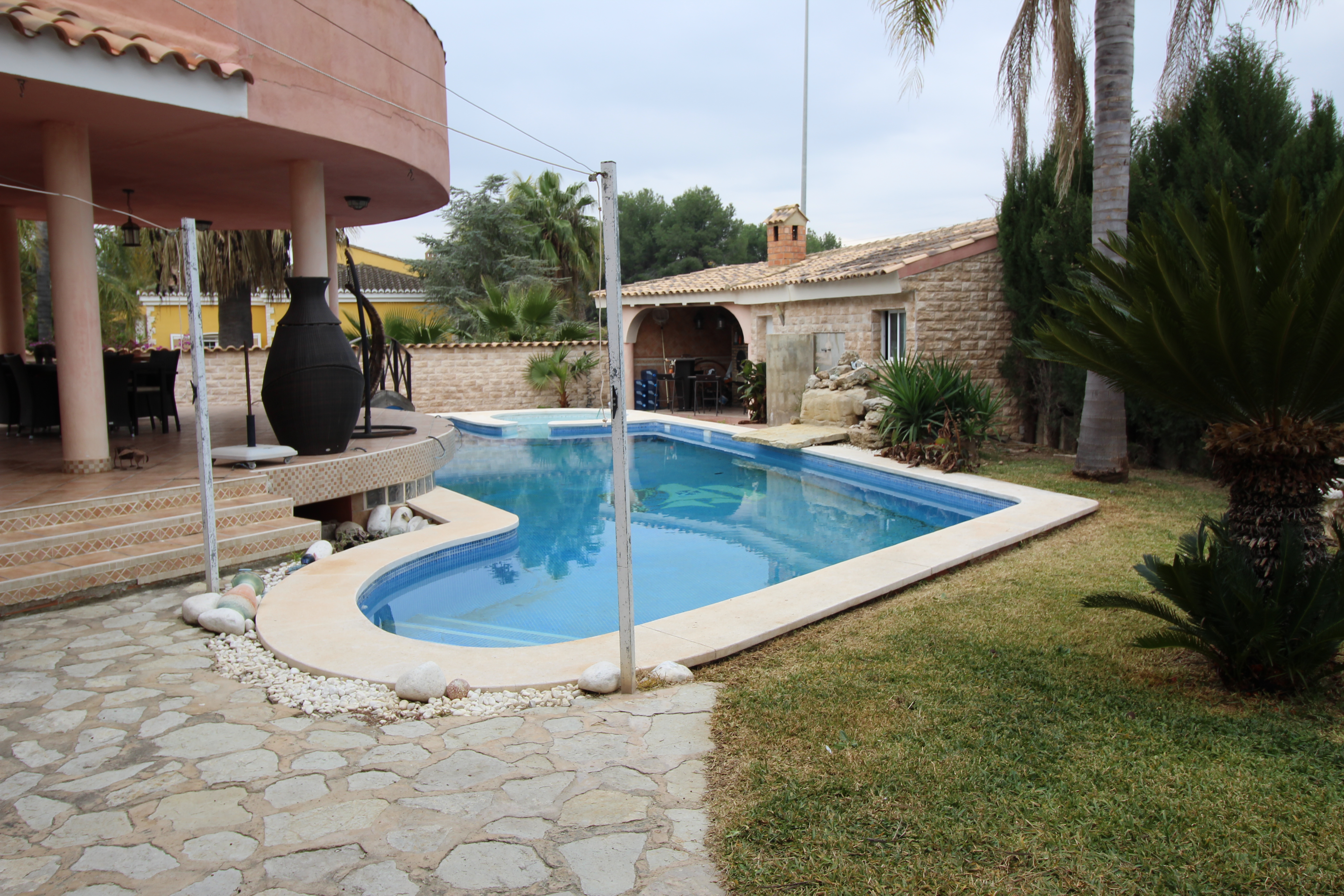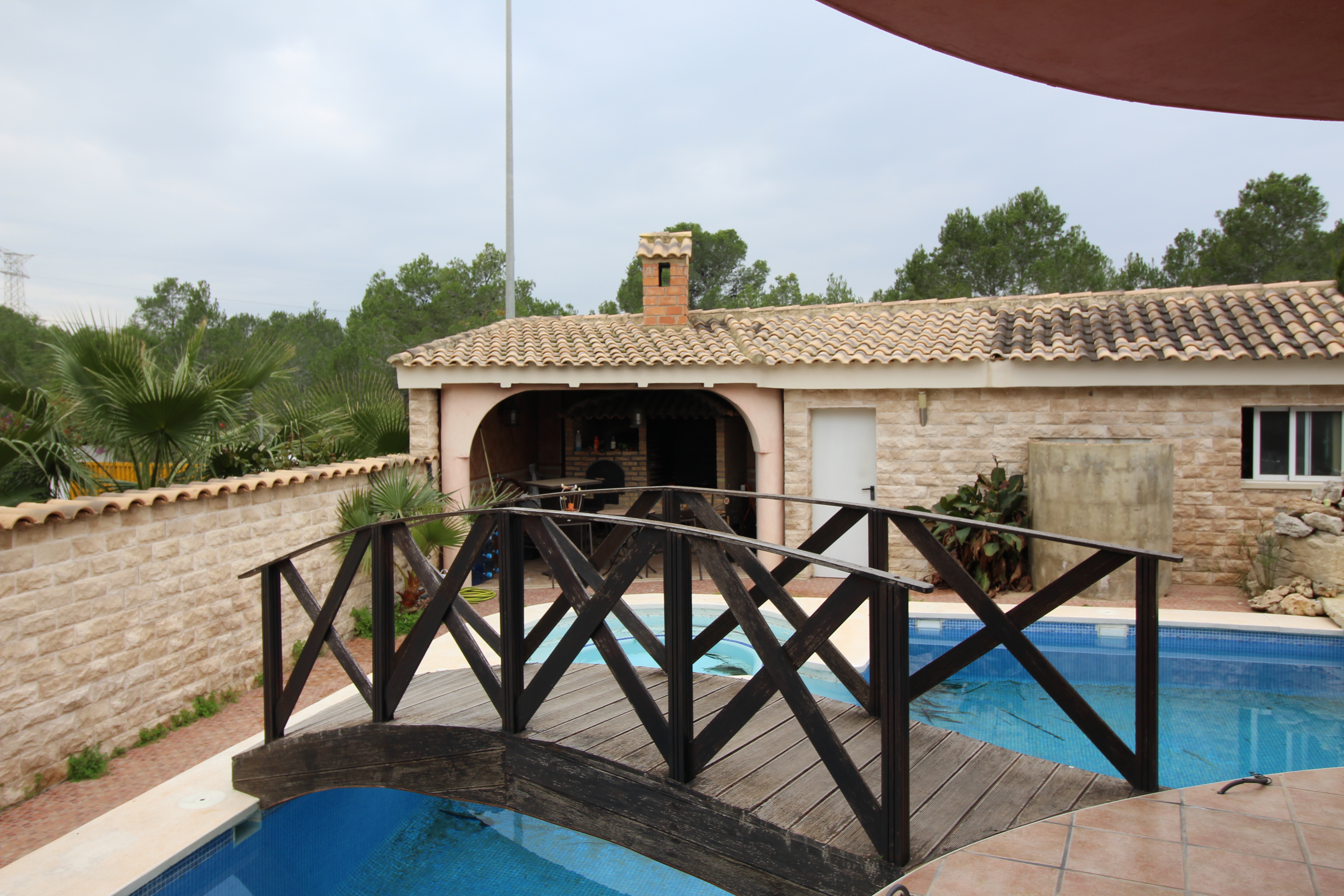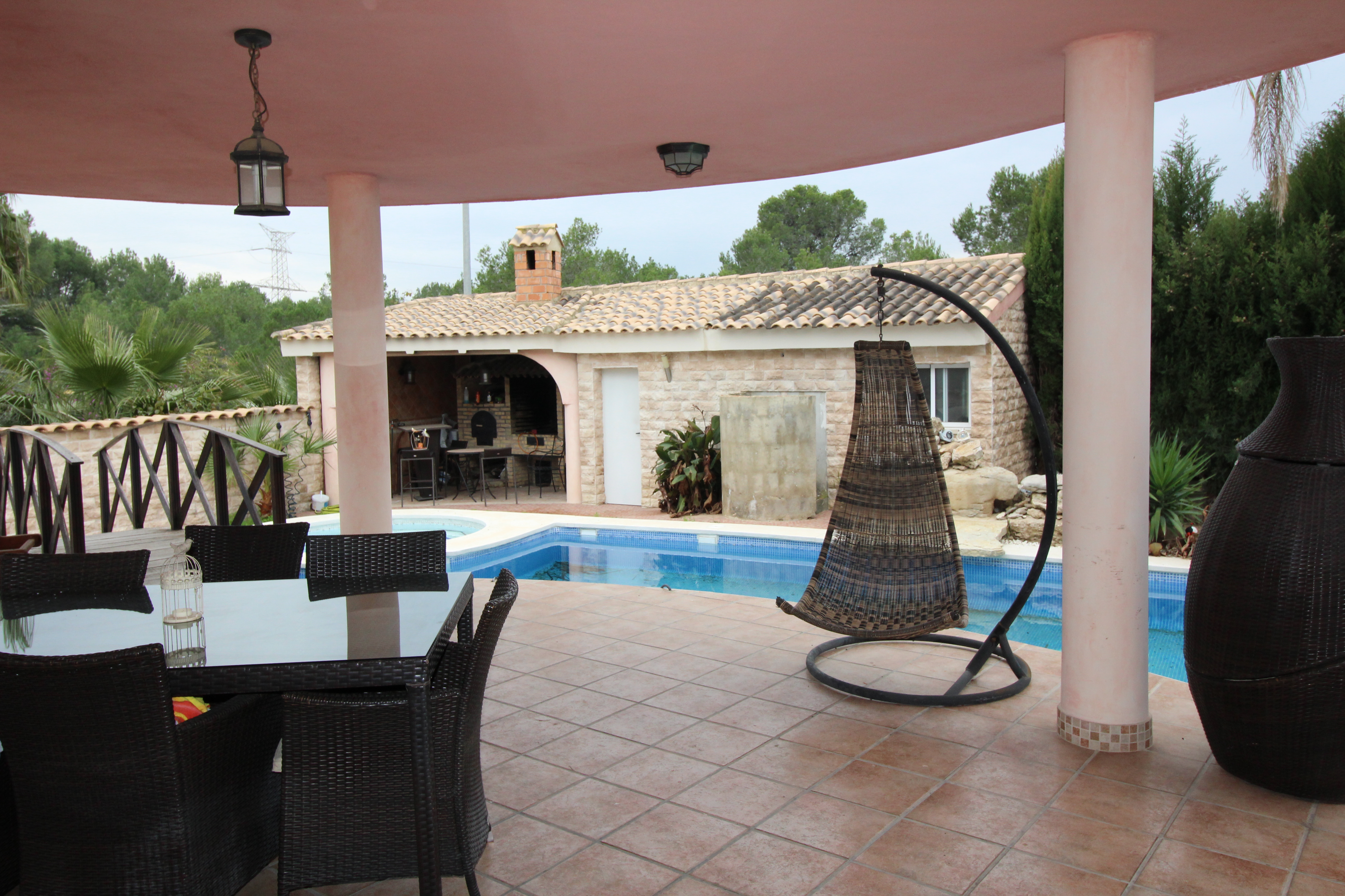 Villa i bakkerne ved San Antonio de Benageber. Rart område for naturparken, der omgiver det. Haven er på 900m2 med palmer, swimmingpool med jacuzzi og vandfald. Paellero, grill, maurisk ovn. Toilet og udendørs bruser.