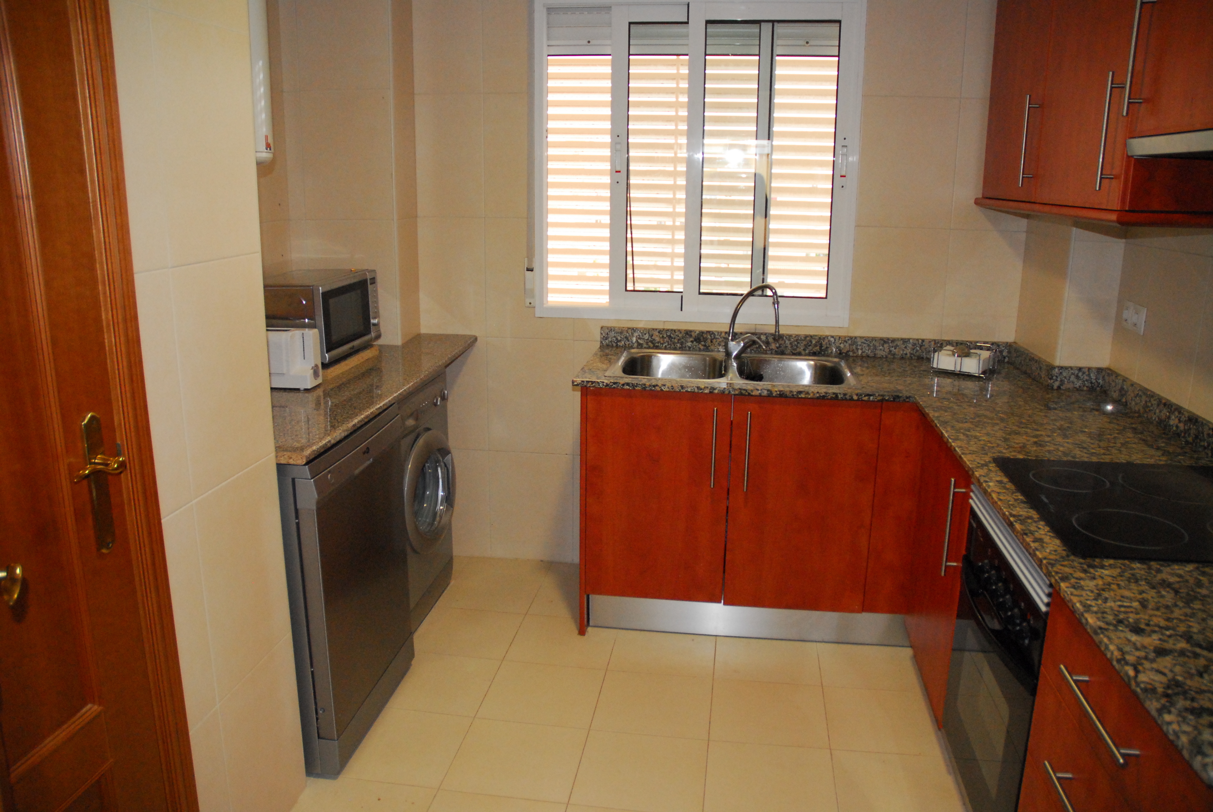 Separat køkken udstyret med: opvaskemaskine, vaskemaskine, mikroovn, køleskab, keramisk kogeplade og ovn.