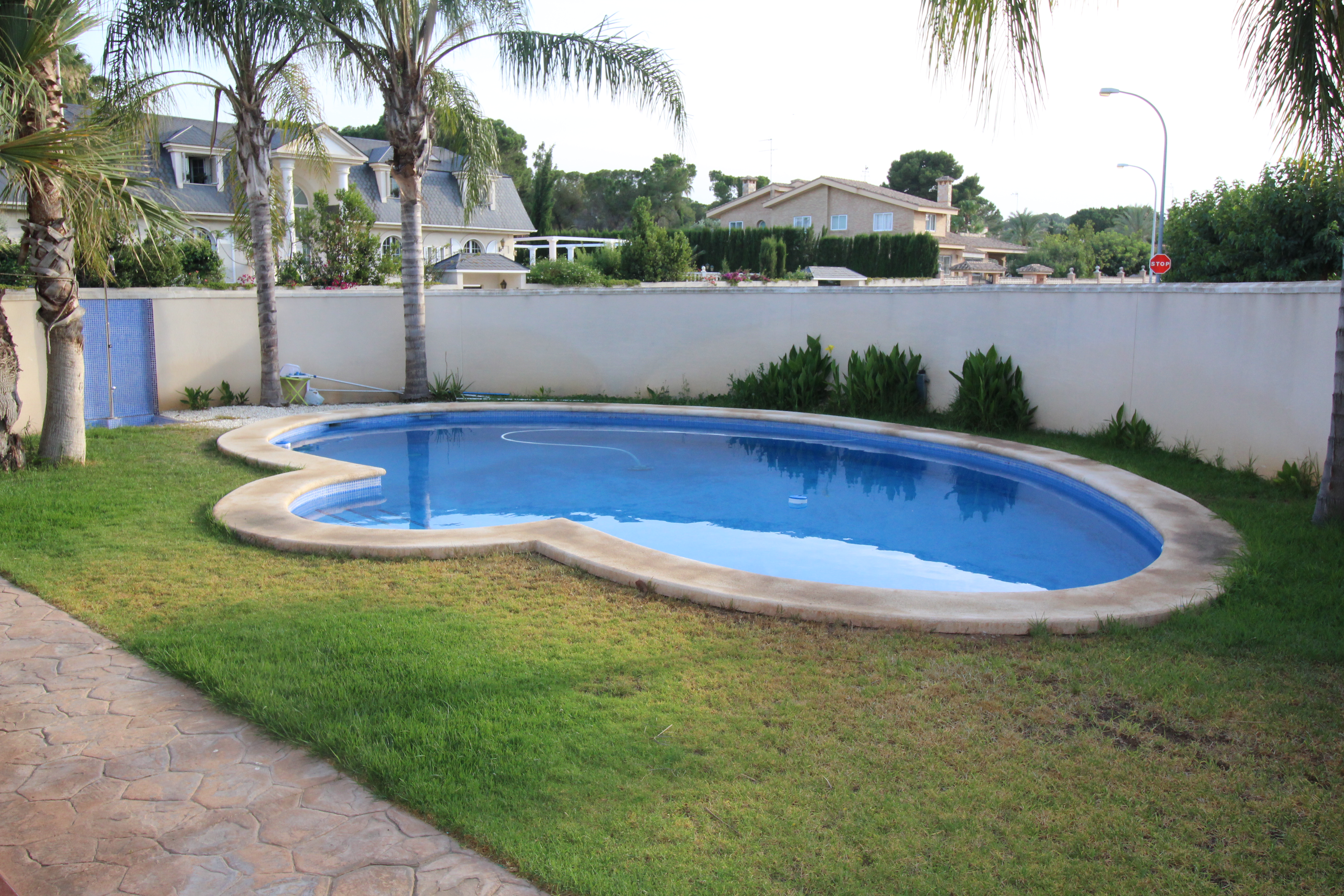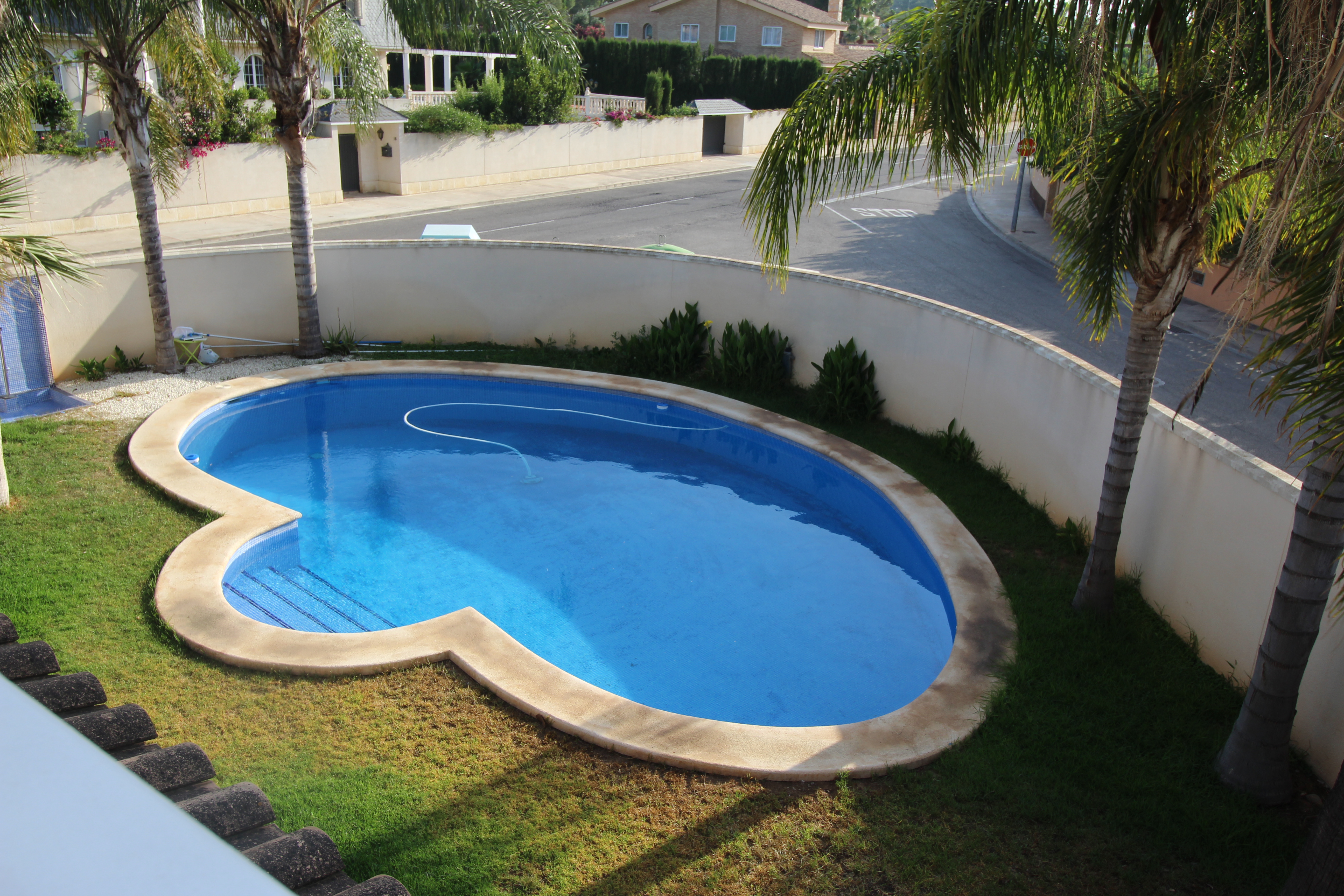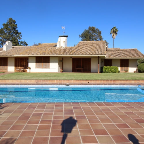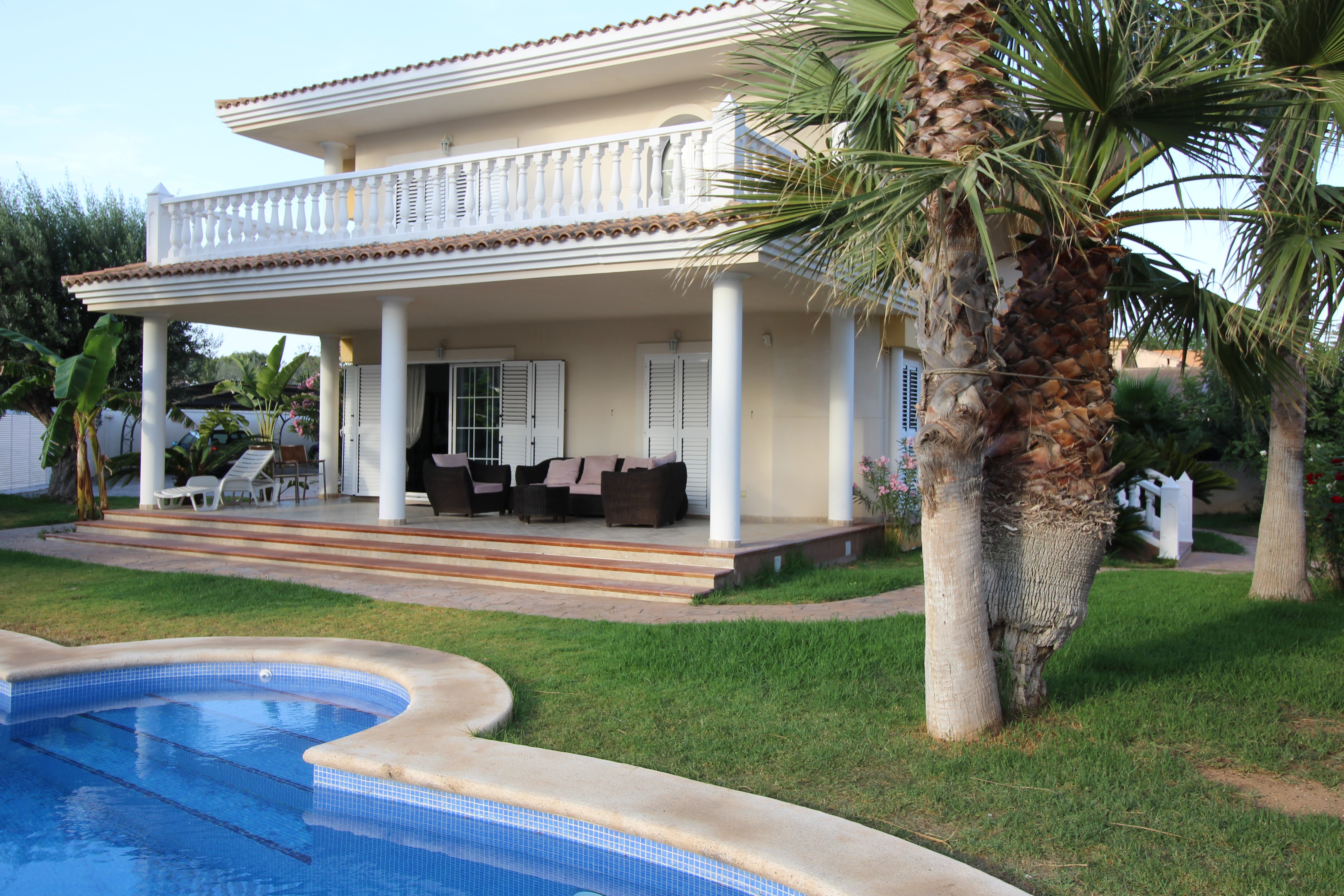 Dejlig pool med græs omkring og som kan nydes fra en af de overdækkede terrasser