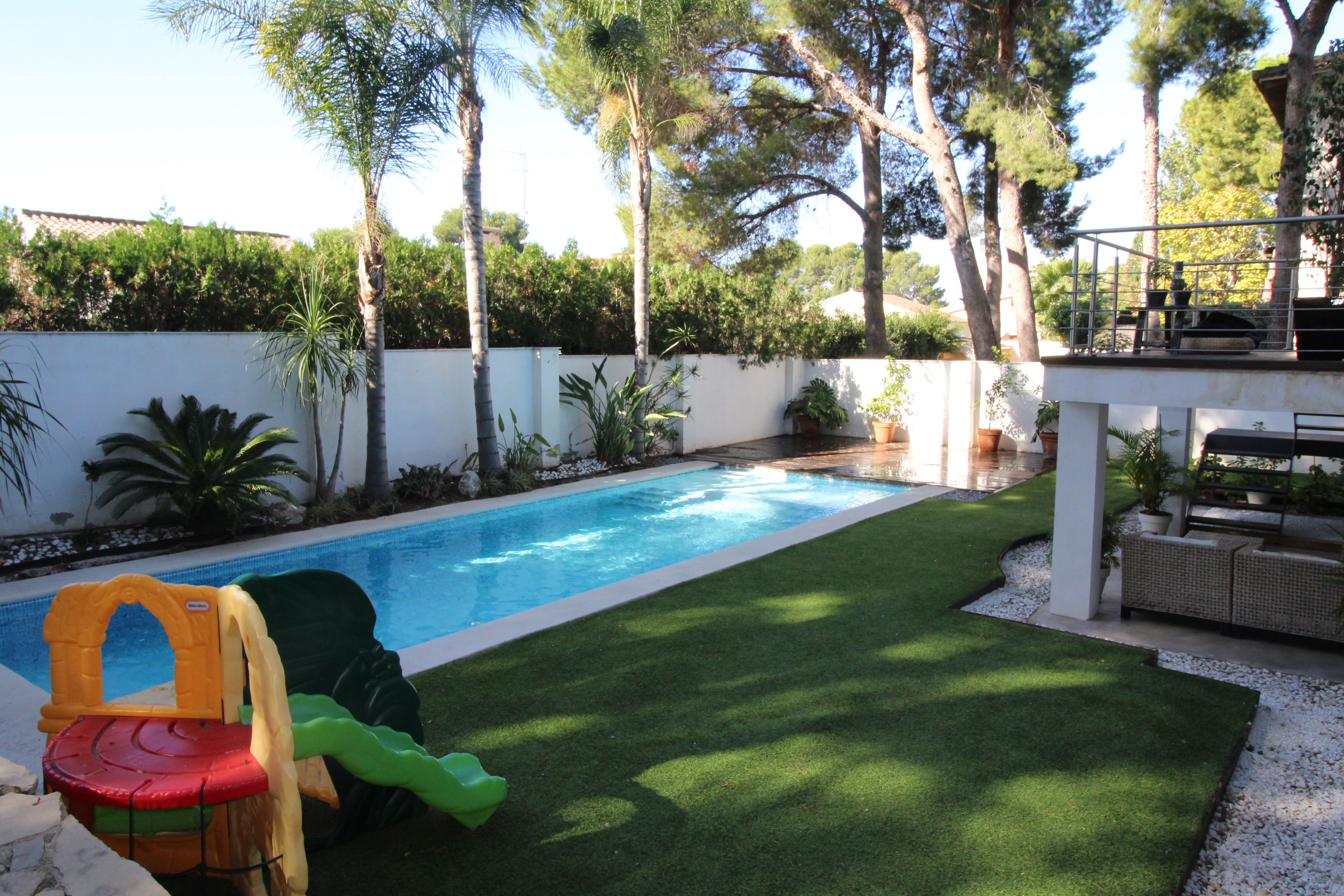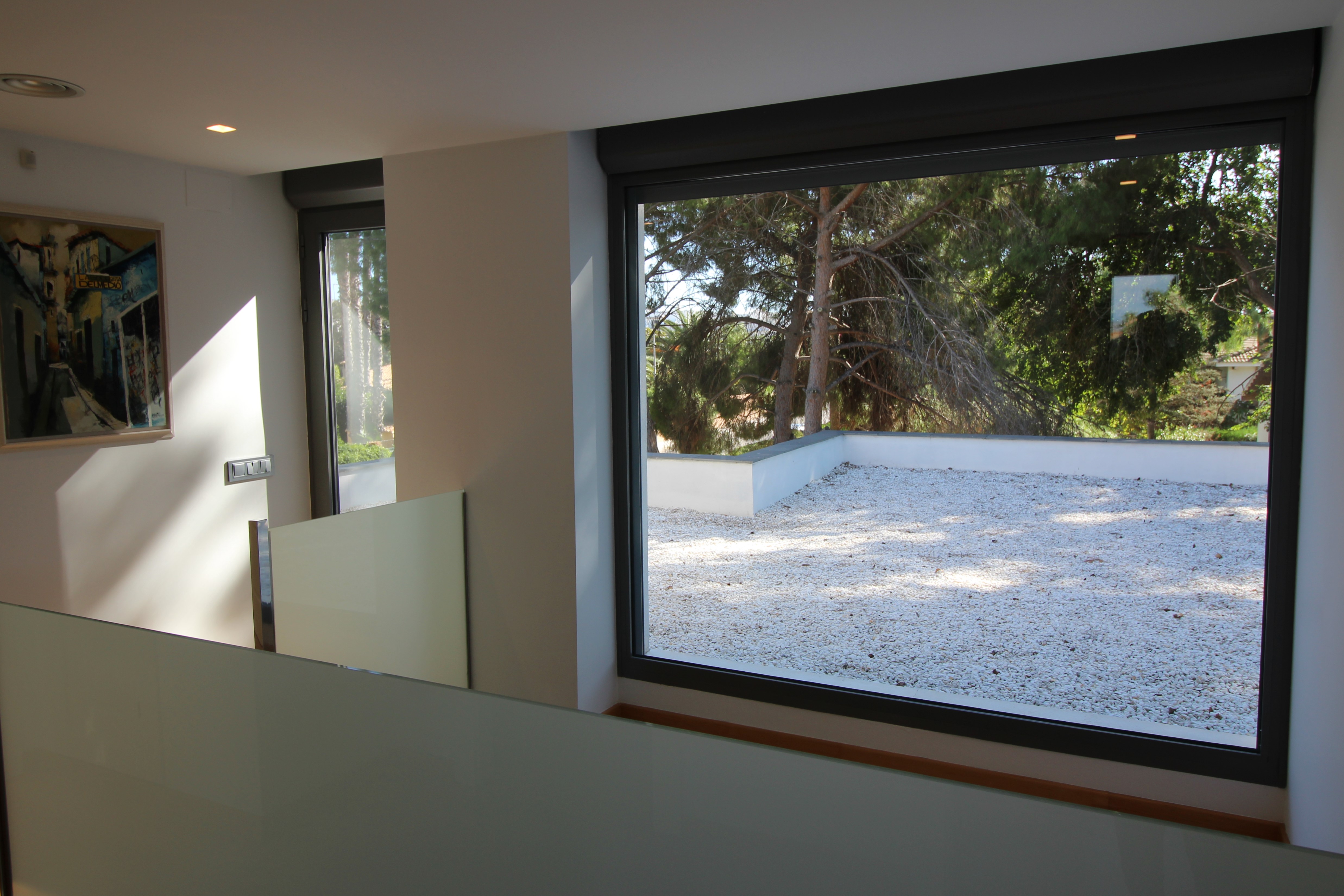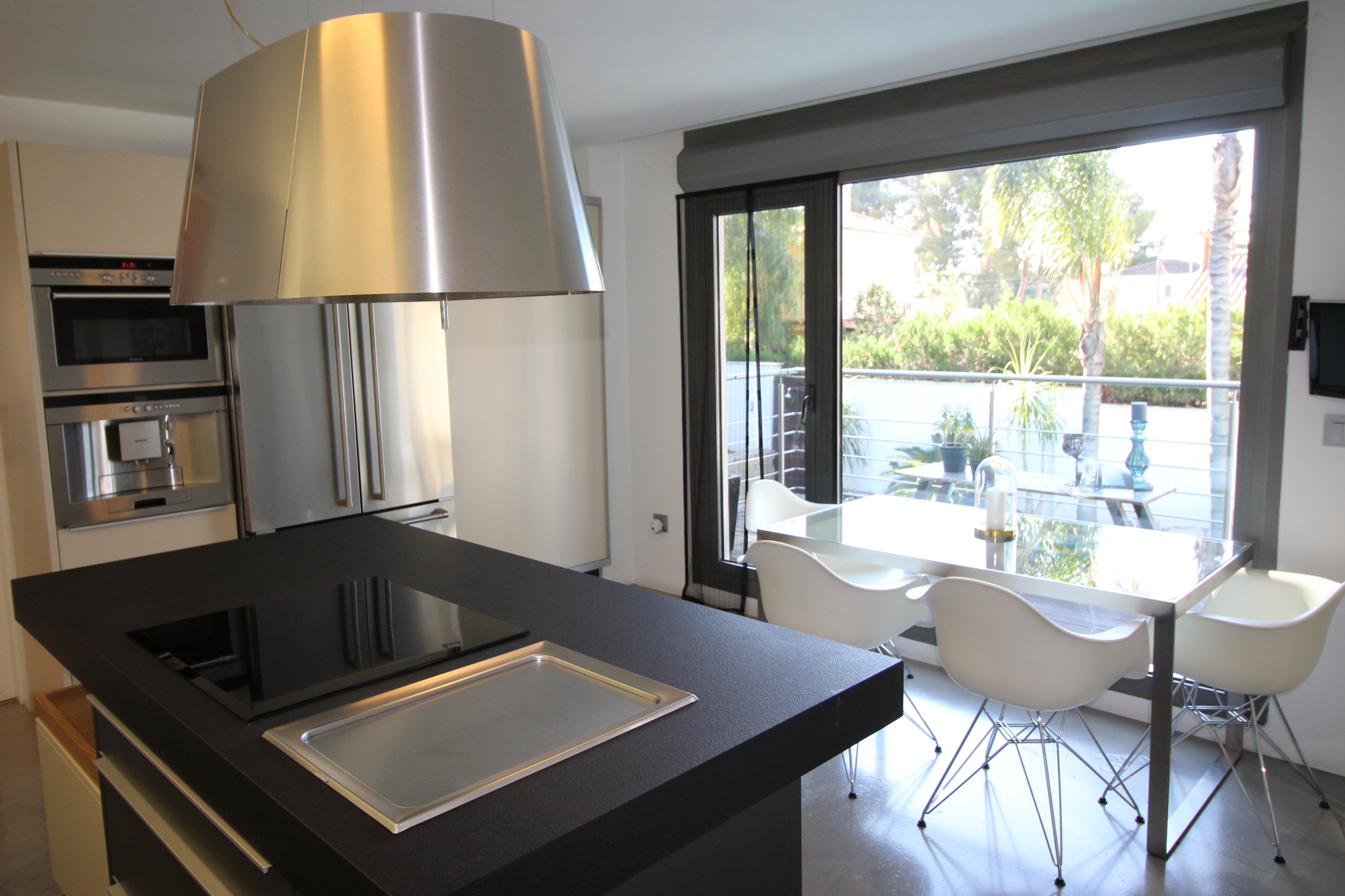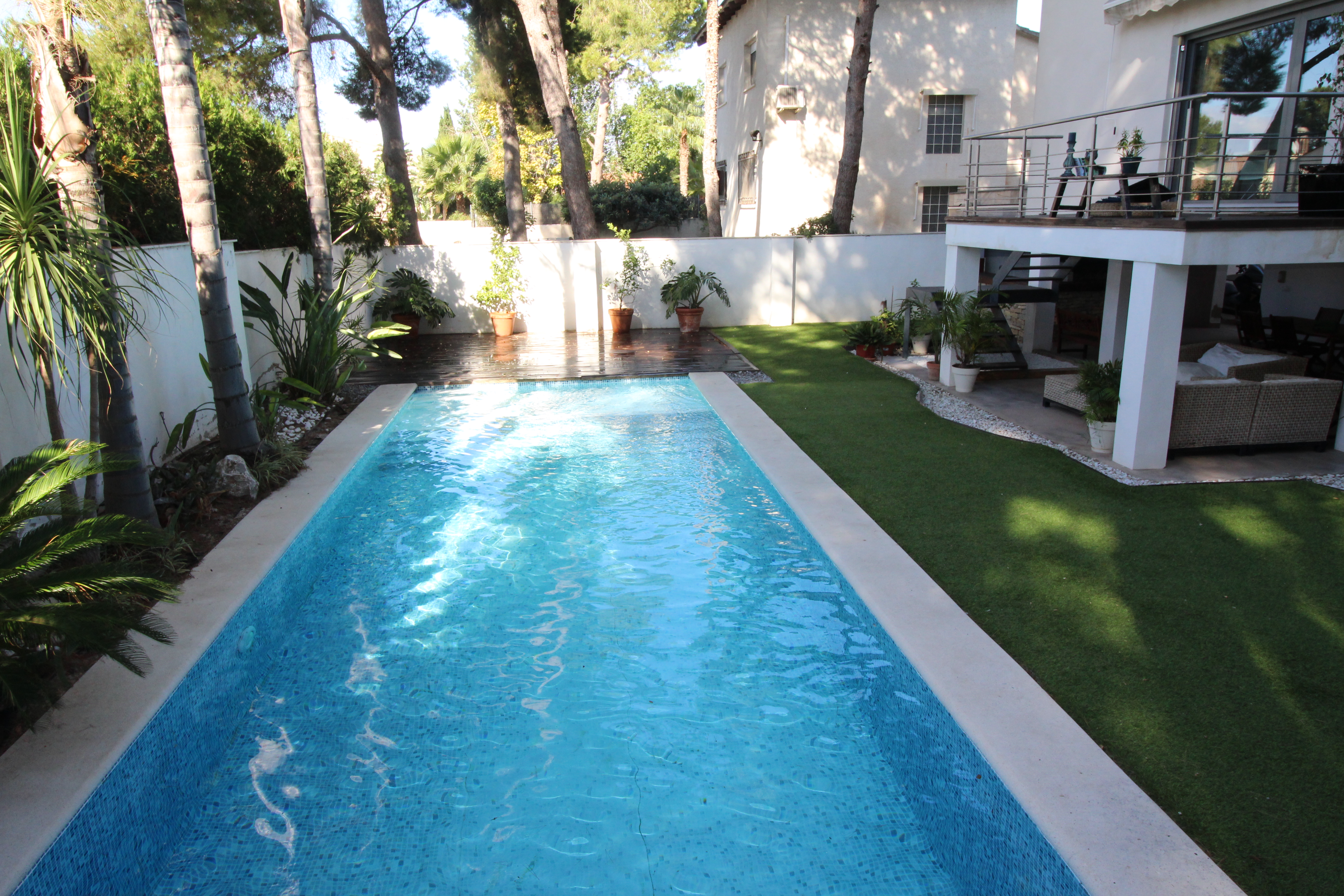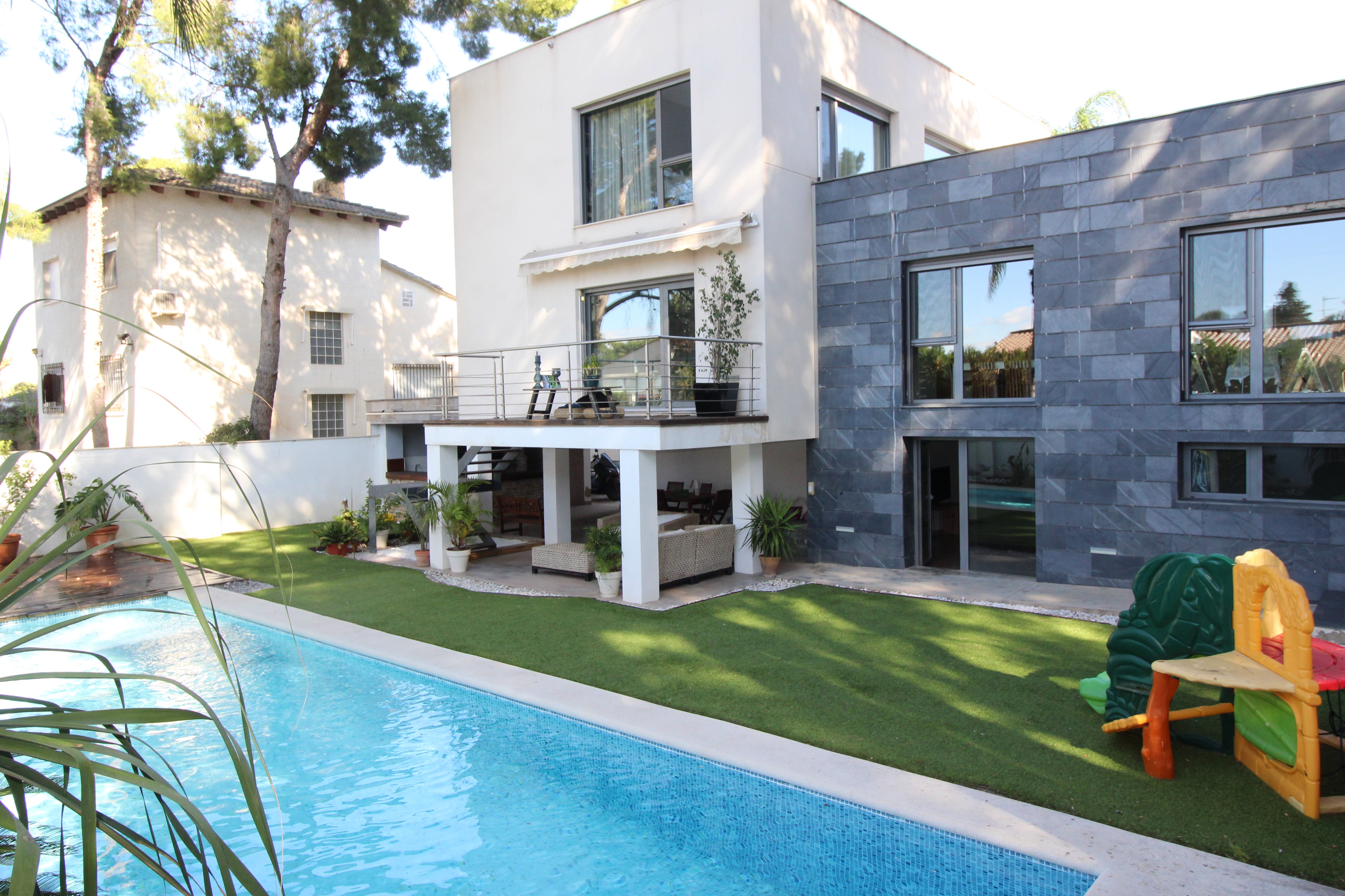 I La Eliana ligger denne storslåede luksusvilla i moderne stil spækket med den nyeste teknologi. Dejligt lyst og rummeligt. Designerkøkken af mærket Poggenpohl med højeste kvalitet inden for teknologi, design og funktionalitet. Invani Philip Starck-toiletter med fantastisk kombination af design og funktionalitet. Elektriske sikkerhedsskodder/persienner. Vinduer med dobbelt sikkerhedsglas. En villa med mange indbyggede skabe. Aircondition og central gasvarme. Husets gulve er mikrocement i køkken, parket af naturtræ inde i huset og på udendørs terrasser af teaktræ.