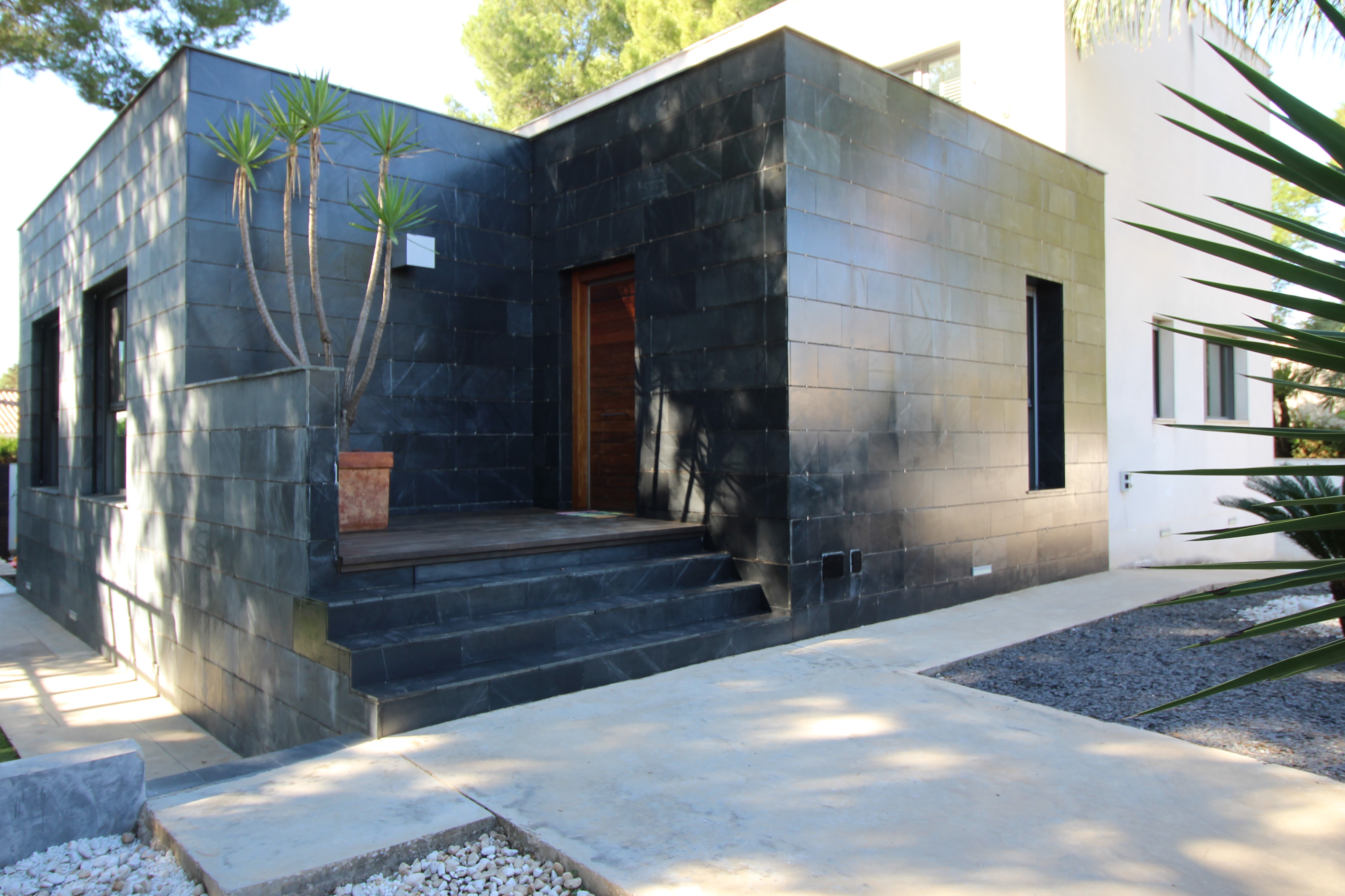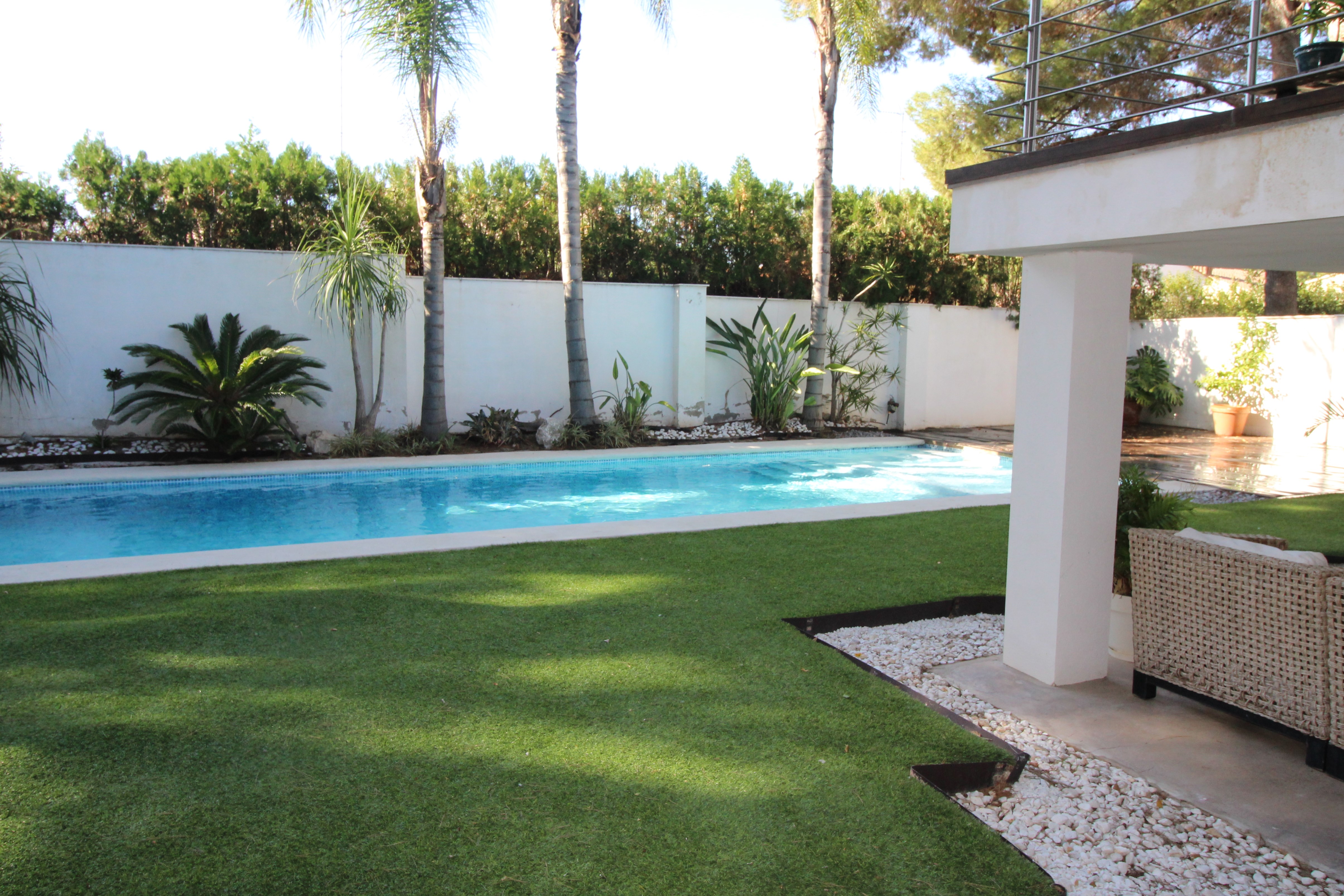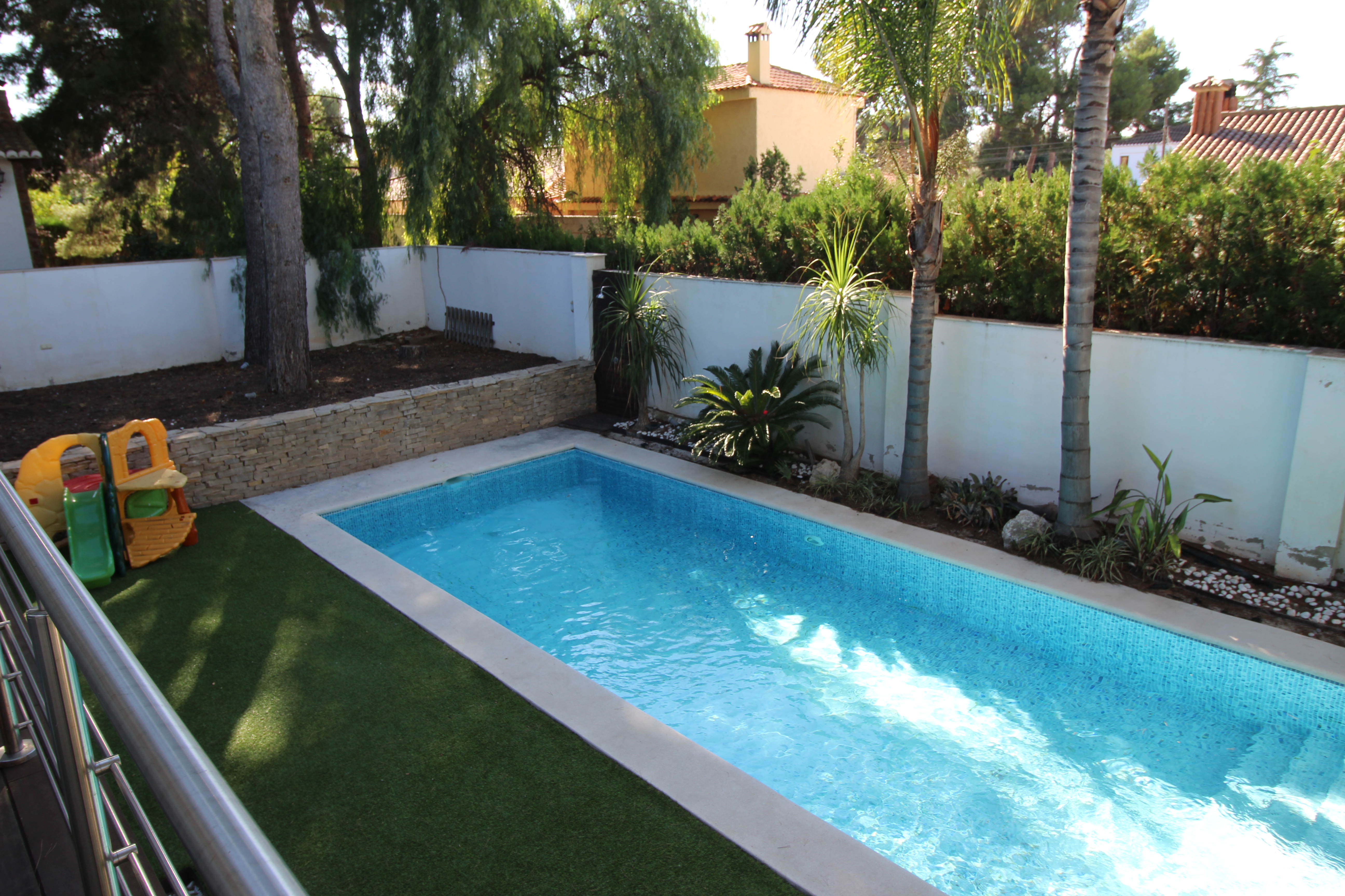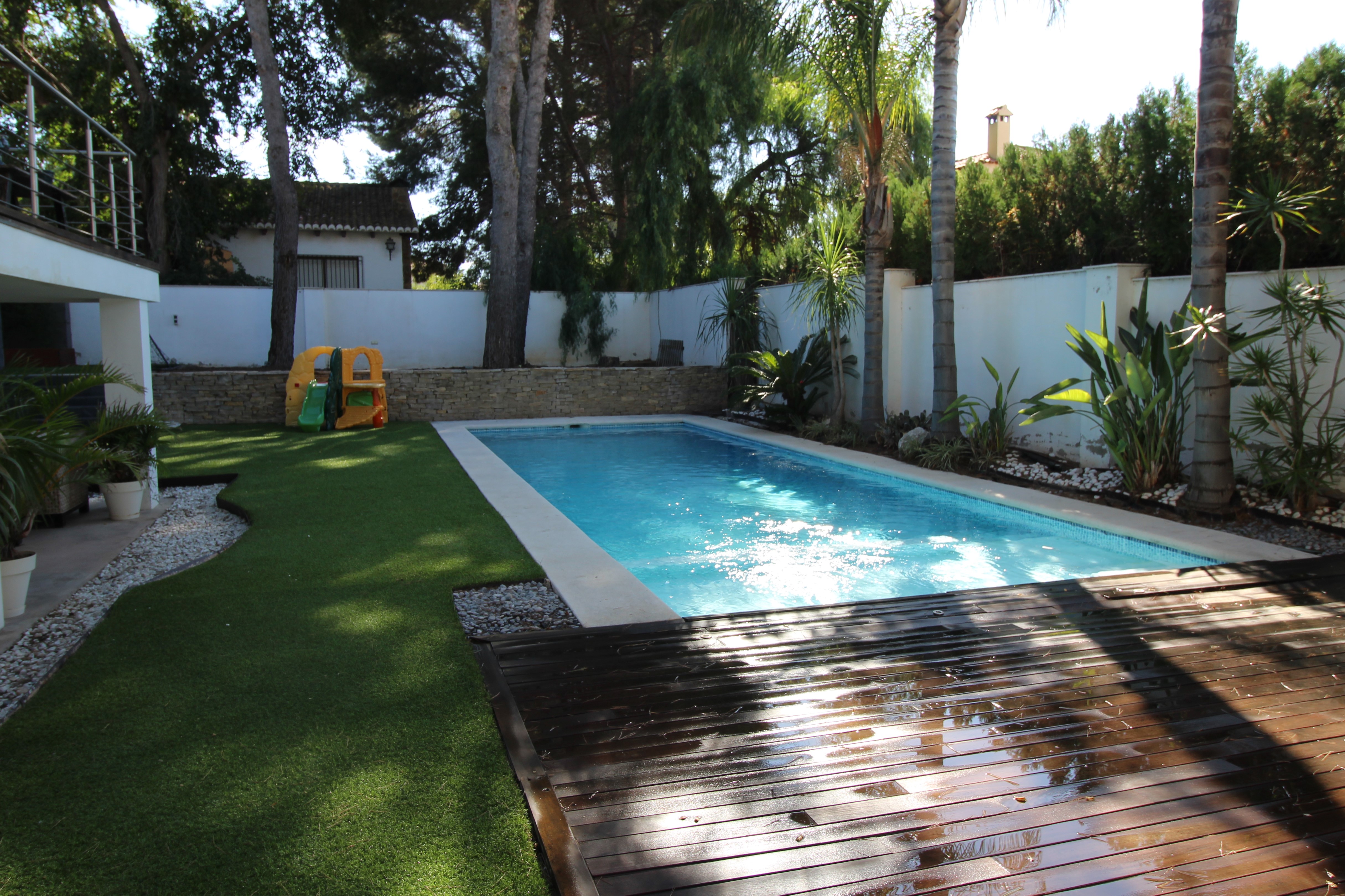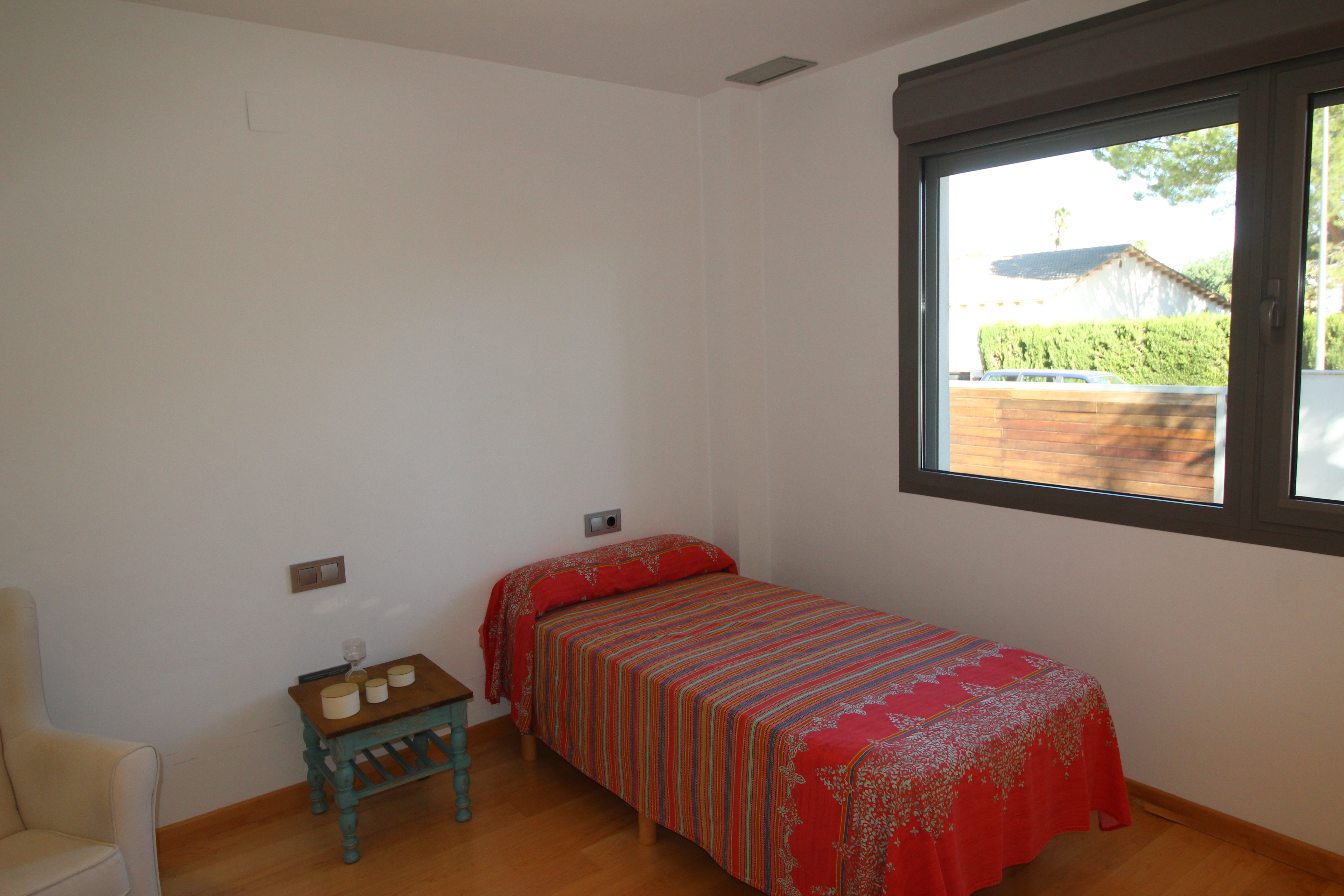 I La Eliana ligger denne storslåede luksusvilla i moderne stil spækket med den nyeste teknologi. Dejligt lyst og rummeligt. Designerkøkken af mærket Poggenpohl med højeste kvalitet inden for teknologi, design og funktionalitet. Invani Philip Starck-toiletter med fantastisk kombination af design og funktionalitet. Elektriske sikkerhedsskodder/persienner. Vinduer med dobbelt sikkerhedsglas. En villa med mange indbyggede skabe. Aircondition og central gasvarme. Husets gulve er mikrocement i køkken, parket af naturtræ inde i huset og på udendørs terrasser af teaktræ.