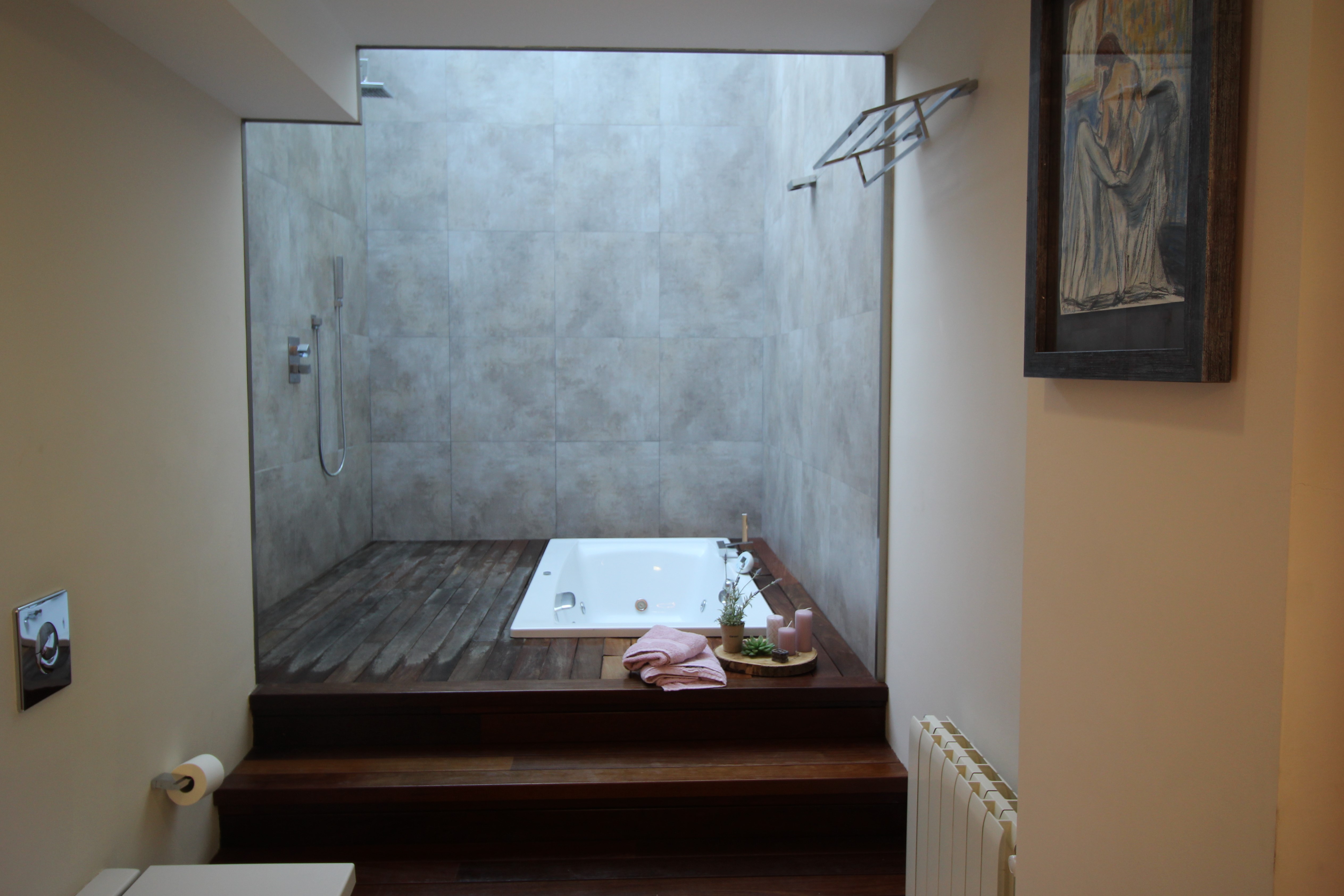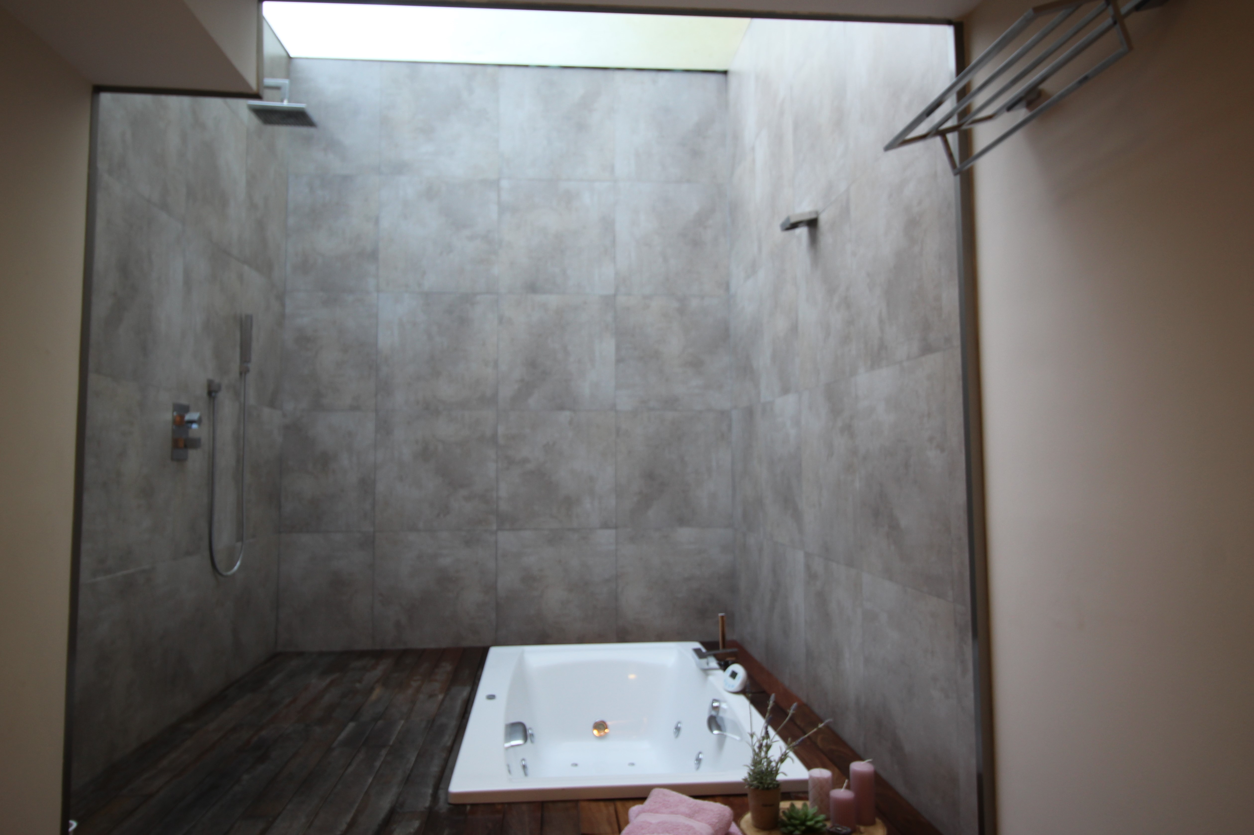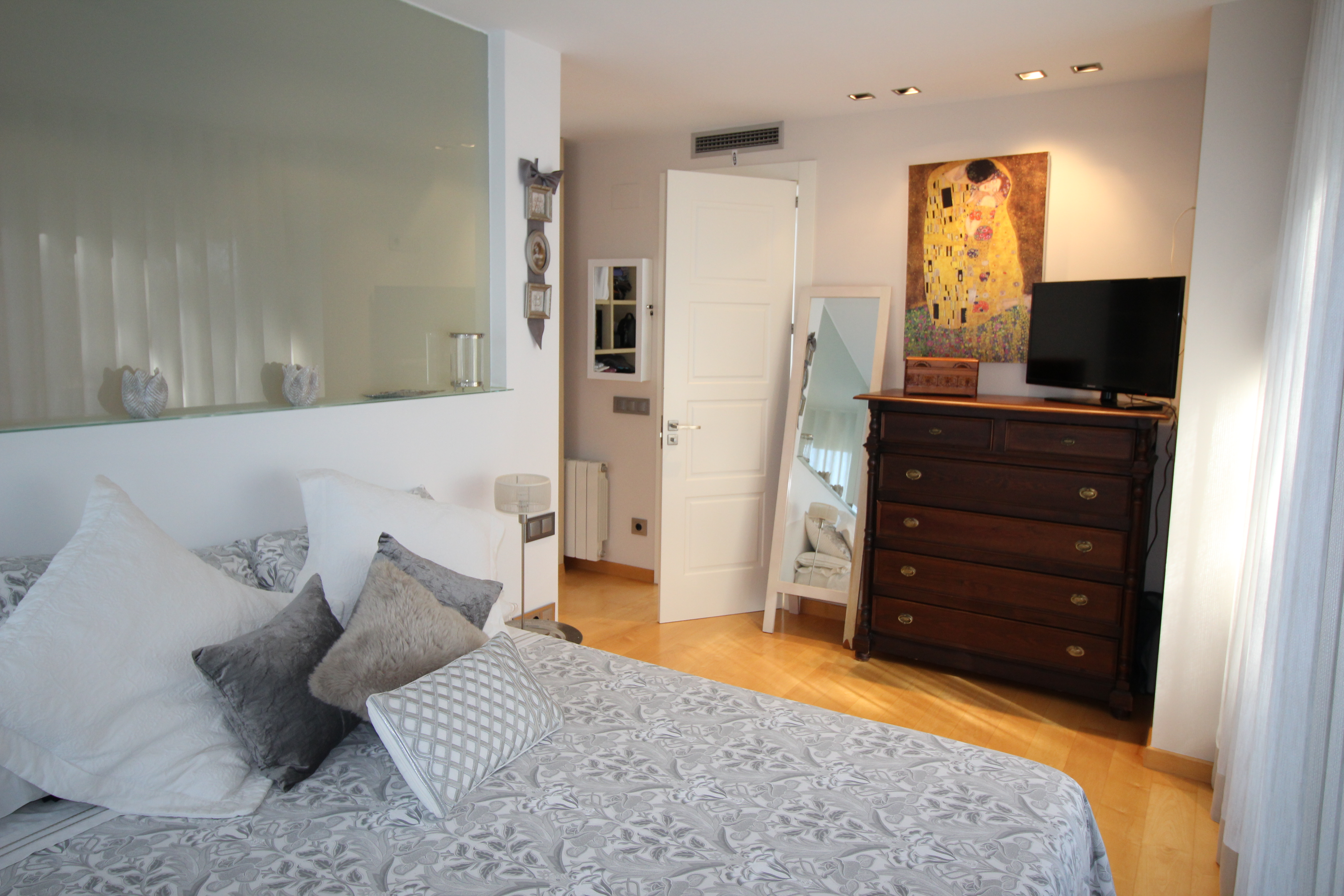 På første sal er der tre værelser; "masterbedroom", med et stort "walkin closet", to dobbeltværelser, med indbyggede skabe, et rummeligt badeværelse med jacuzzi og fantastisk ovenlysvindue.